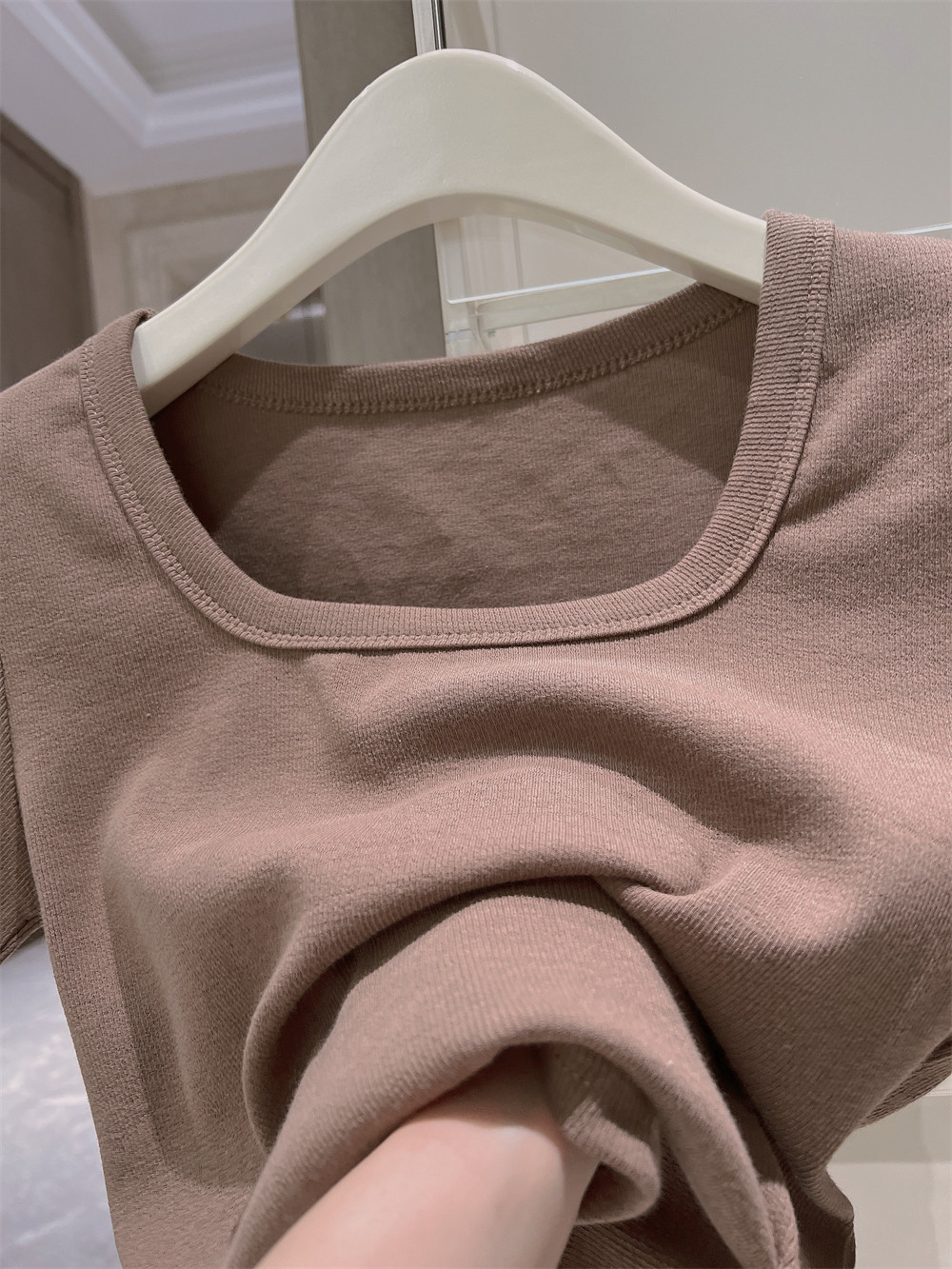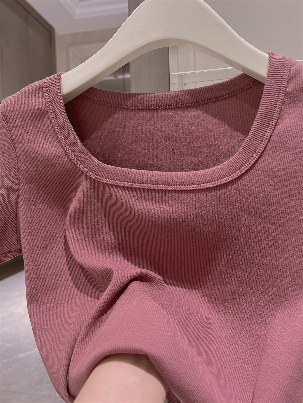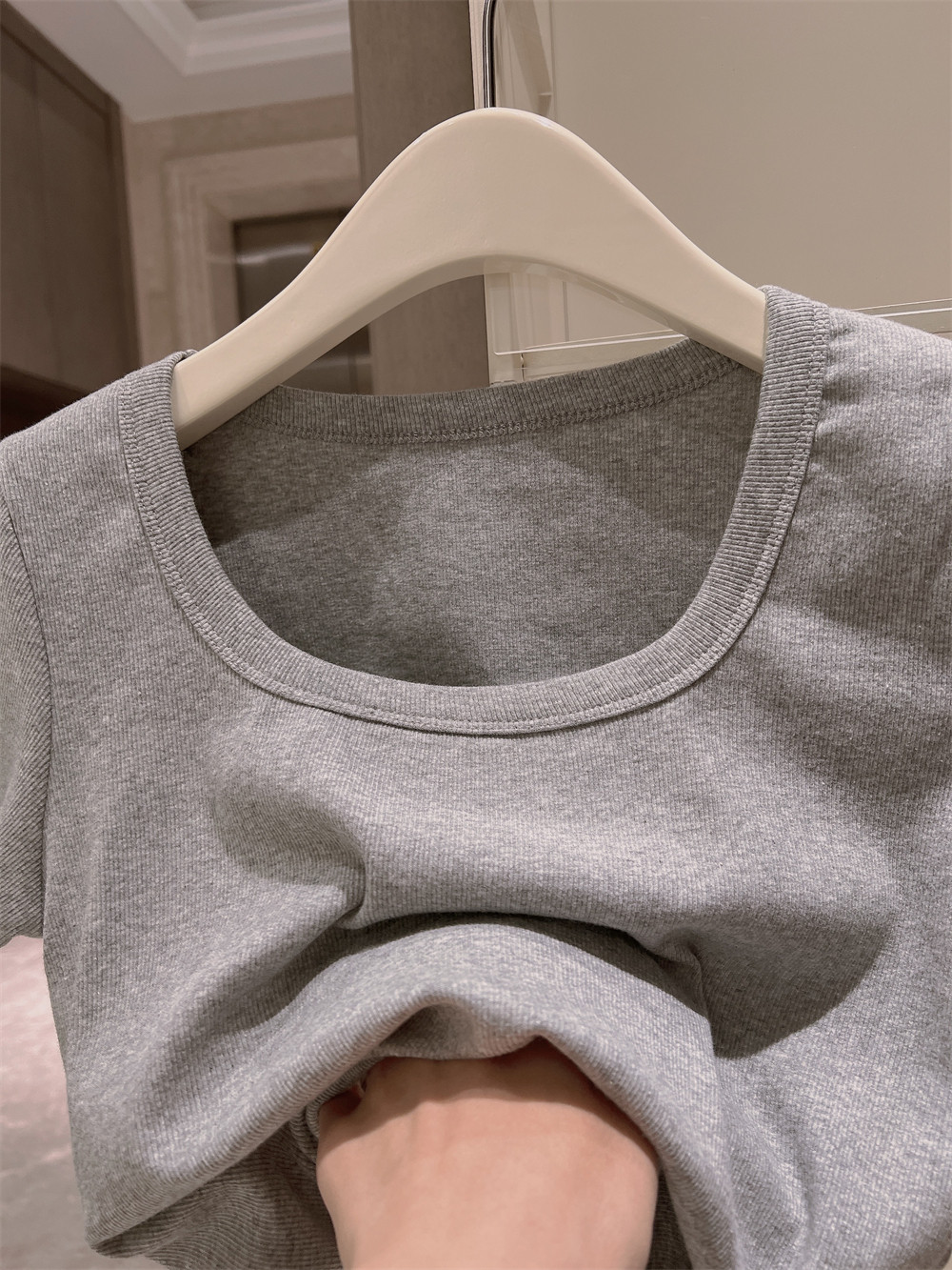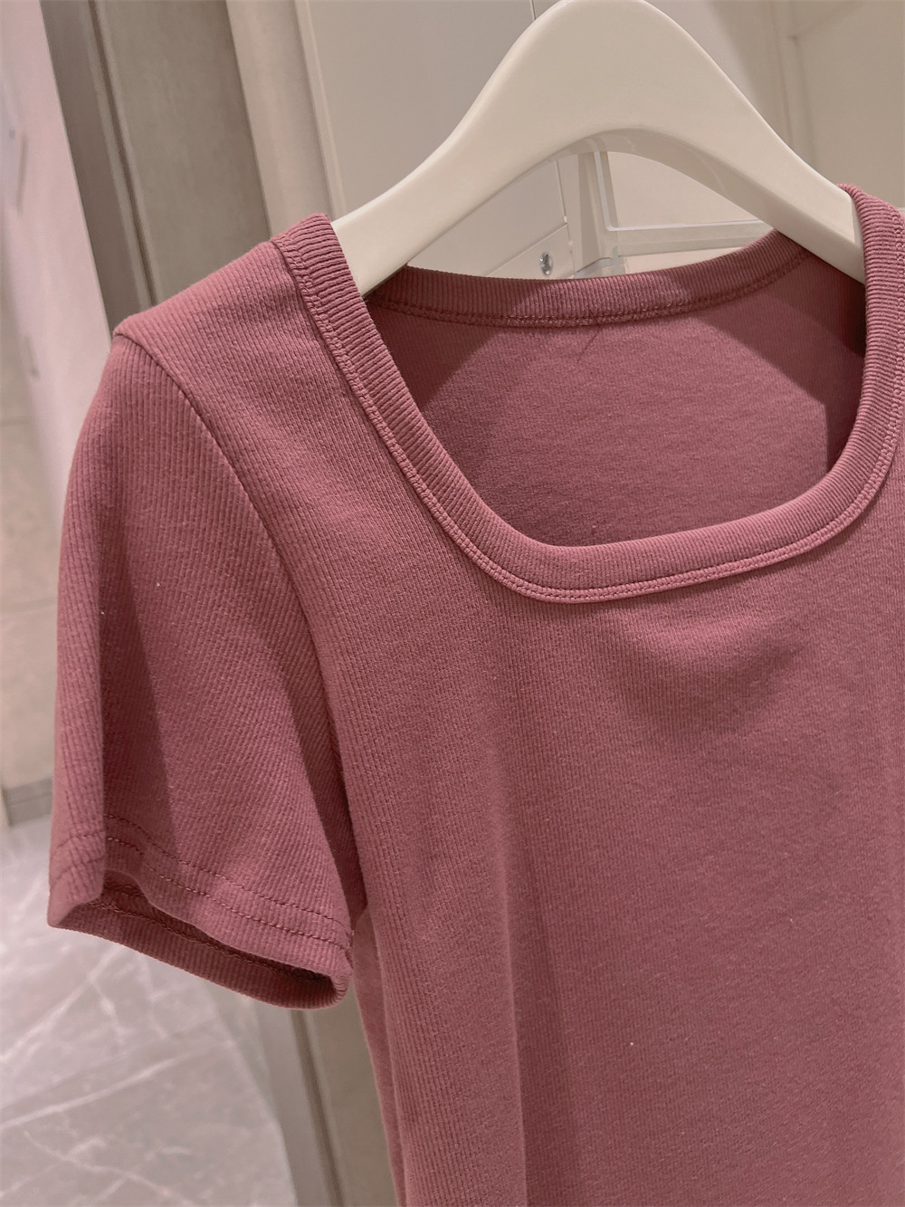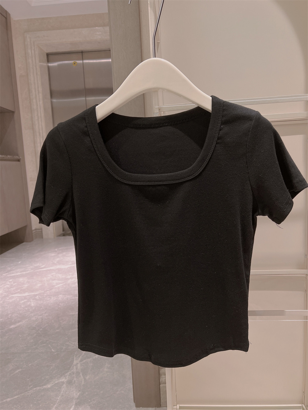 Реальный снимок◆Miss Rie ~ Футболка из чистого хлопка с открытыми правыми плечами, квадратным вырезом и современным стилем, однотонная однотонная футболка с дугообразным краем.