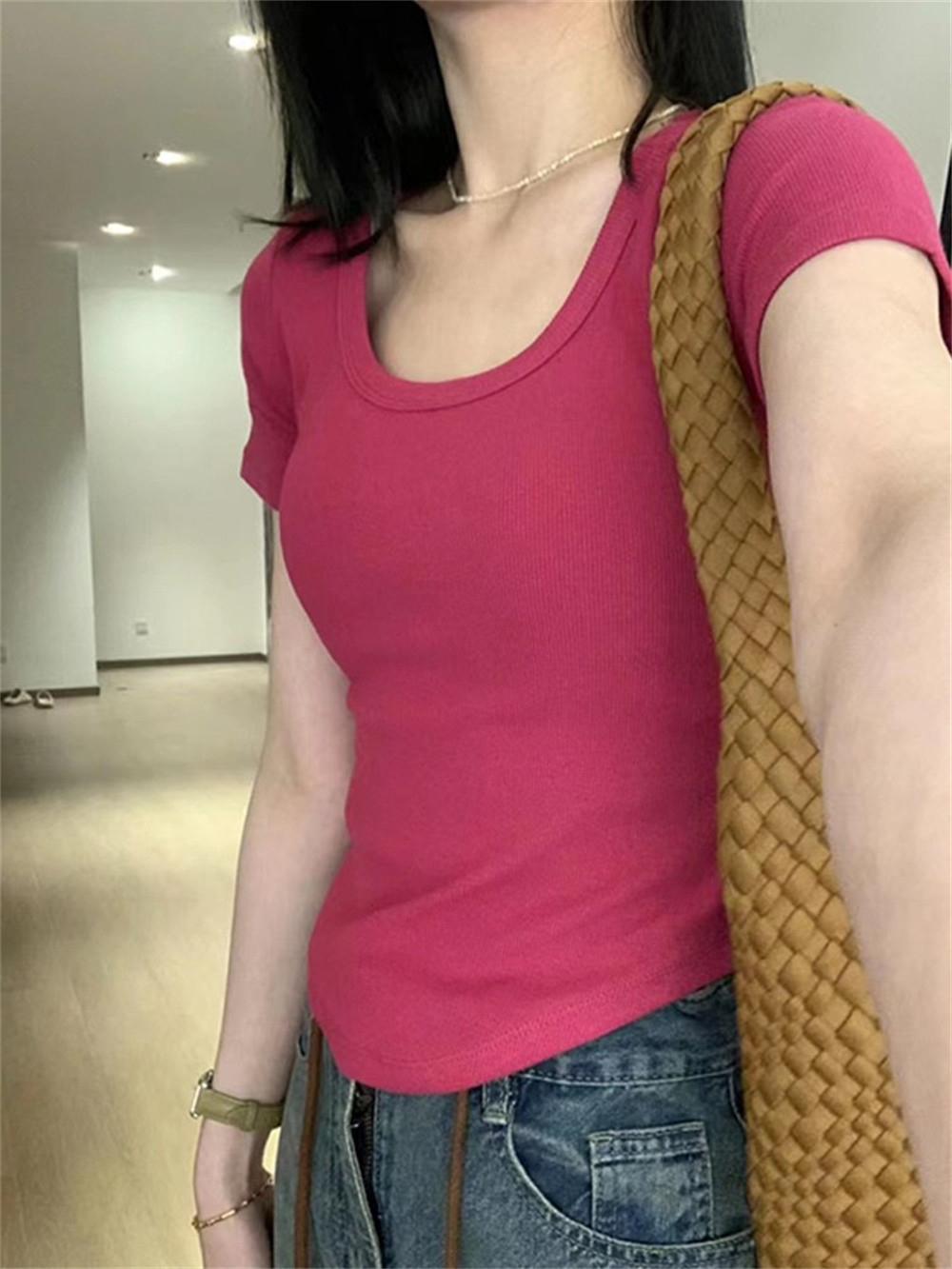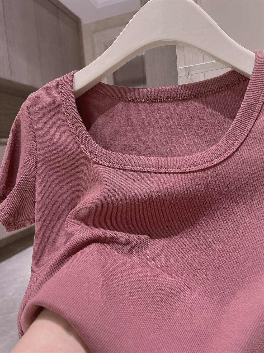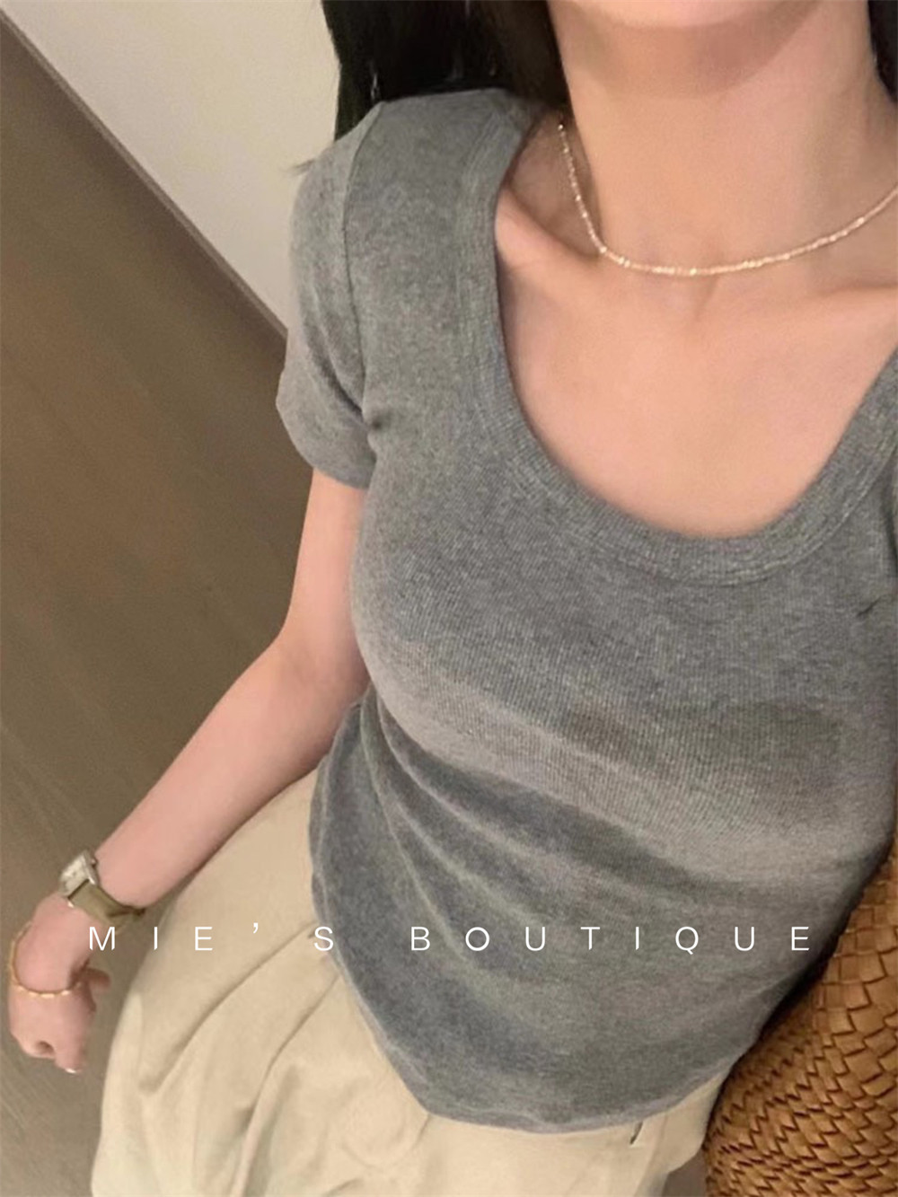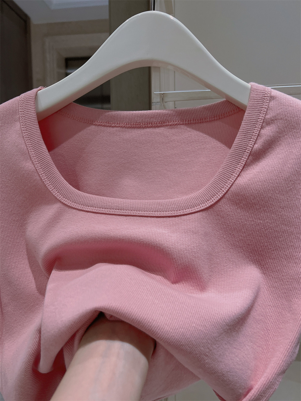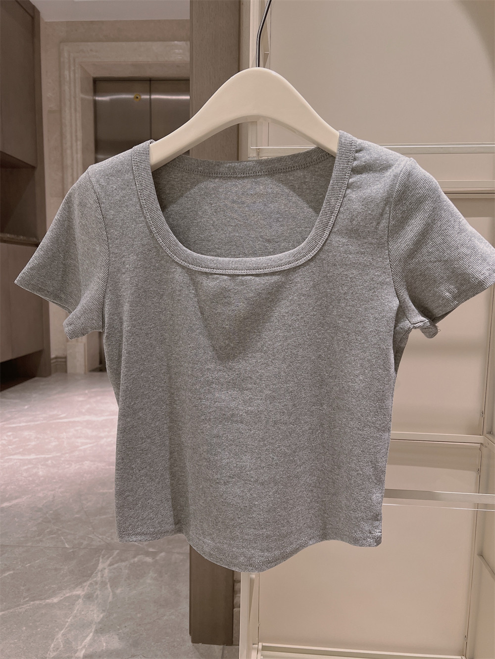 Реальный снимок◆Miss Rie ~ Футболка из чистого хлопка с открытыми правыми плечами, квадратным вырезом и современным стилем, однотонная однотонная футболка с дугообразным краем.