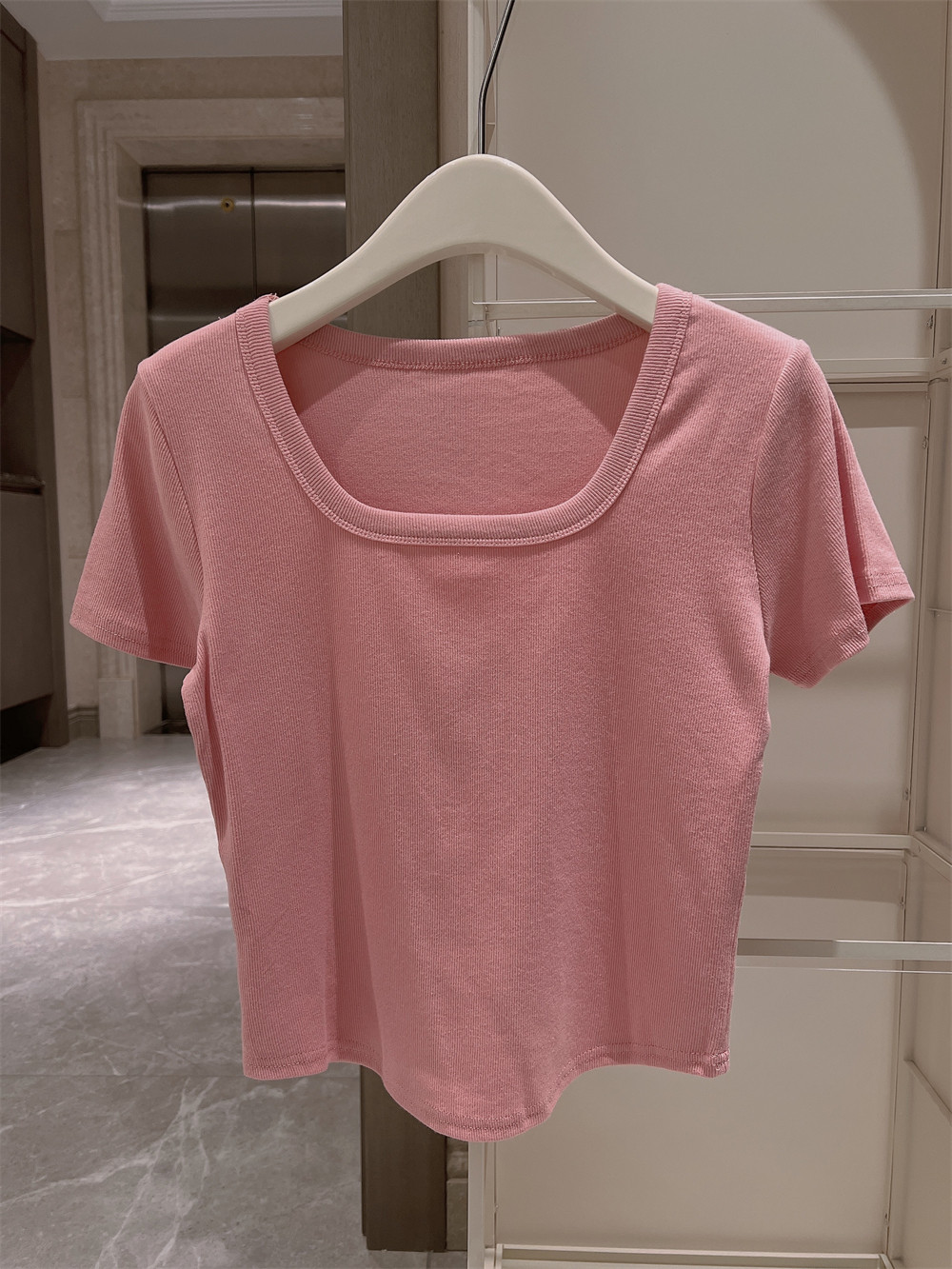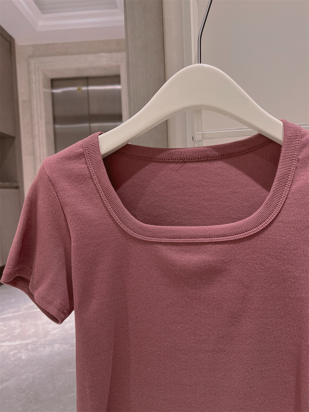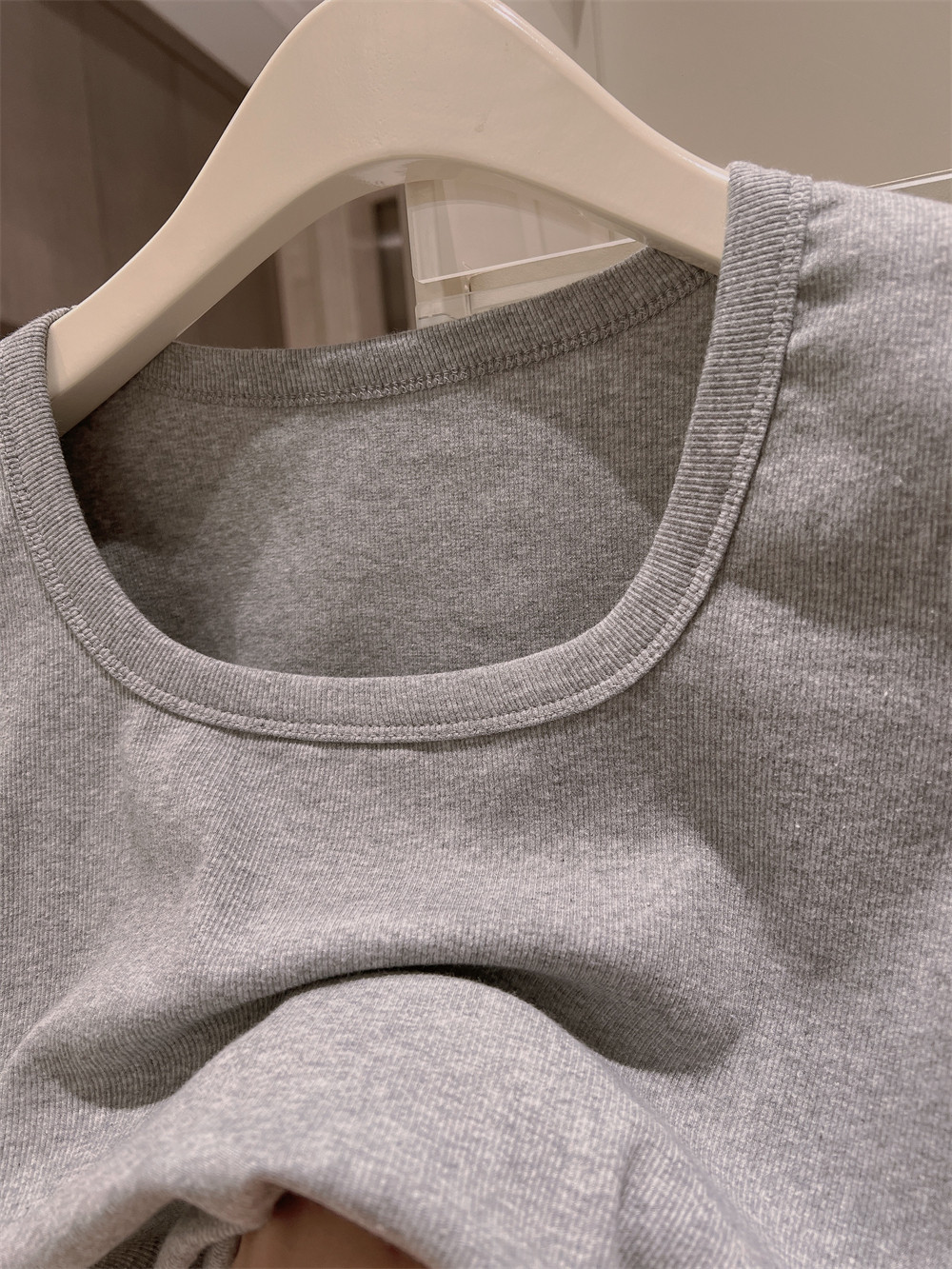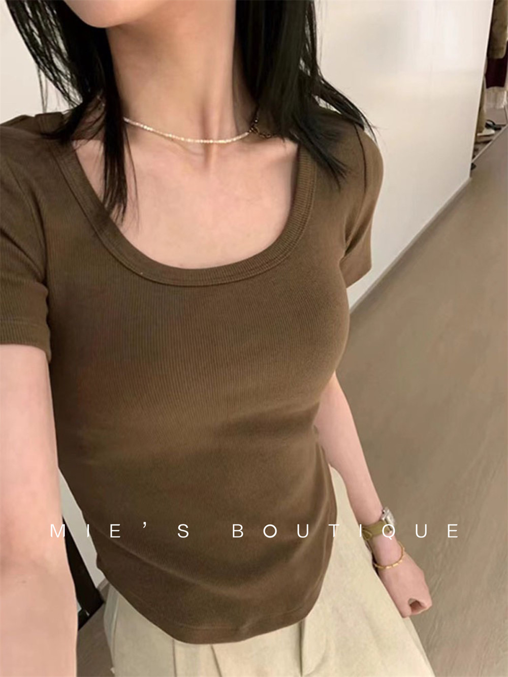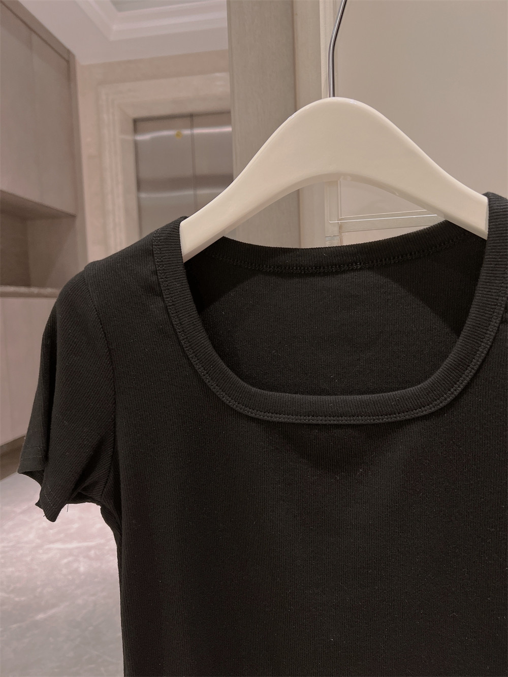 Реальный снимок◆Miss Rie ~ Футболка из чистого хлопка с открытыми правыми плечами, квадратным вырезом и современным стилем, однотонная однотонная футболка с дугообразным краем.