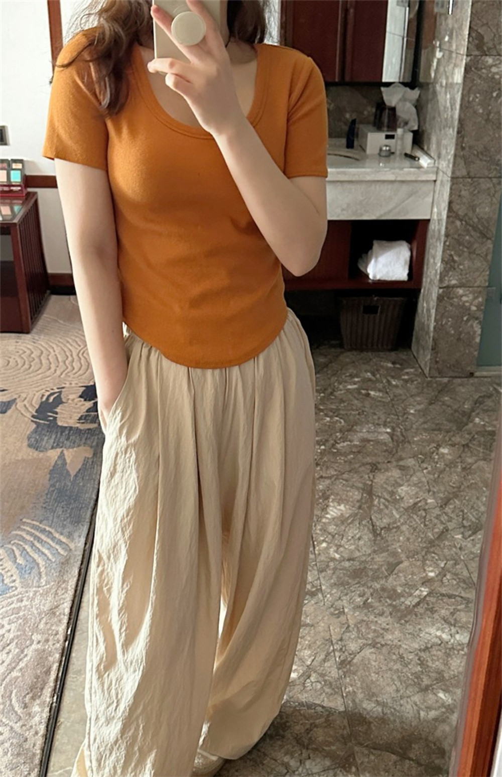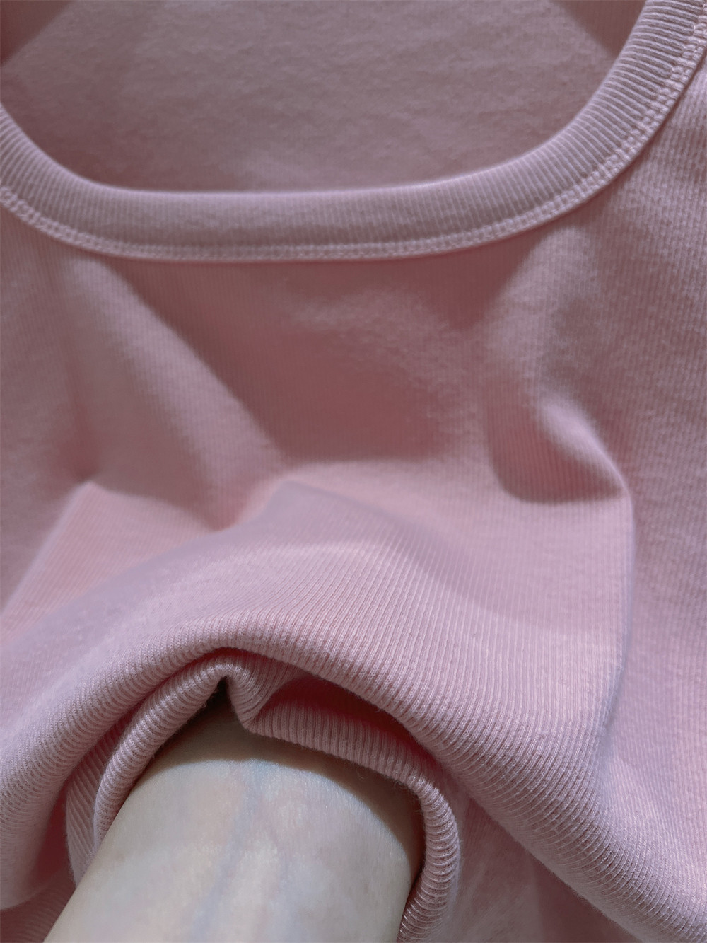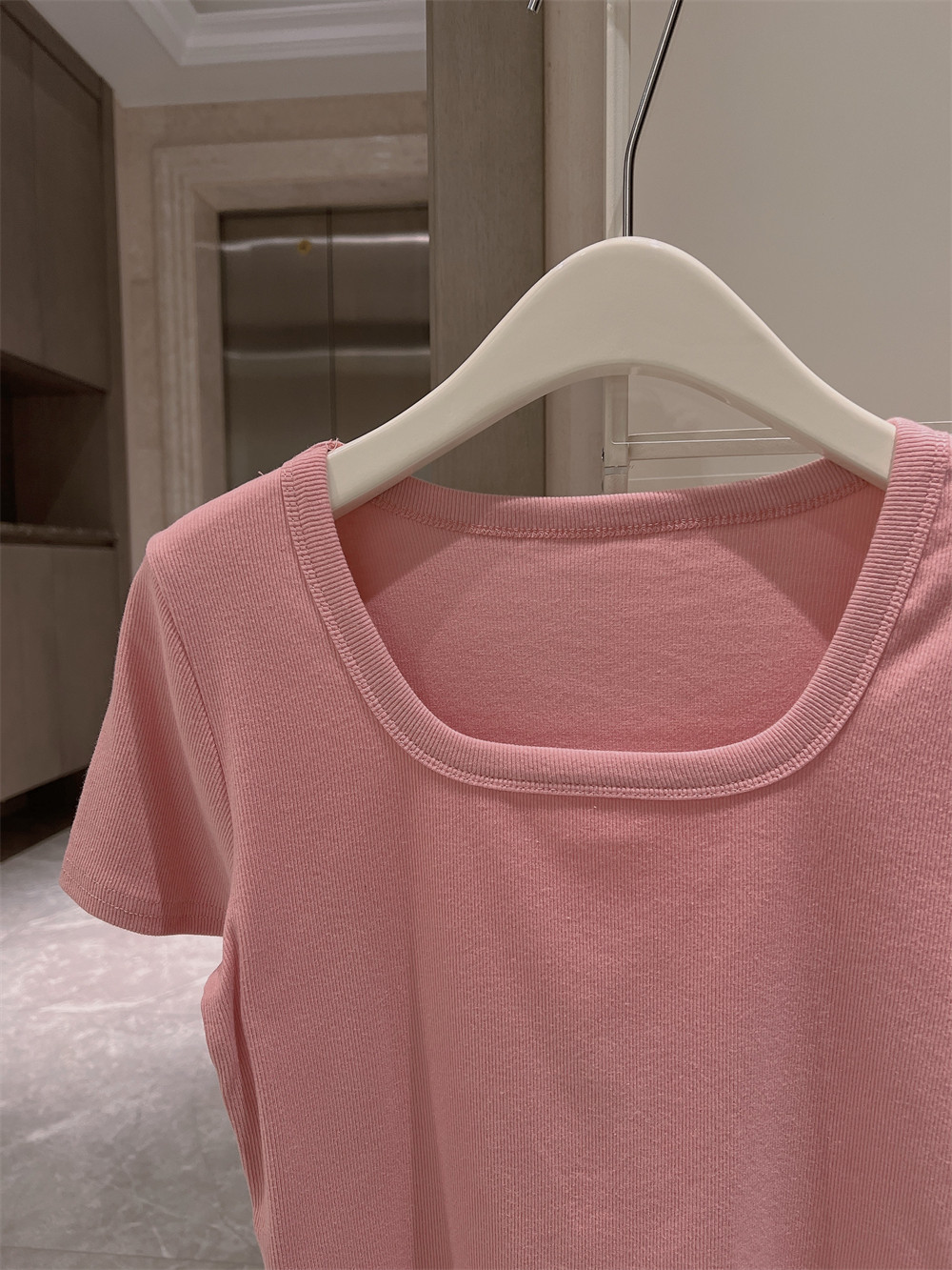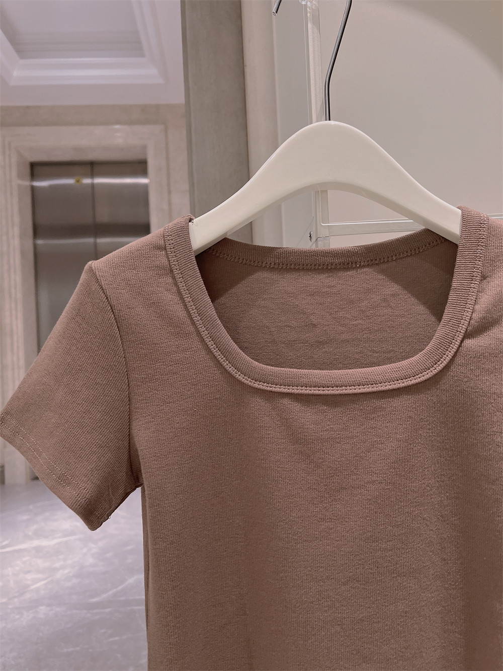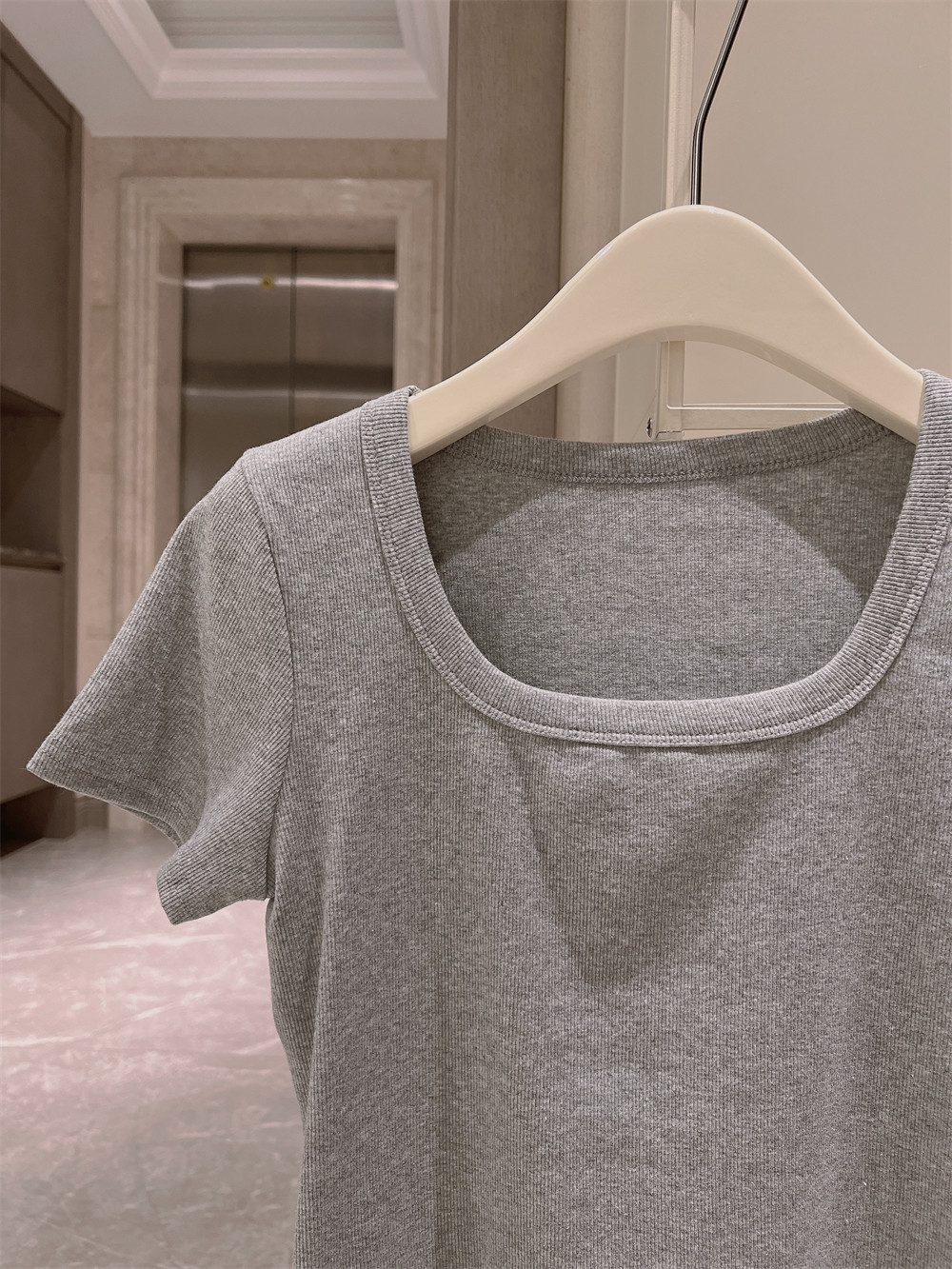 Реальный снимок◆Miss Rie ~ Футболка из чистого хлопка с открытыми правыми плечами, квадратным вырезом и современным стилем, однотонная однотонная футболка с дугообразным краем.