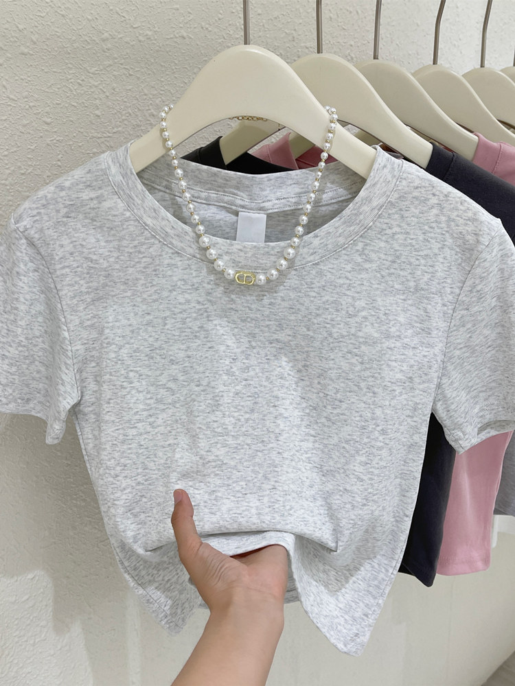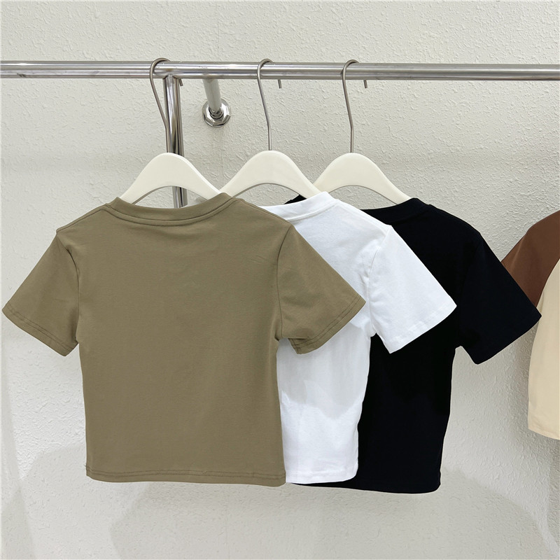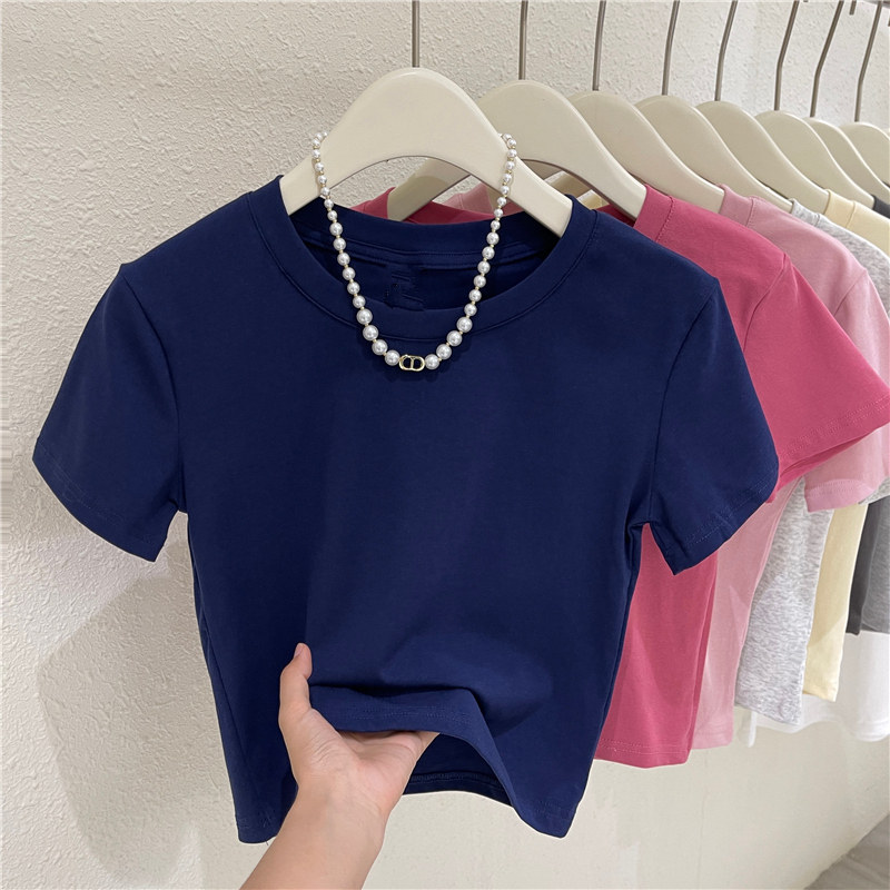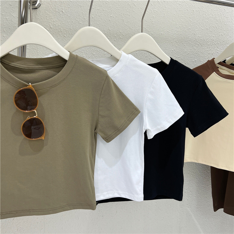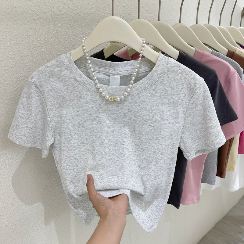 Летняя короткая футболка с коротким рукавом с круглым воротником, облегающий крой, высокая талия