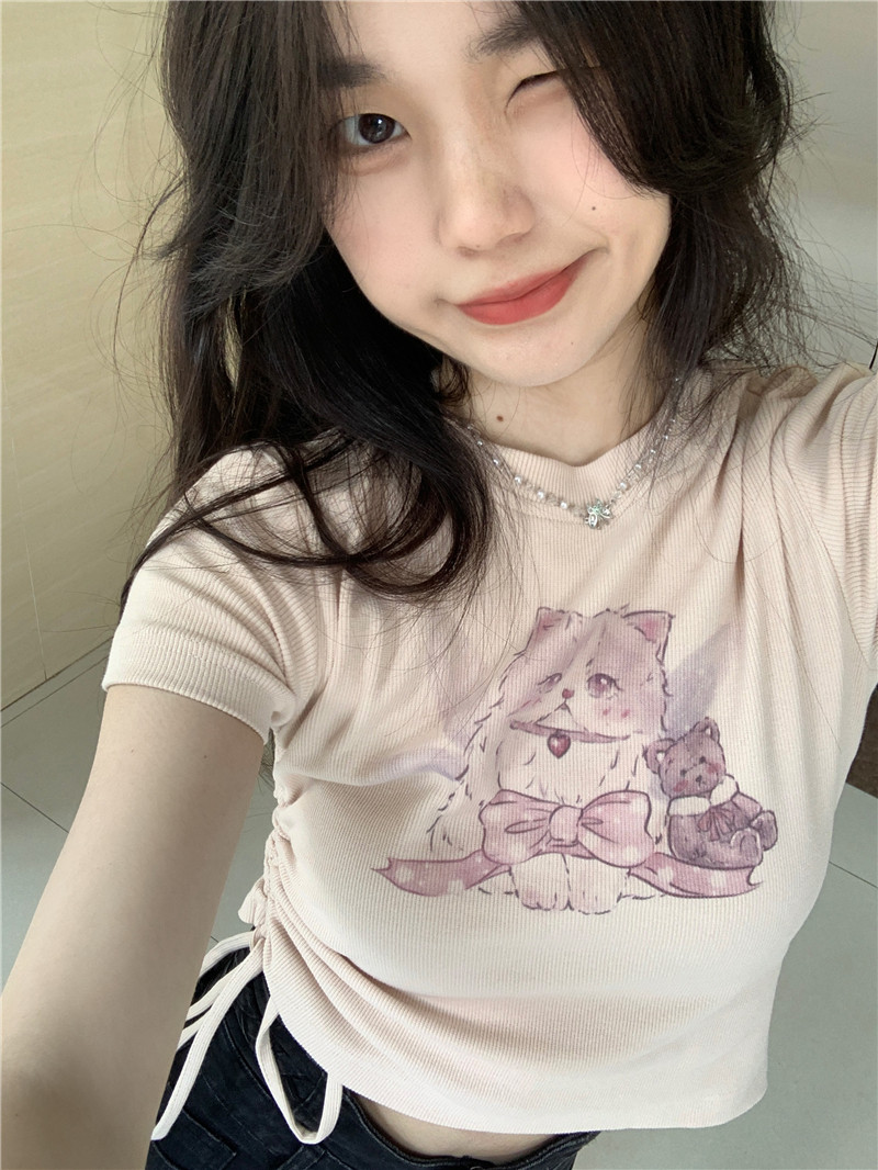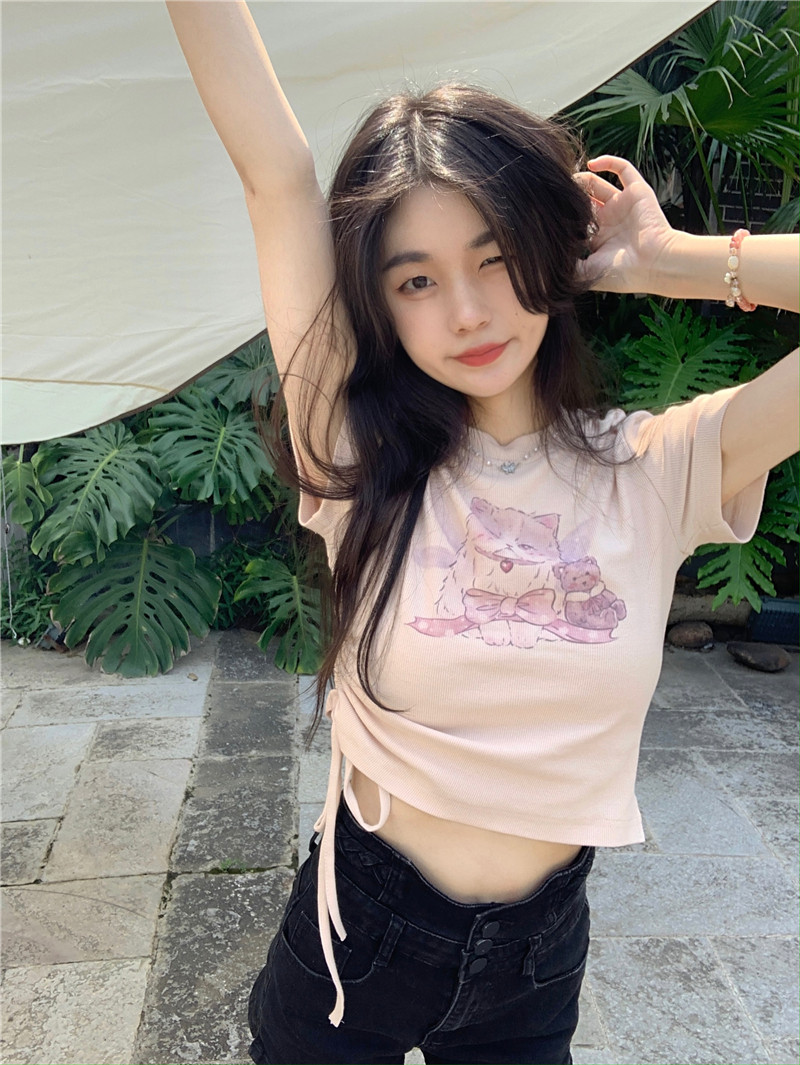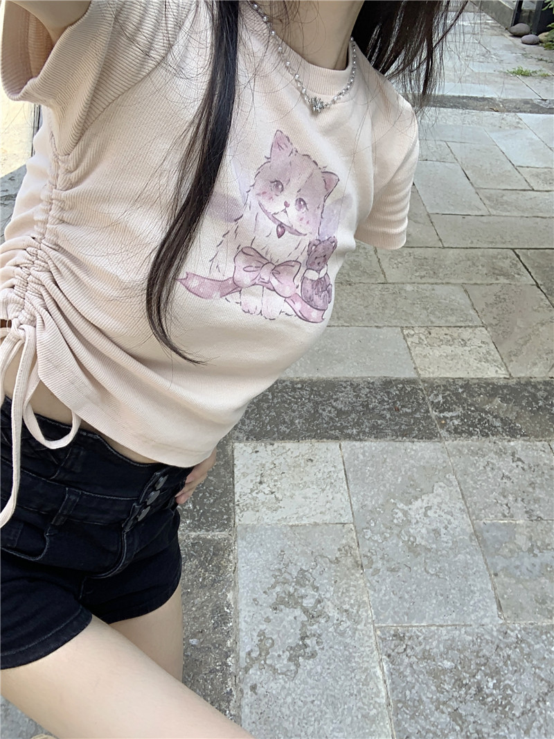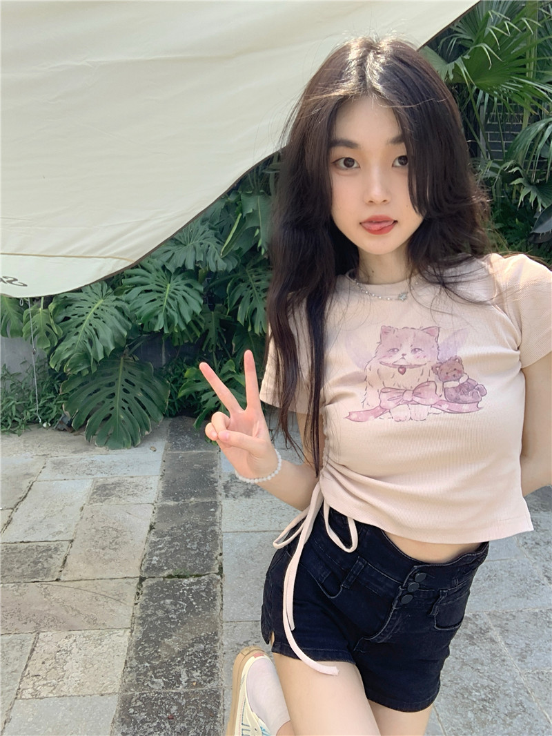 Летняя короткая брендовая футболка с коротким рукавом, облегающий крой, на шнурках