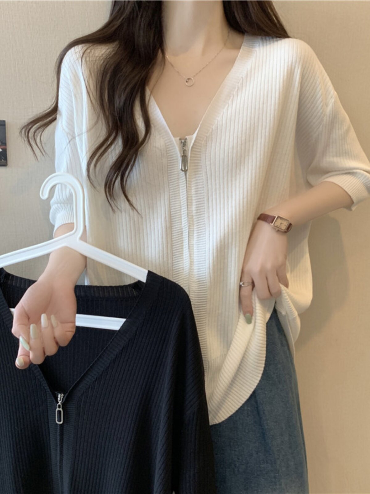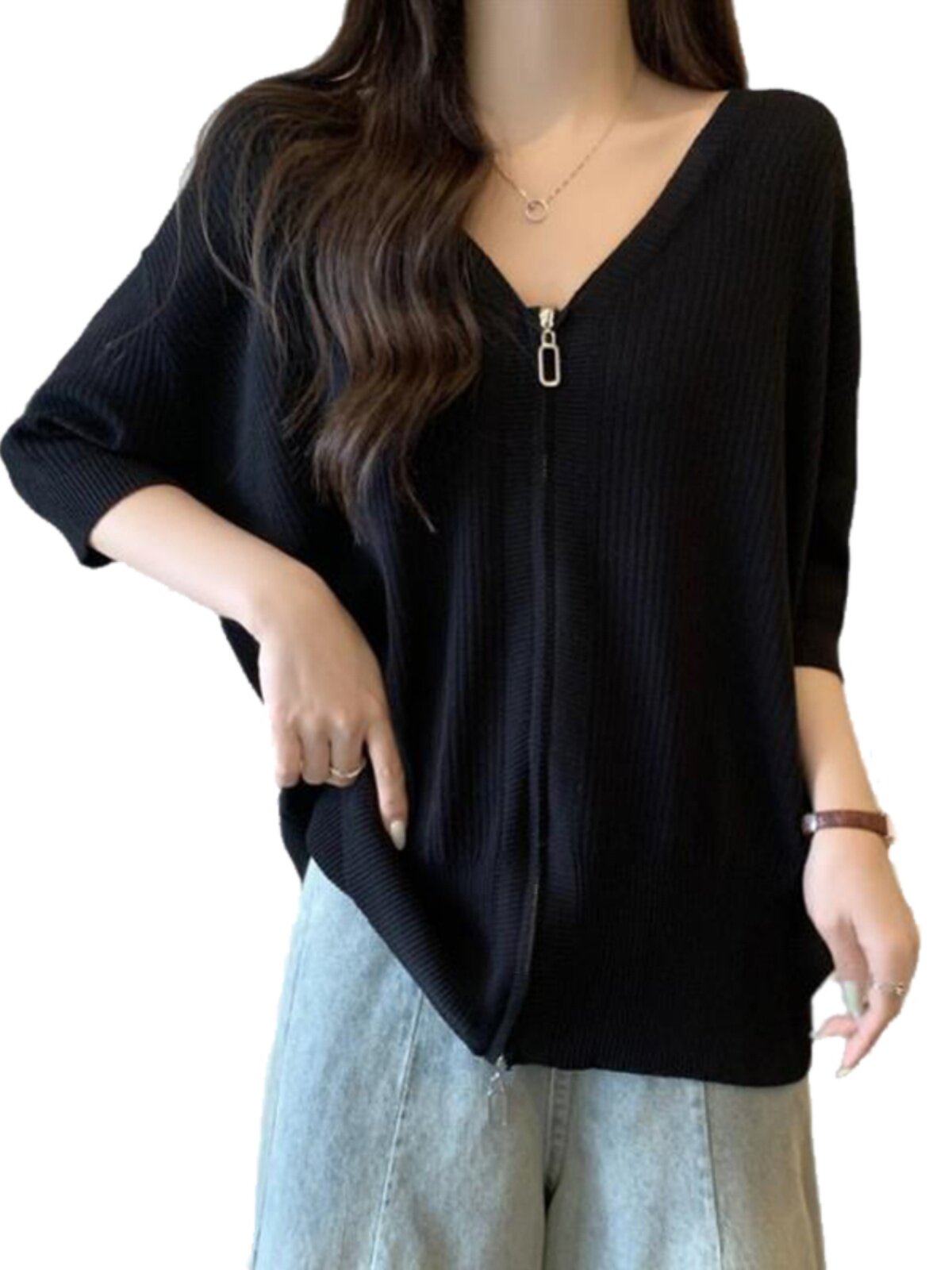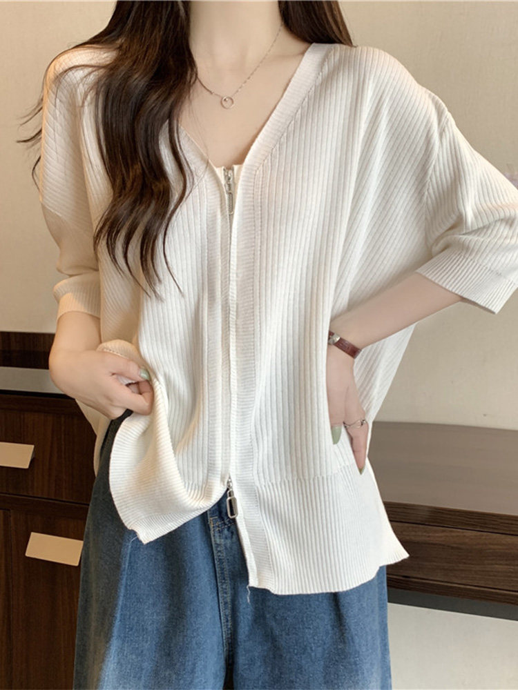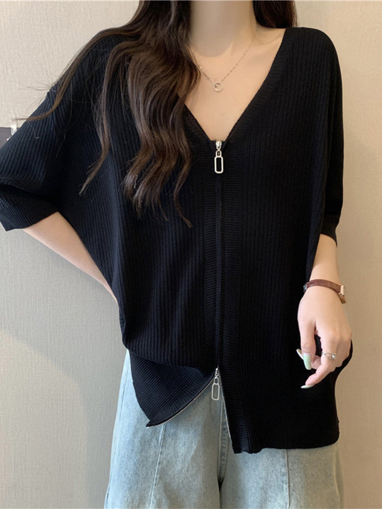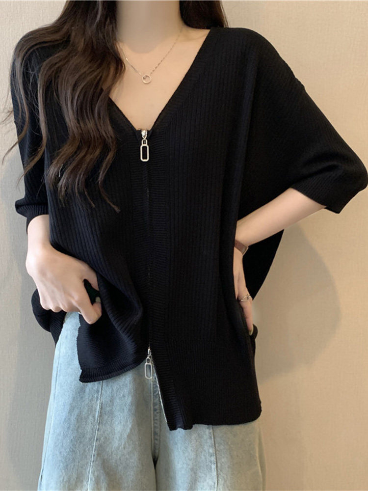 Летний трикотажный свитер, футболка с коротким рукавом, большой размер, V-образный вырез, высокий воротник