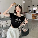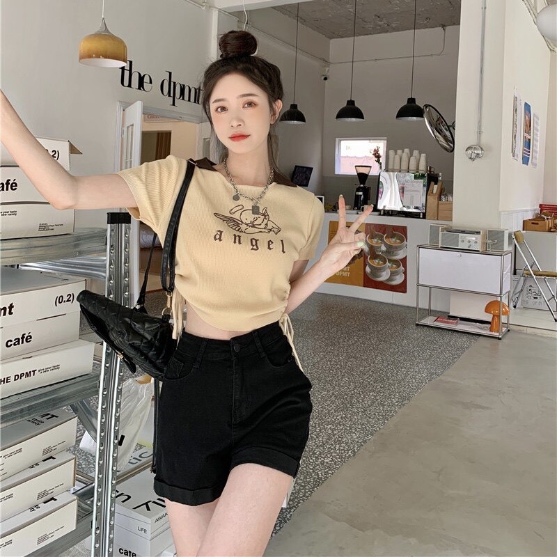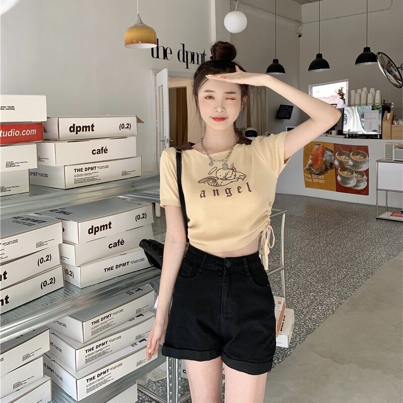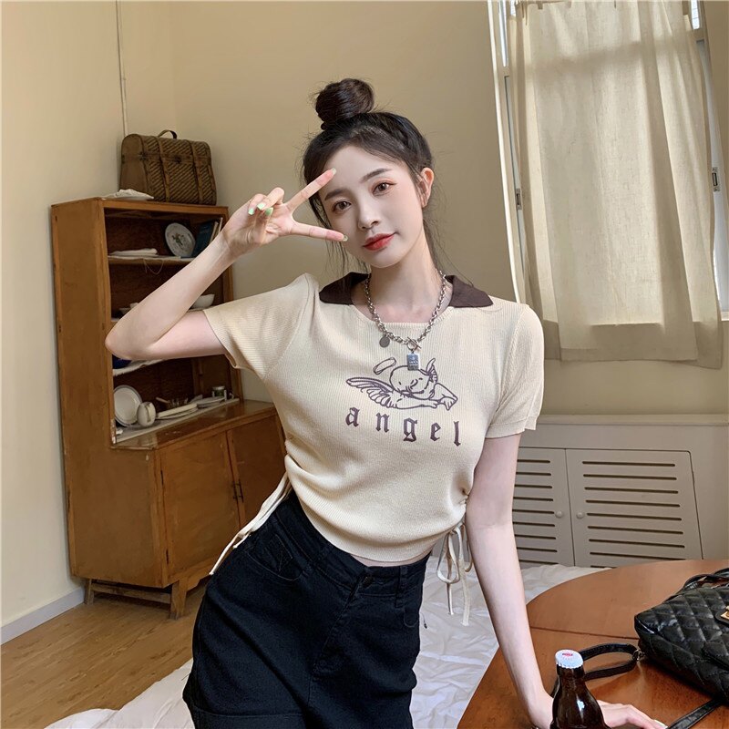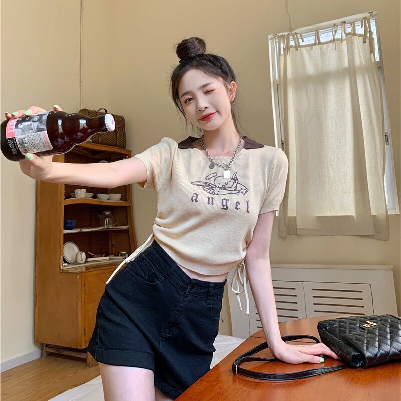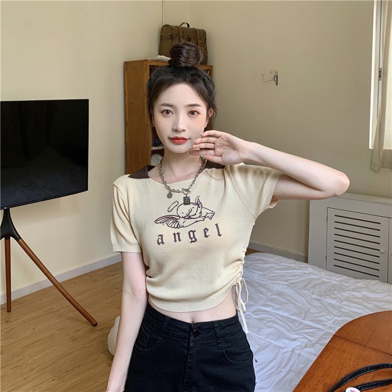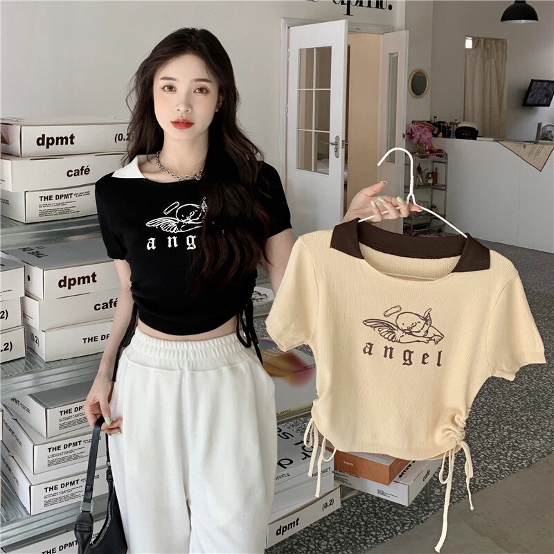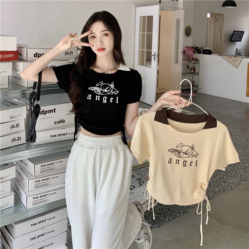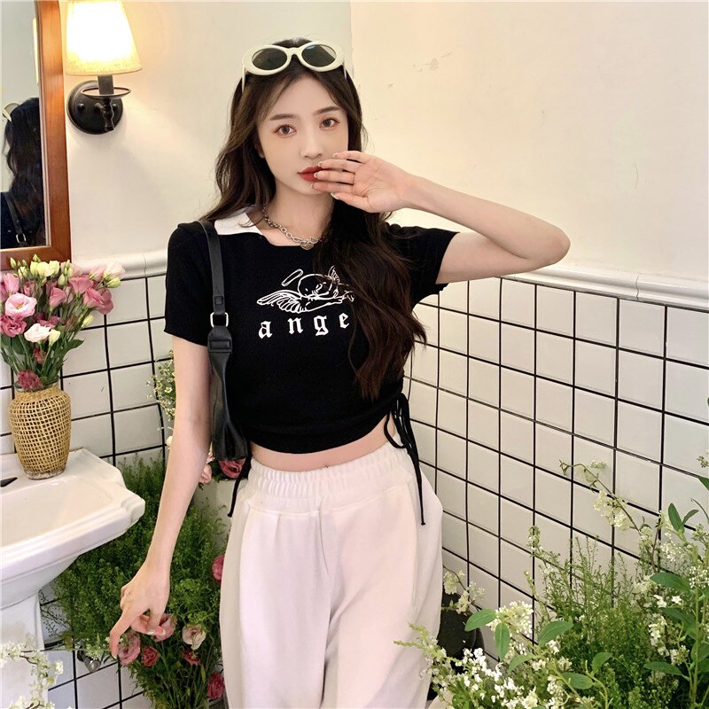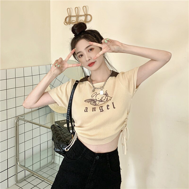 Летняя дизайнерская приталенная футболка, в американском стиле, тренд сезона, на шнурках, короткий рукав