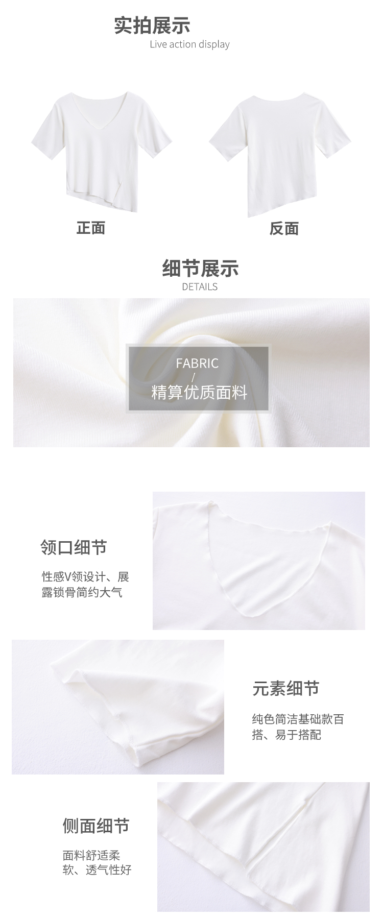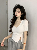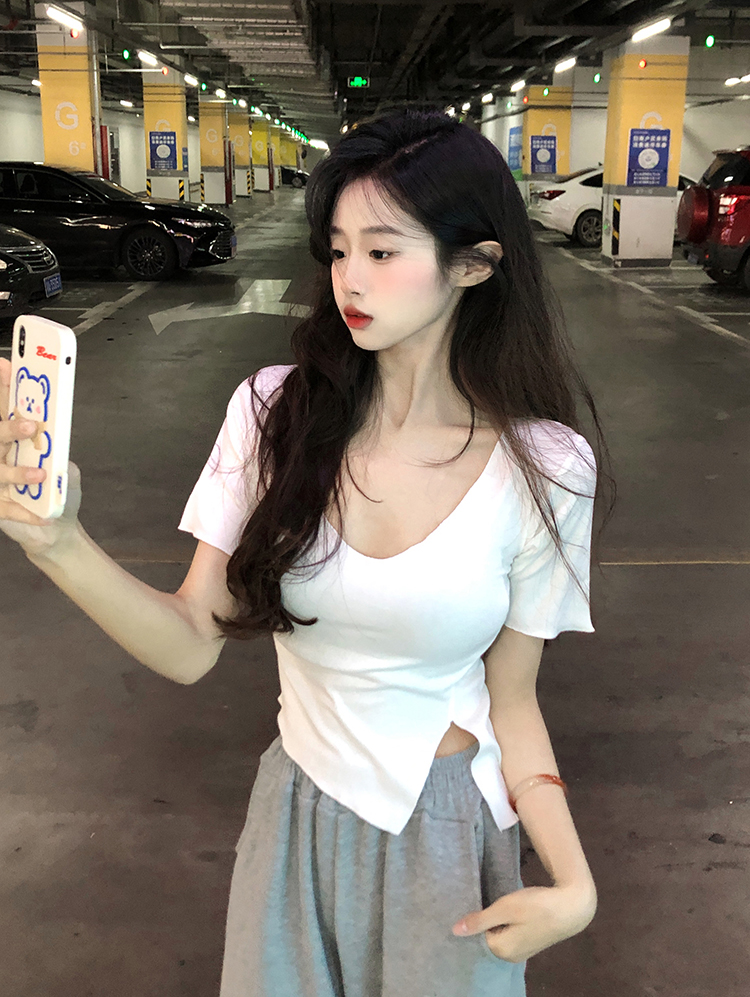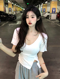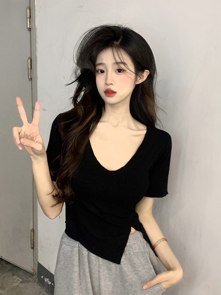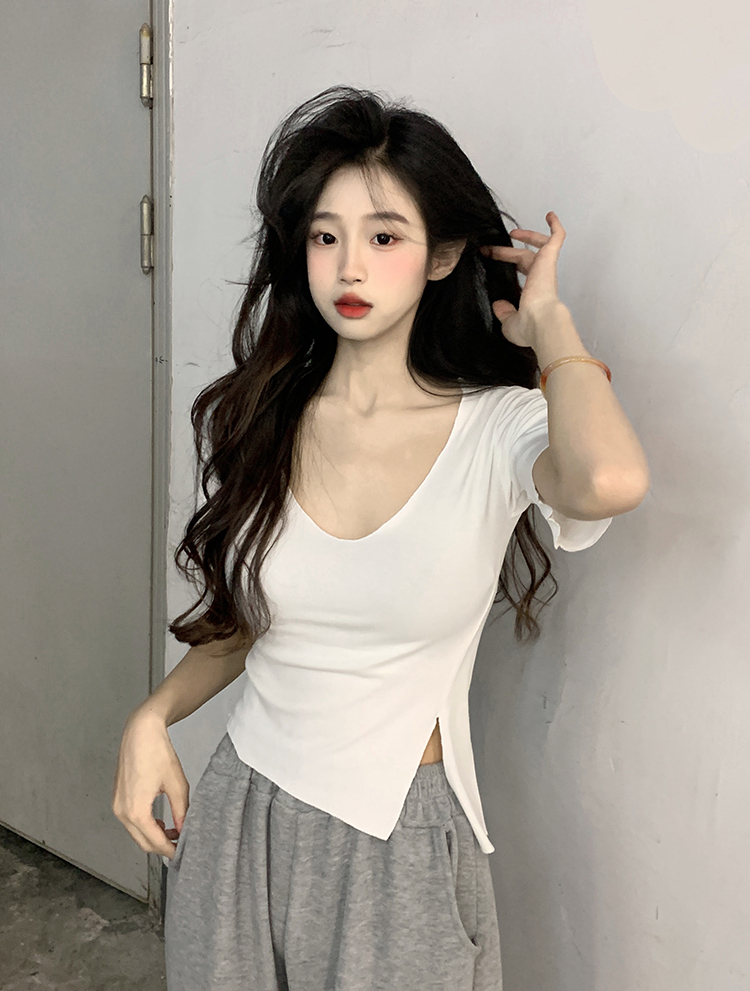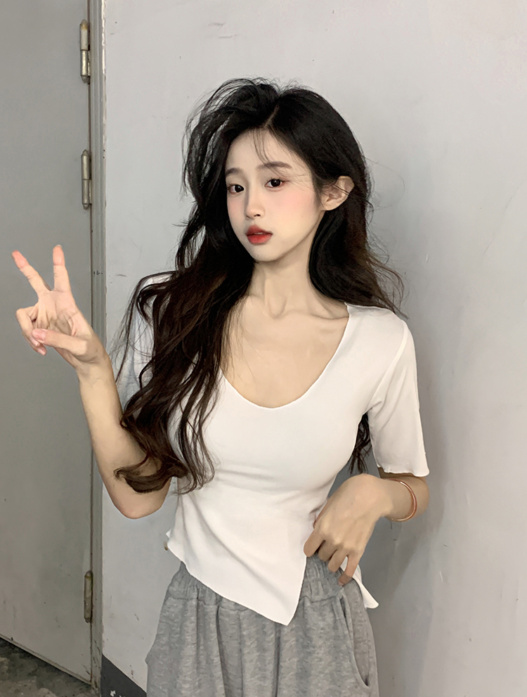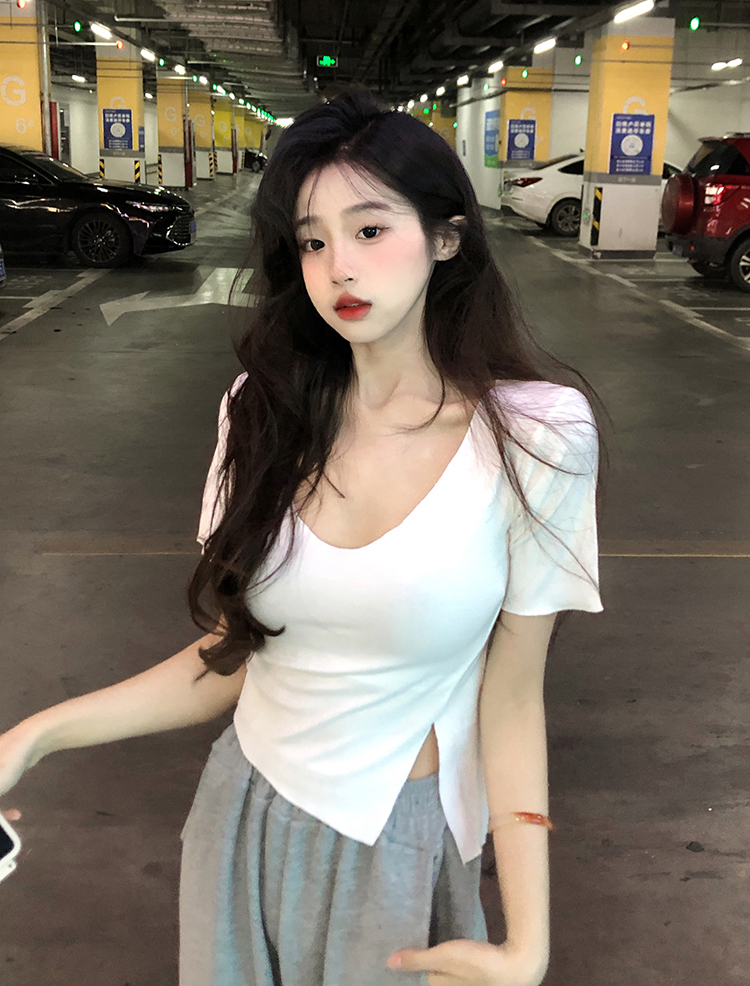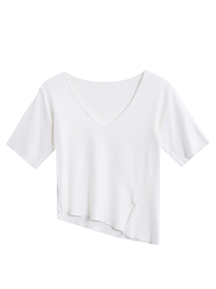Белая летняя короткая хлопковая футболка, V-образный вырез, короткий рукав