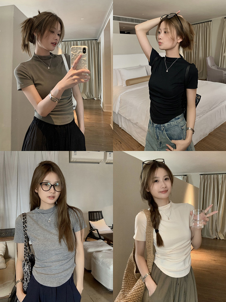 Летняя сексуальная цветная футболка, высокий воротник, короткий рукав, по фигуре
