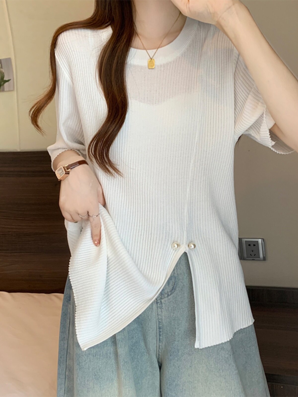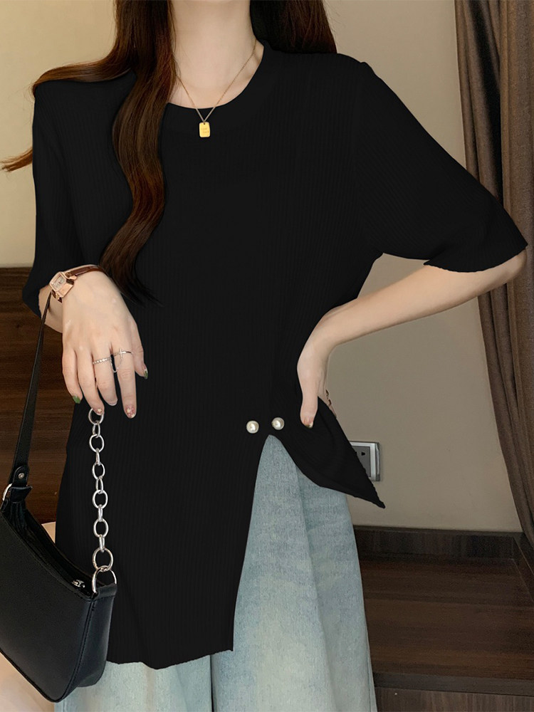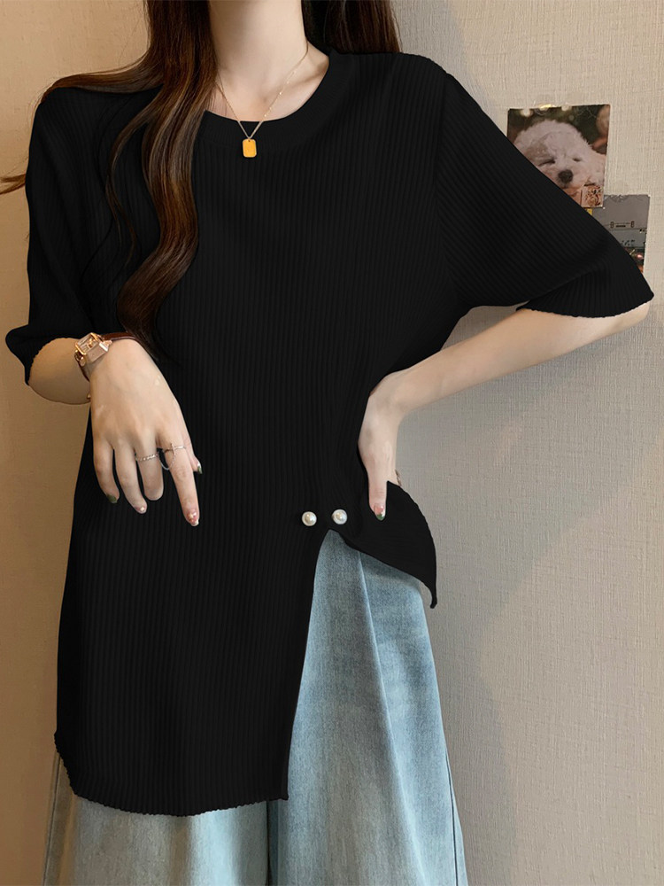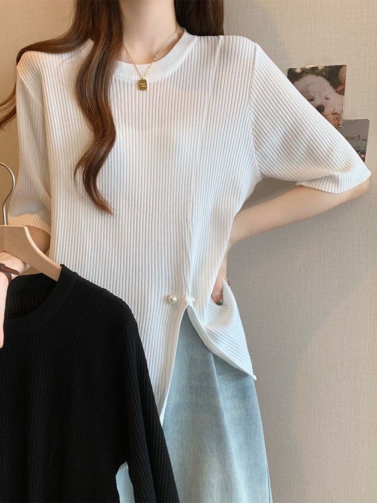 Трикотажный свитер, длинная футболка с коротким рукавом, большой размер, средней длины