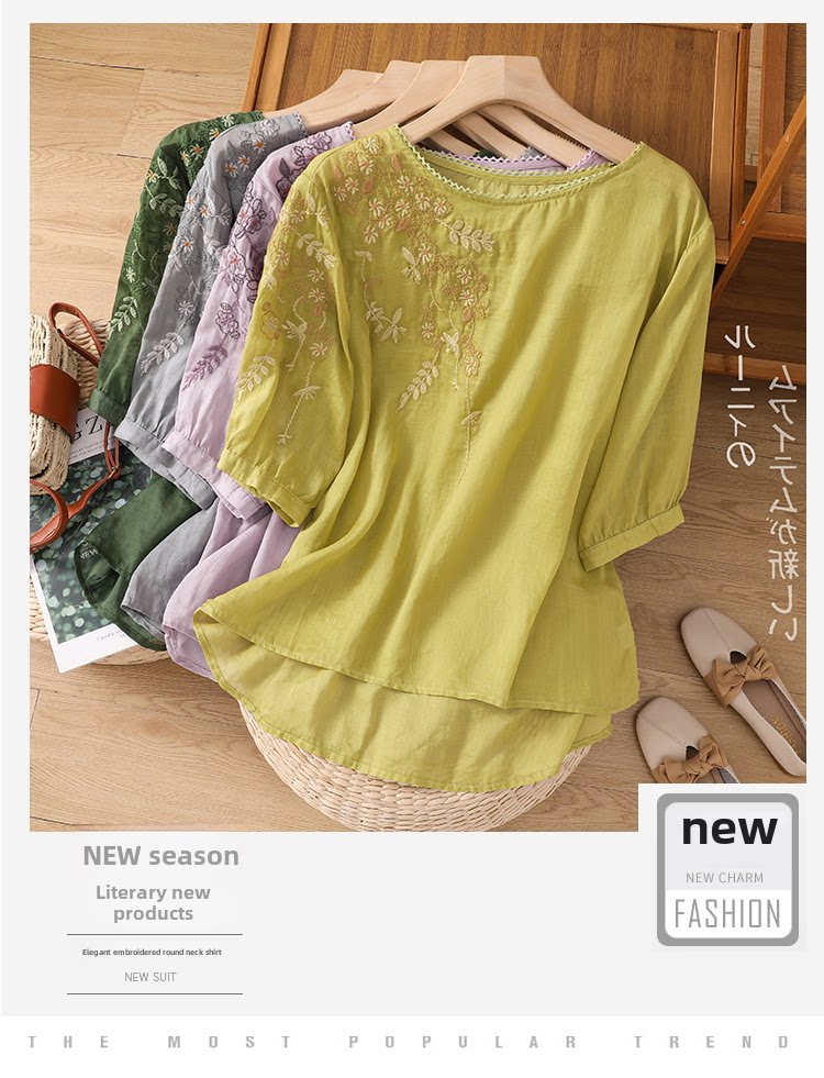 Тонкая футболка с коротким рукавом для матери, из хлопка и льна, с вышивкой, большой размер