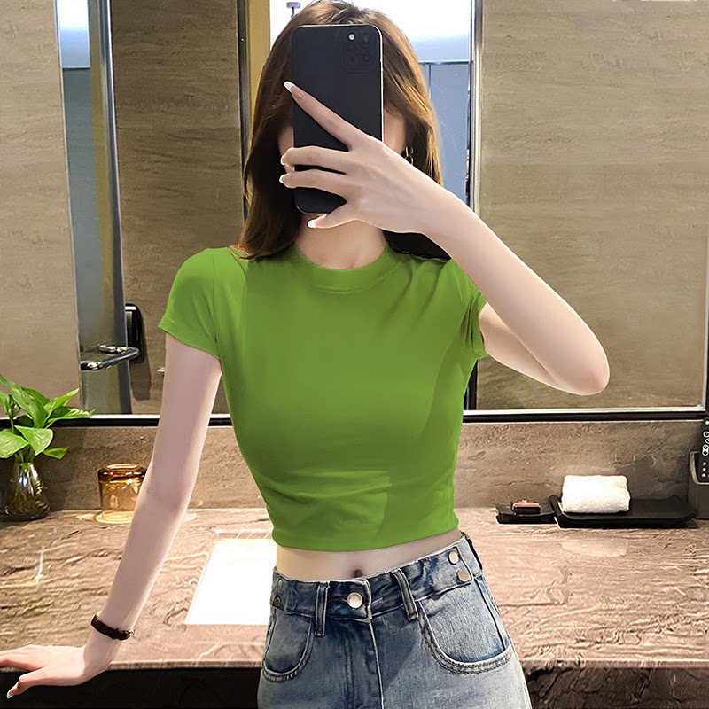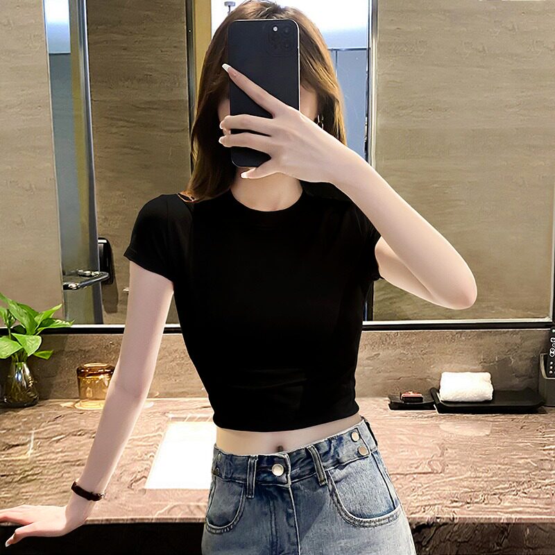 Черная хлопковая короткая футболка с круглым воротником, короткий рукав, в обтяжку