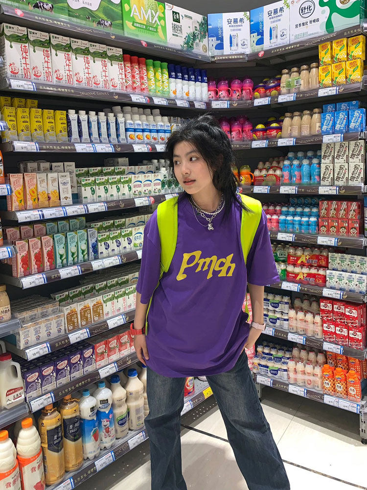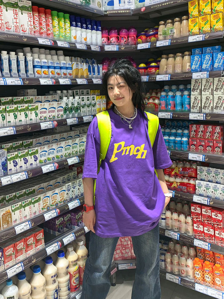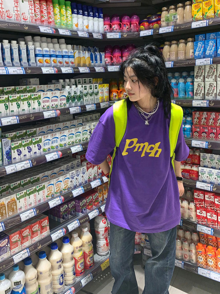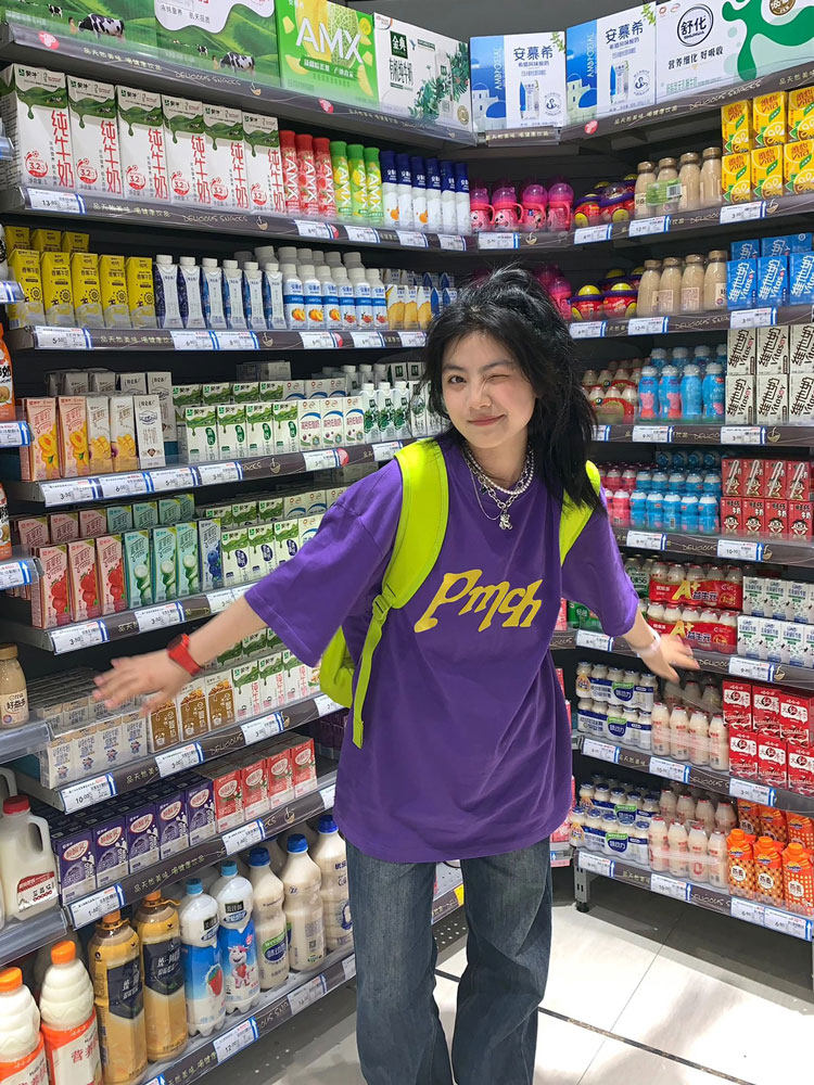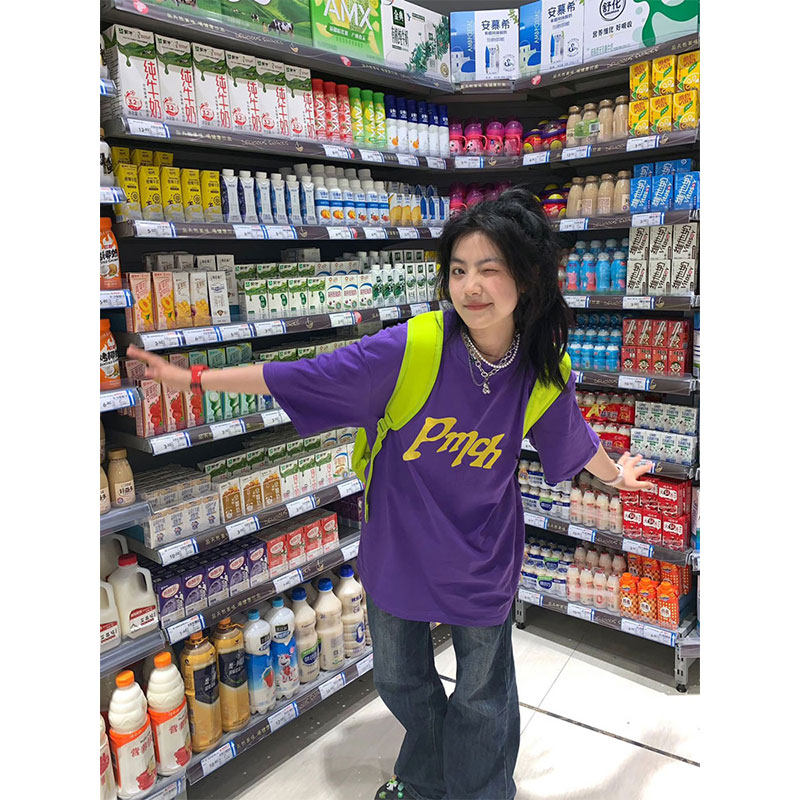 Сиреневая летняя ретро хлопковая футболка, короткий рукав, в американском стиле, оверсайз
