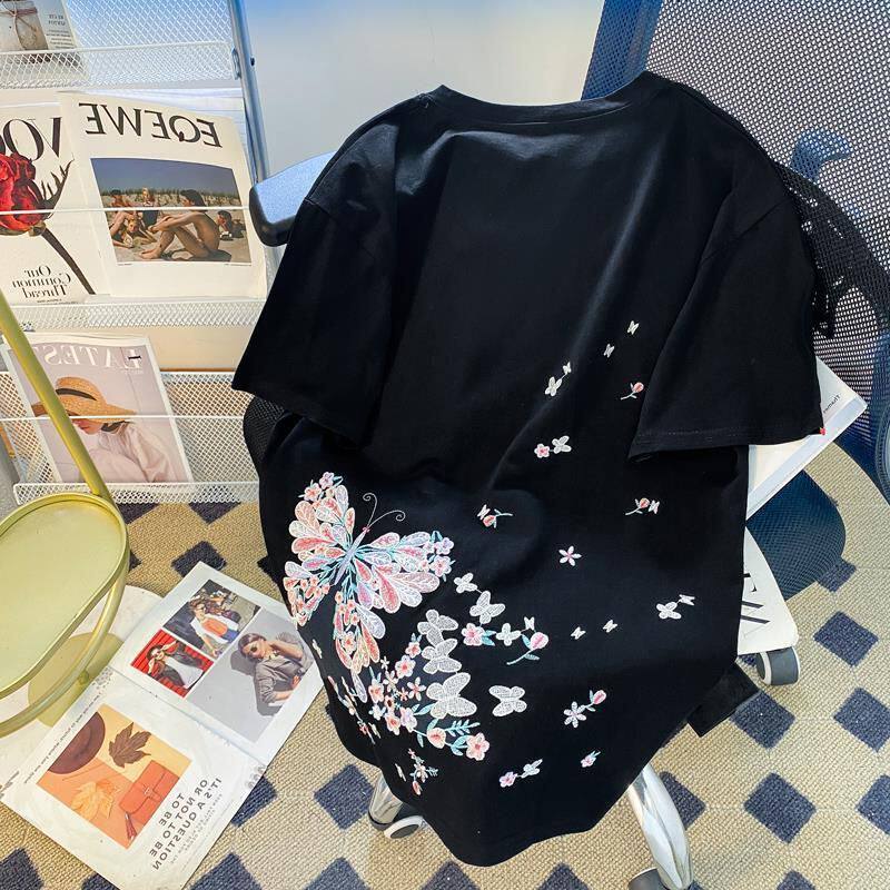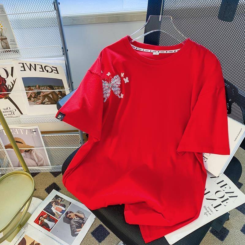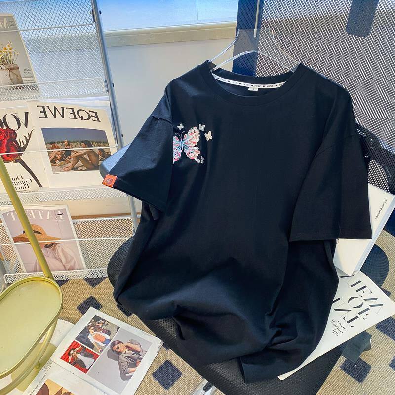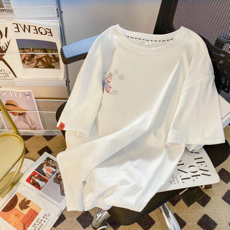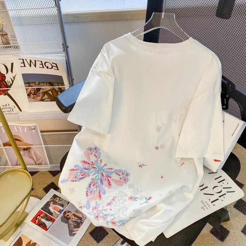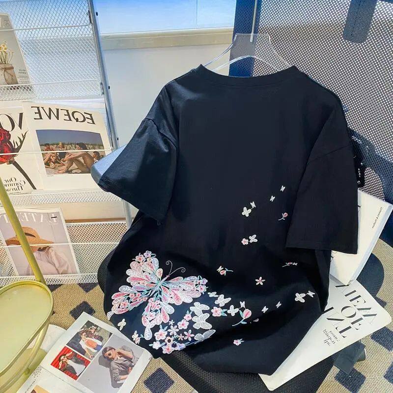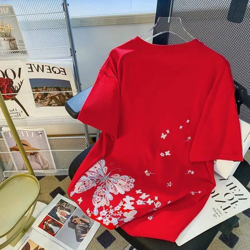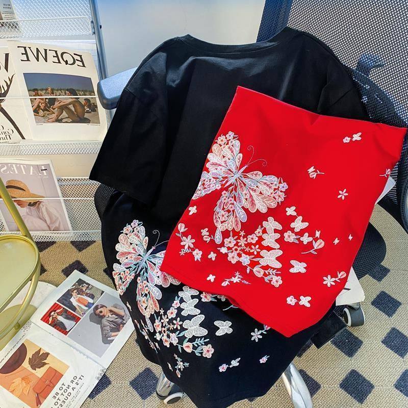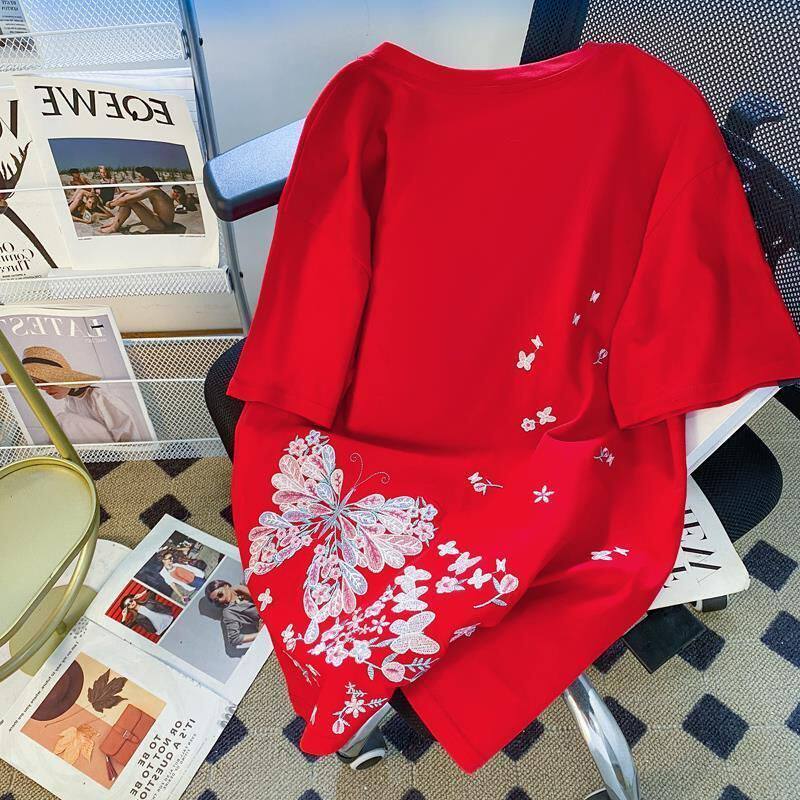 Футболка с коротким рукавом, летняя одежда для влюбленных, большой размер, китайский стиль, с вышивкой, свободный крой, подходит для полных девушек, по фигуре