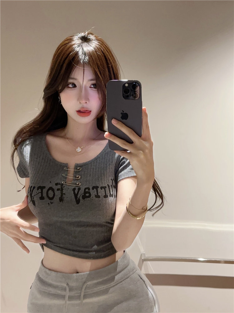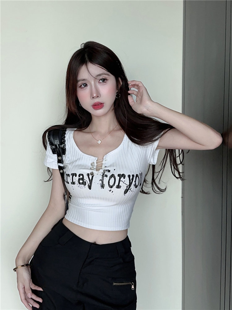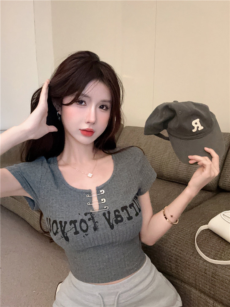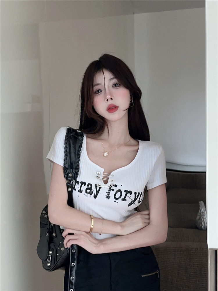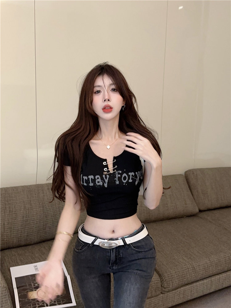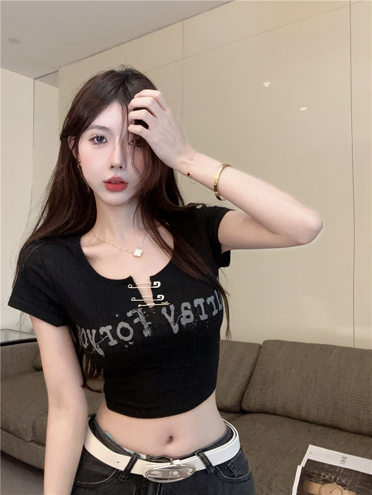 Дизайнерская короткая булавка, футболка с коротким рукавом, черная летняя одежда, подходит для подростков, тренд сезона, в американском стиле, высокая талия