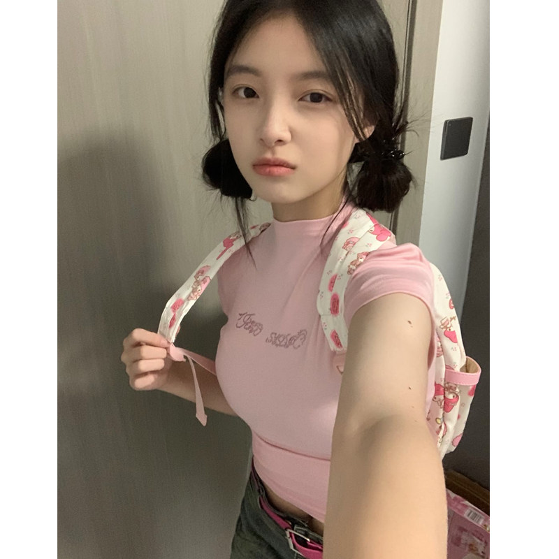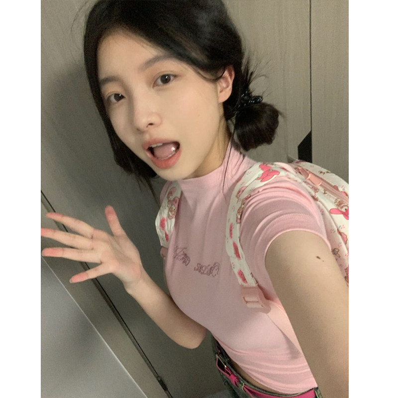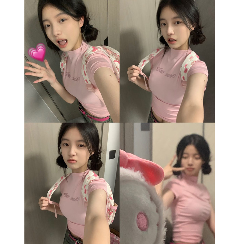 Розовая цветная летняя короткая футболка, высокий воротник, в обтяжку
