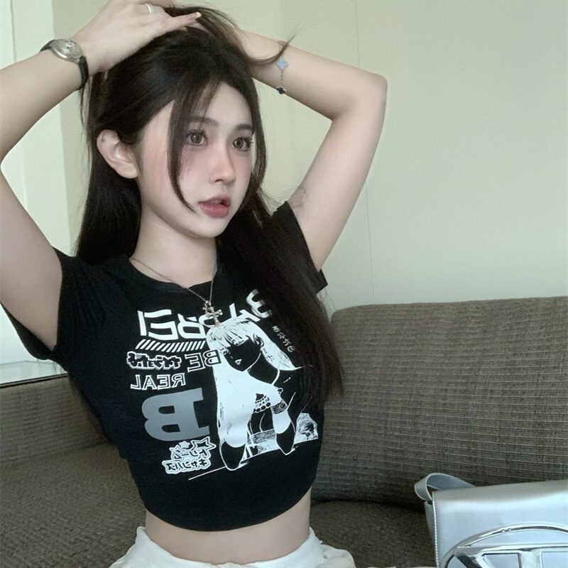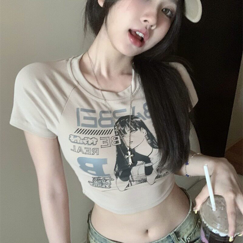 Летняя сексуальная короткая футболка, в американском стиле, высокая талия, в обтяжку, по фигуре, короткий рукав