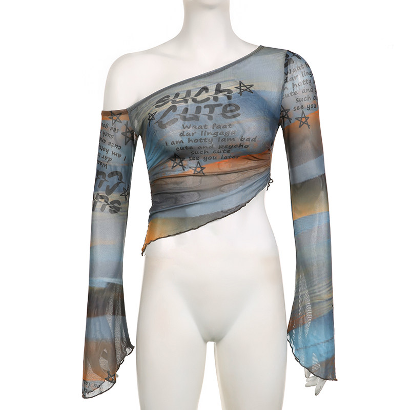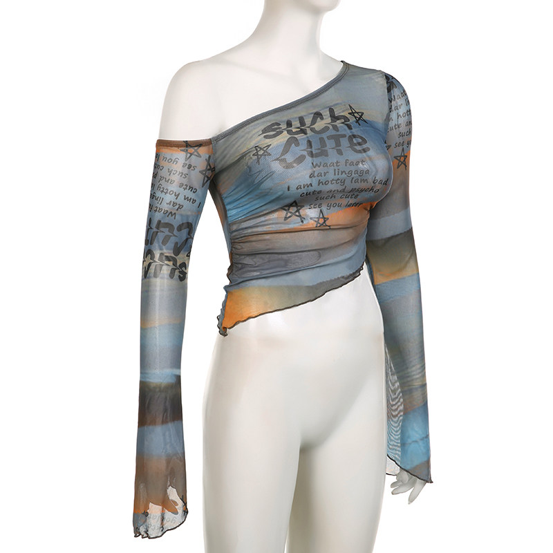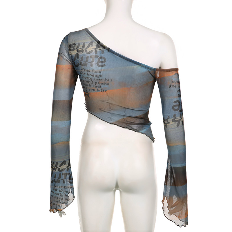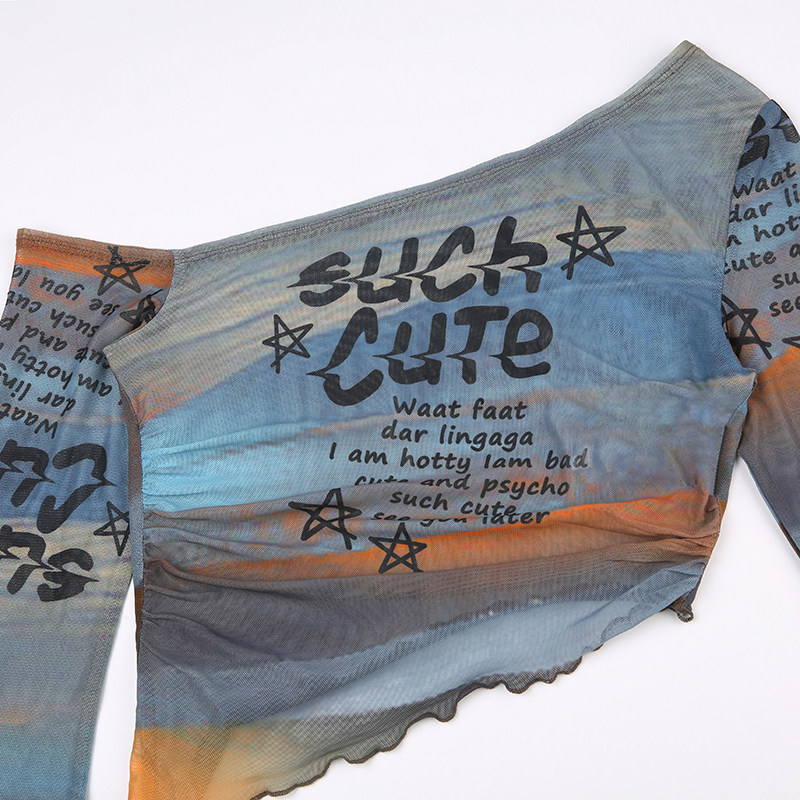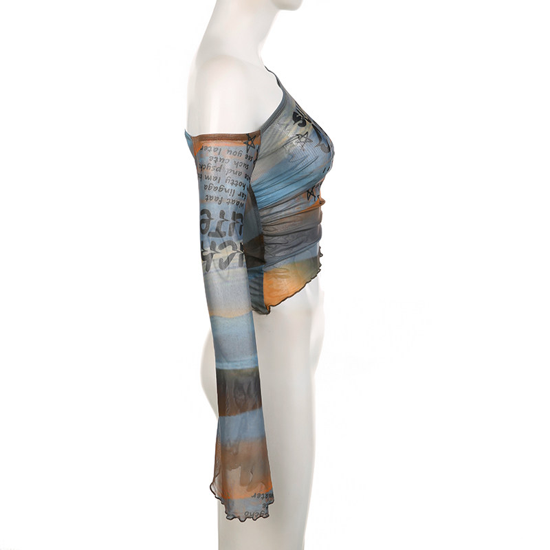 Weekeep оригинальная сетчатая футболка с длинными рукавами и открытыми плечами, женская футболка с буквенным принтом и рукавами-колокольчиками, сексуальный топ