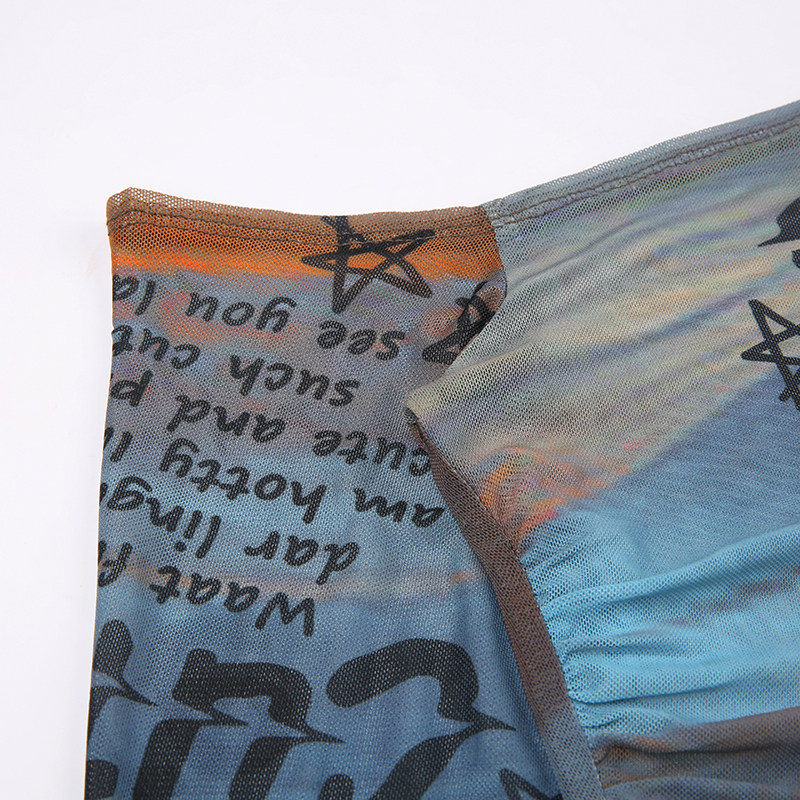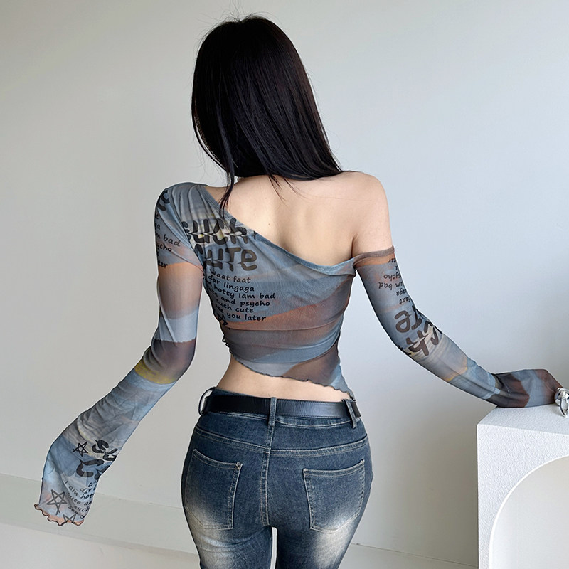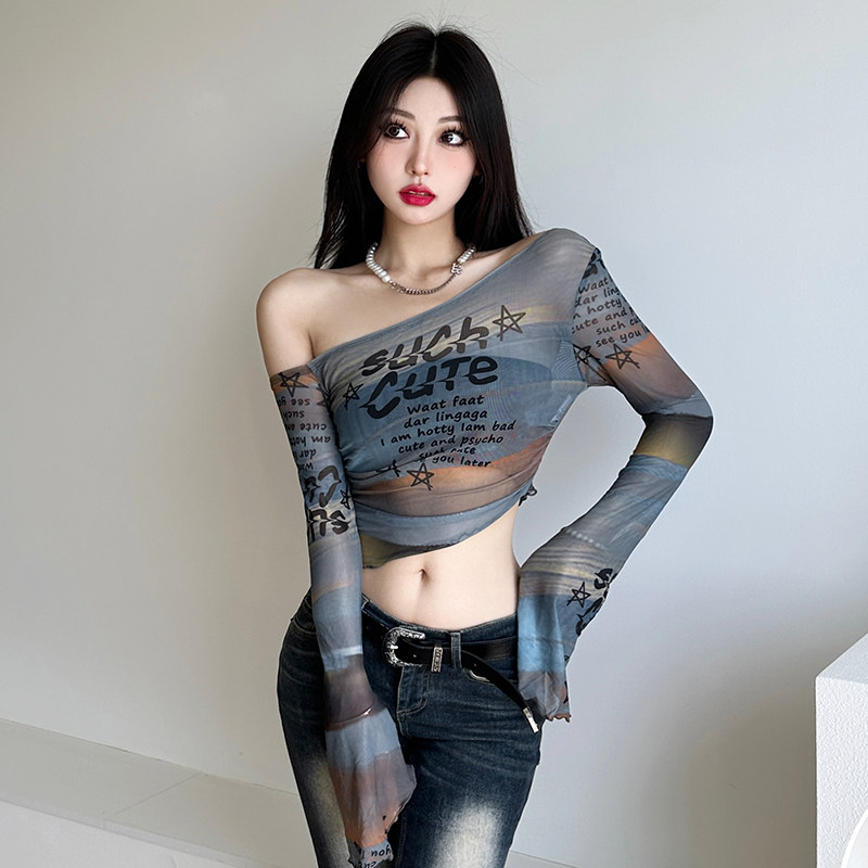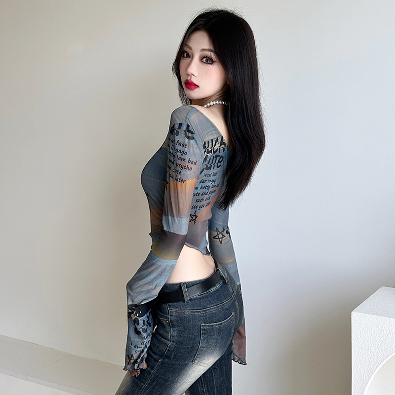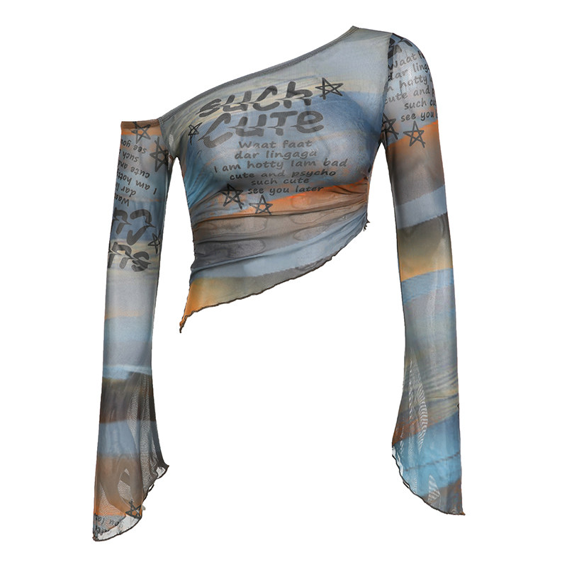 Weekeep оригинальная сетчатая футболка с длинными рукавами и открытыми плечами, женская футболка с буквенным принтом и рукавами-колокольчиками, сексуальный топ