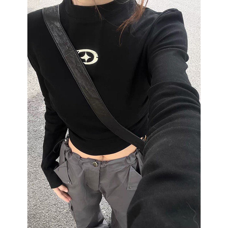 Приталенный осенний демисезонный черный короткий базовый приятный телу лонгслив, в американском стиле