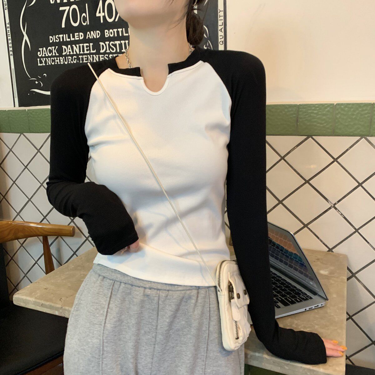 Ретро осенний базовый приятный телу короткий лонгслив, в американском стиле