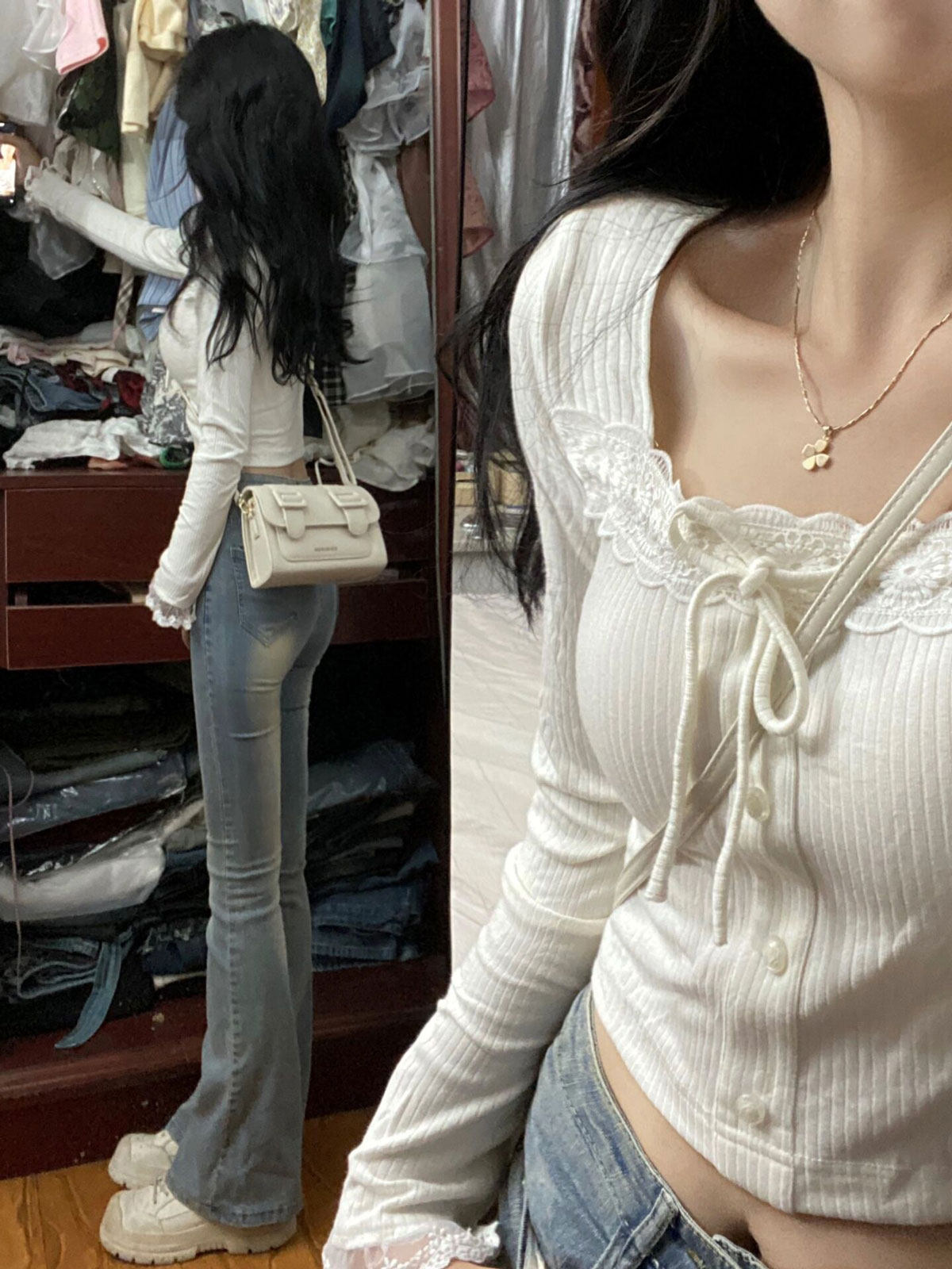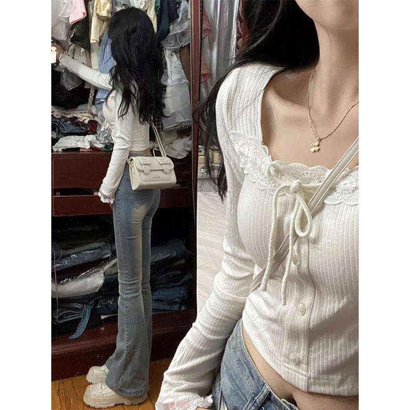 Белый кружевной базовый приятный телу осенний сексуальный приталенный короткий лонгслив, кружевное платье