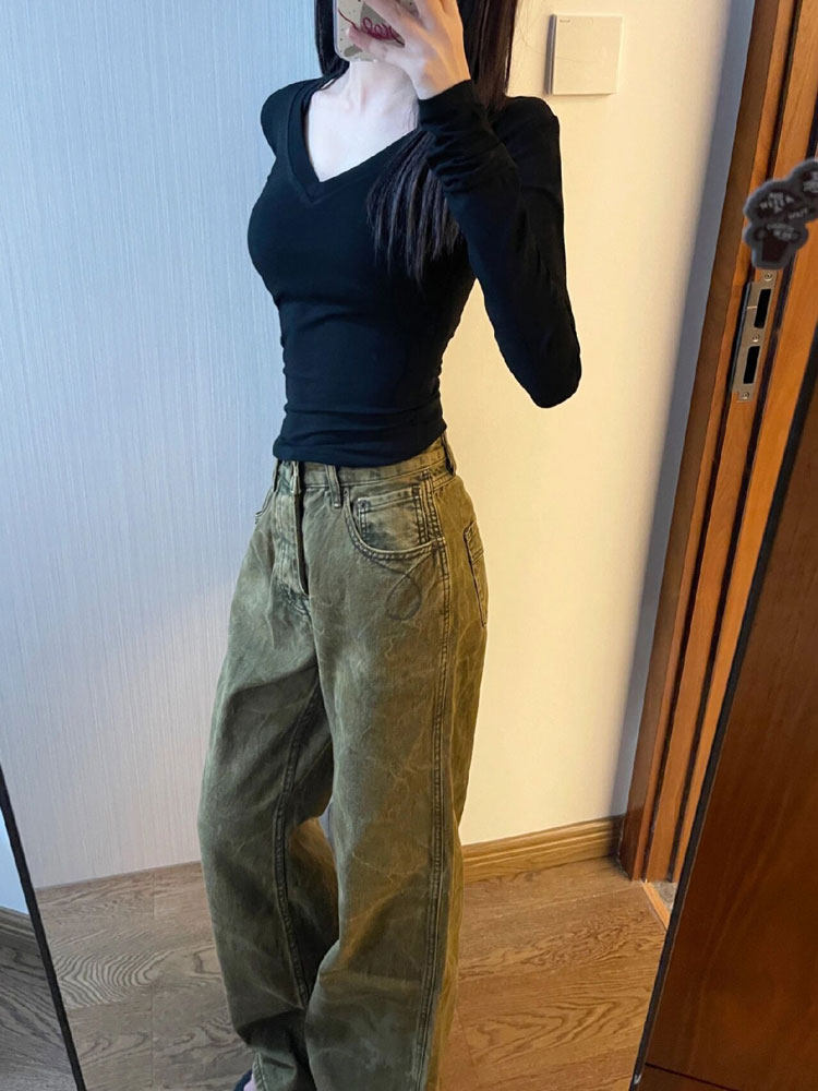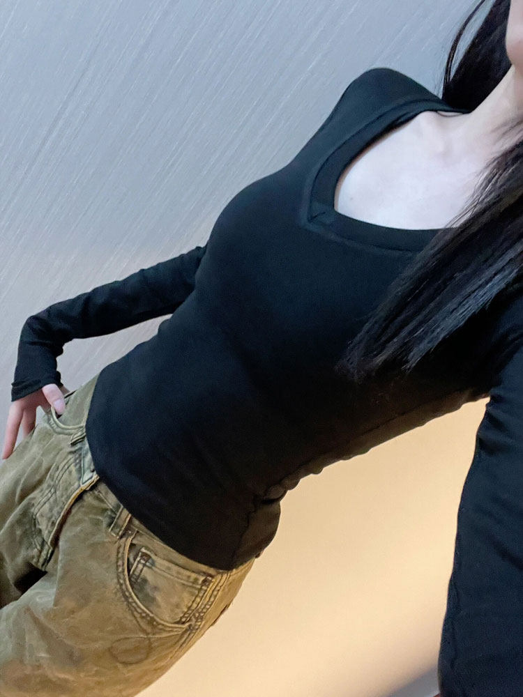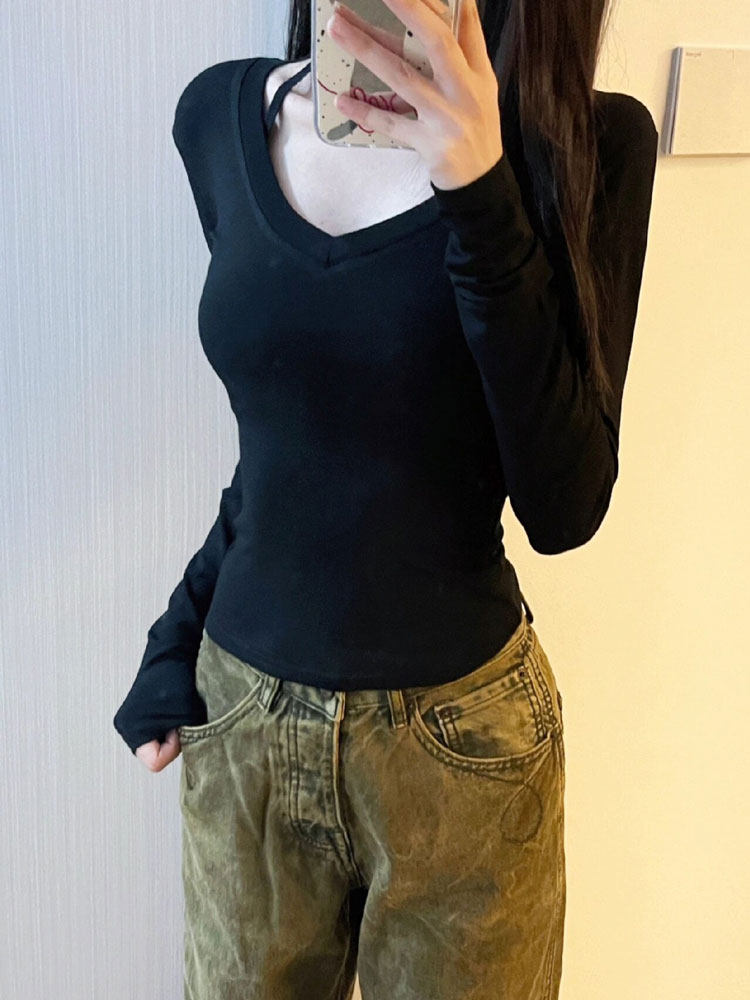 Черный демисезонный лонгслив, рубашка, V-образный вырез, облегающий крой