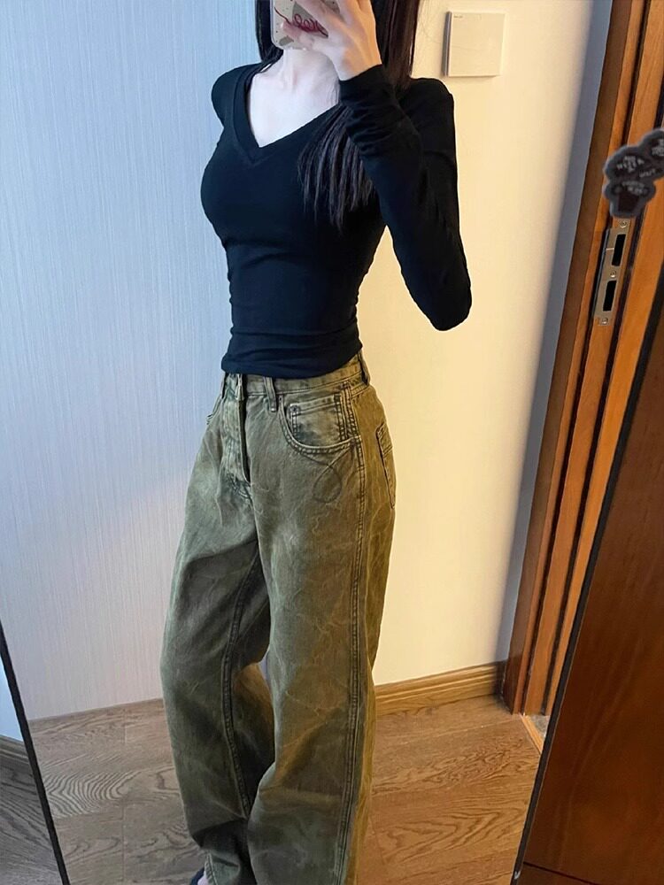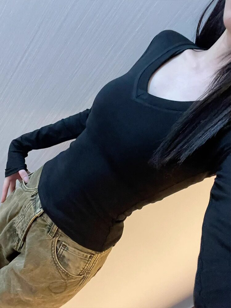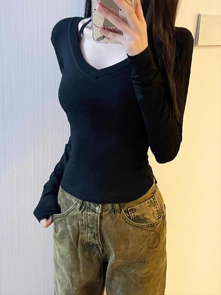 Бархатный базовый приятный телу демисезонный черный лонгслив, приталенный утепленный корсет, V-образный вырез, в обтяжку