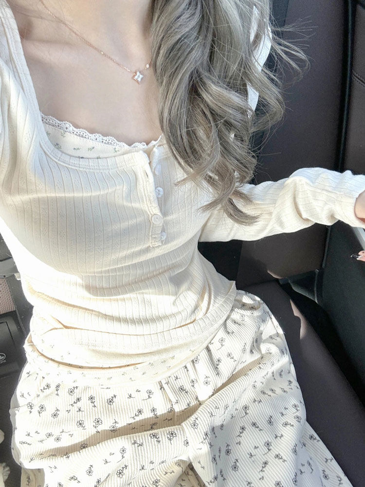 Кружевной базовый приятный телу комплект, демисезонный лонгслив, коллекция 2023, цветочный принт
