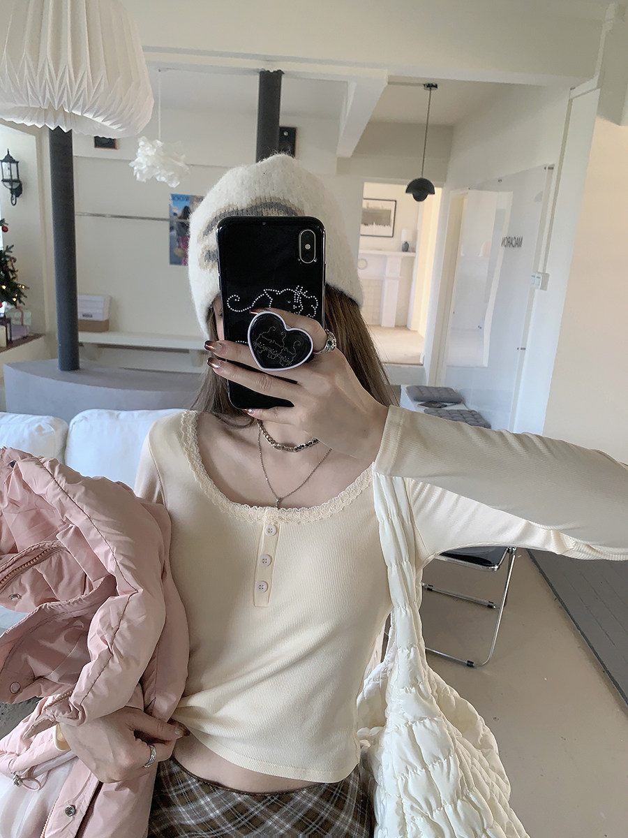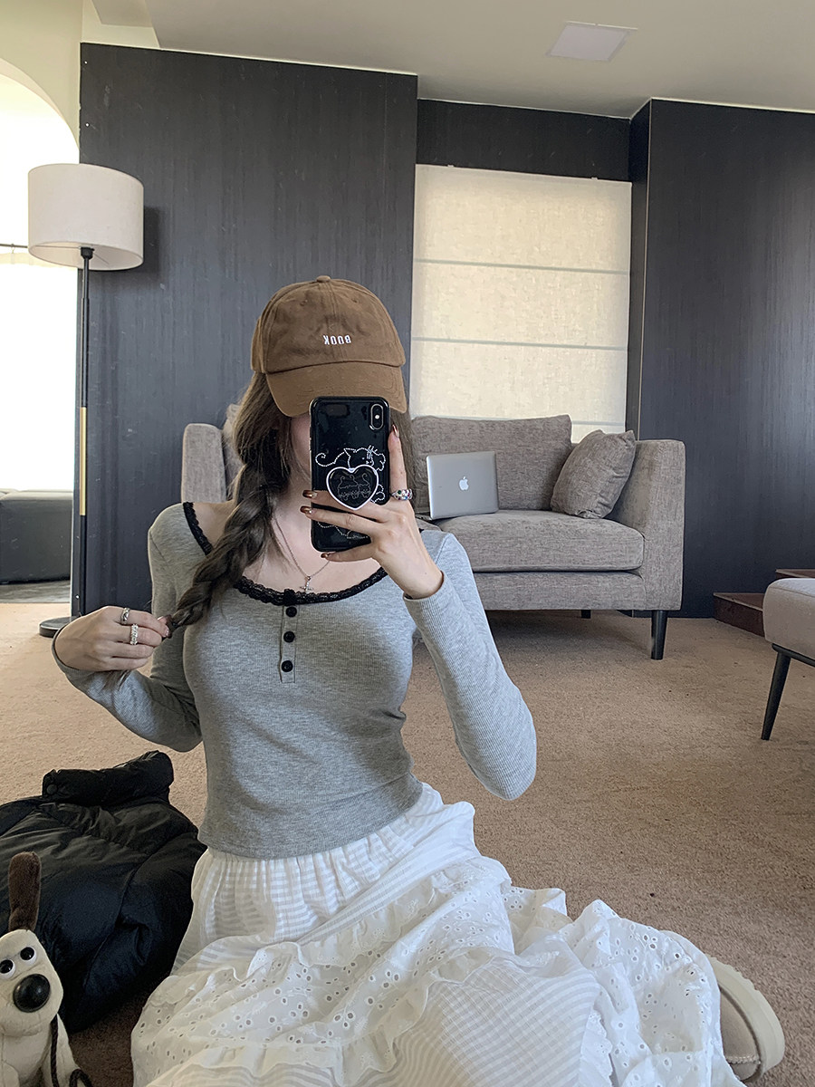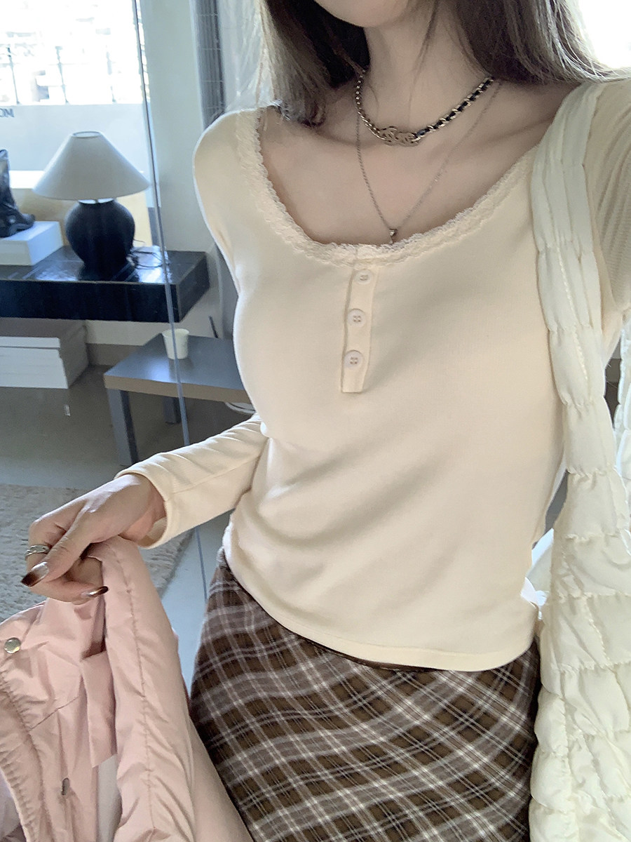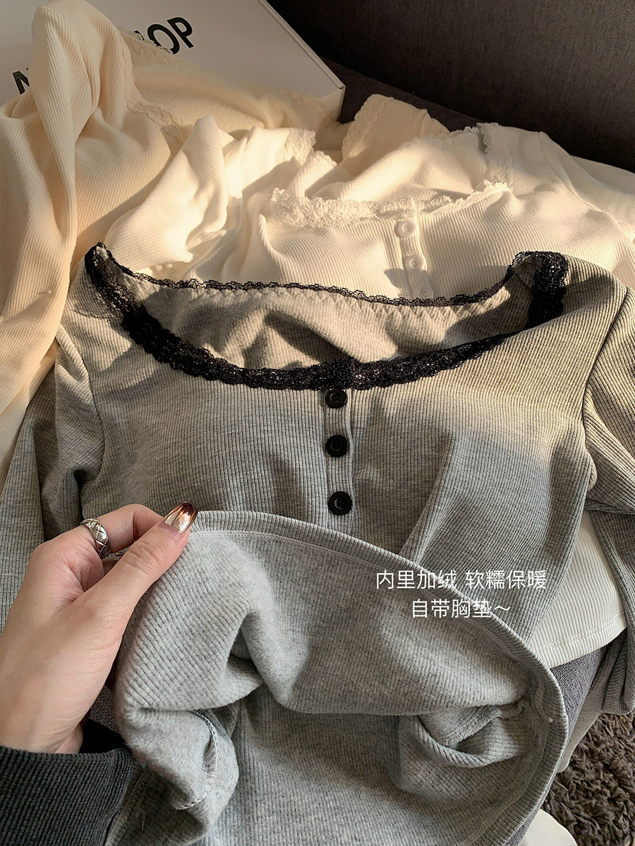 Кружевная утепленная демисезонная футболка, короткий базовый приятный телу топ с чашечками, кружевное платье