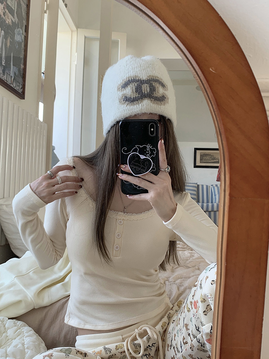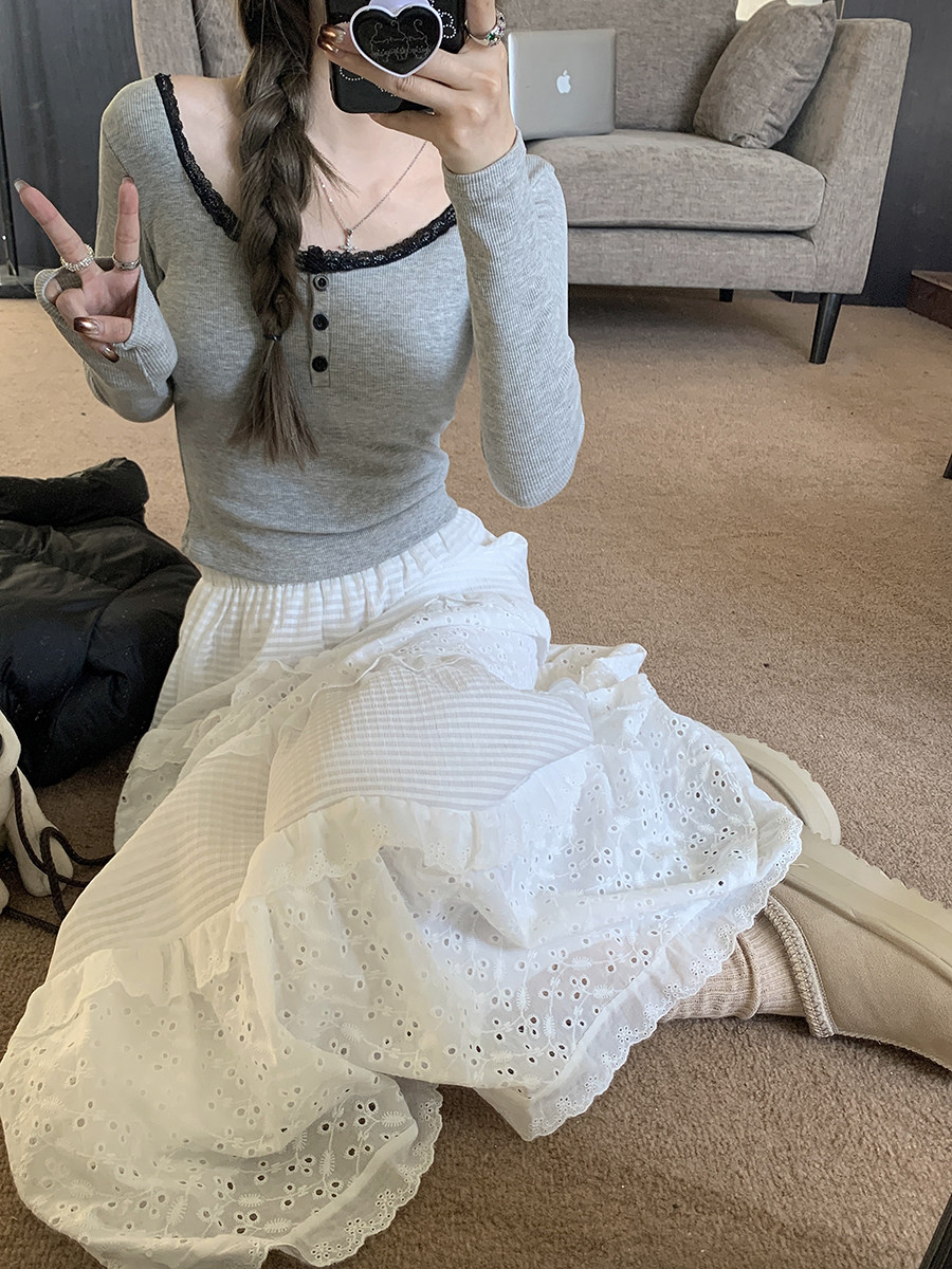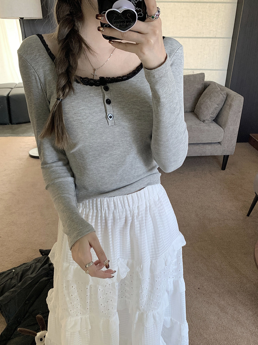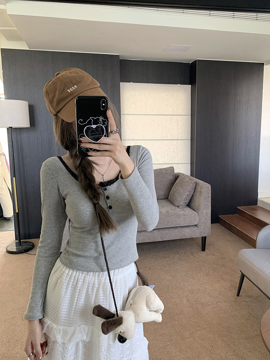 Кружевная утепленная демисезонная футболка, короткий базовый приятный телу топ с чашечками, кружевное платье