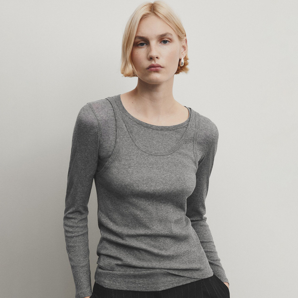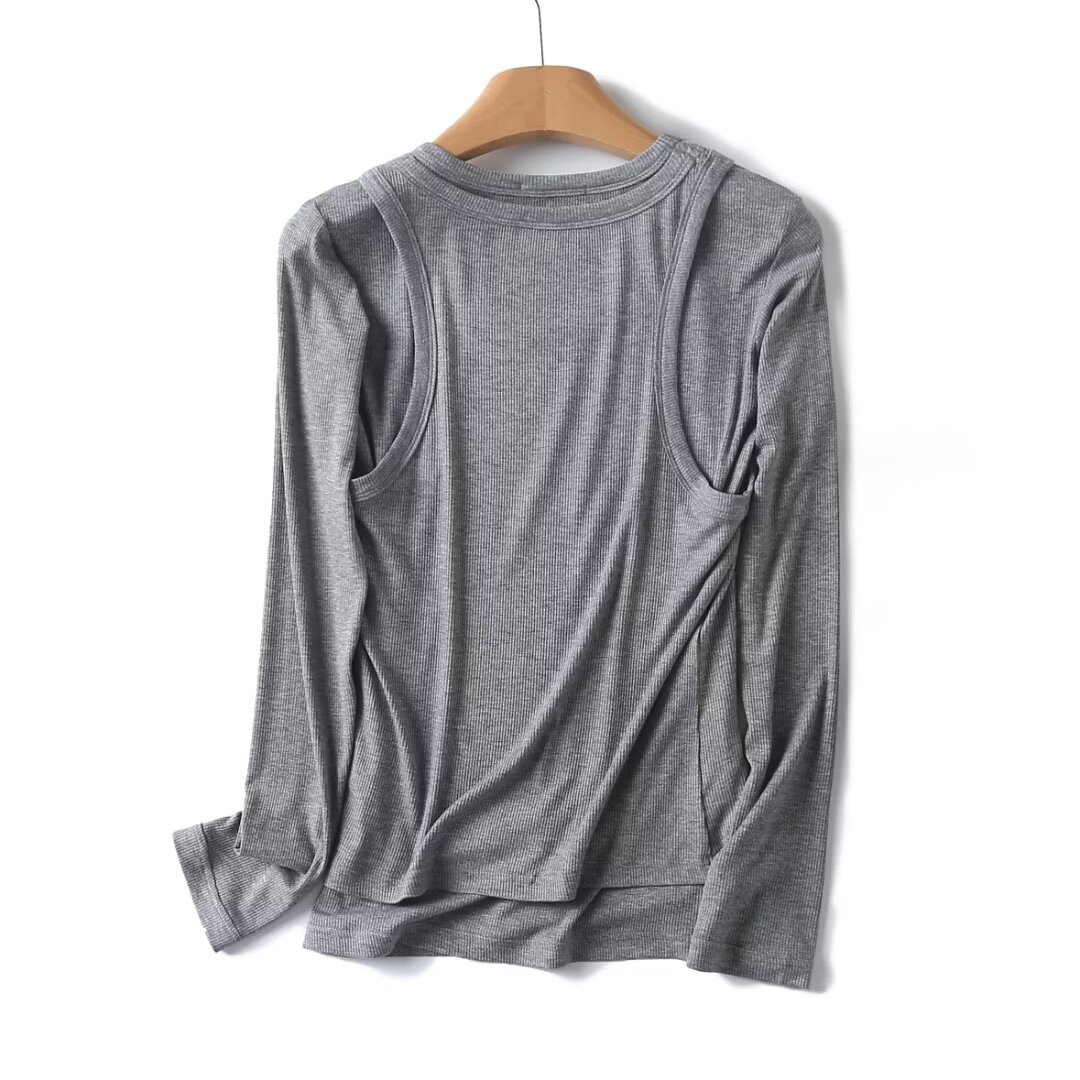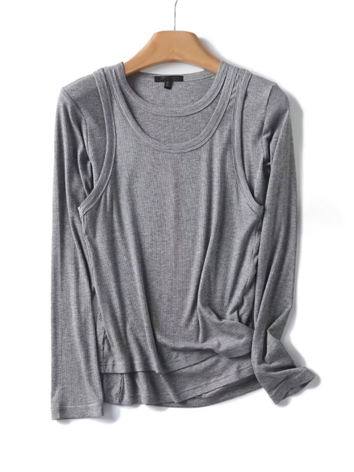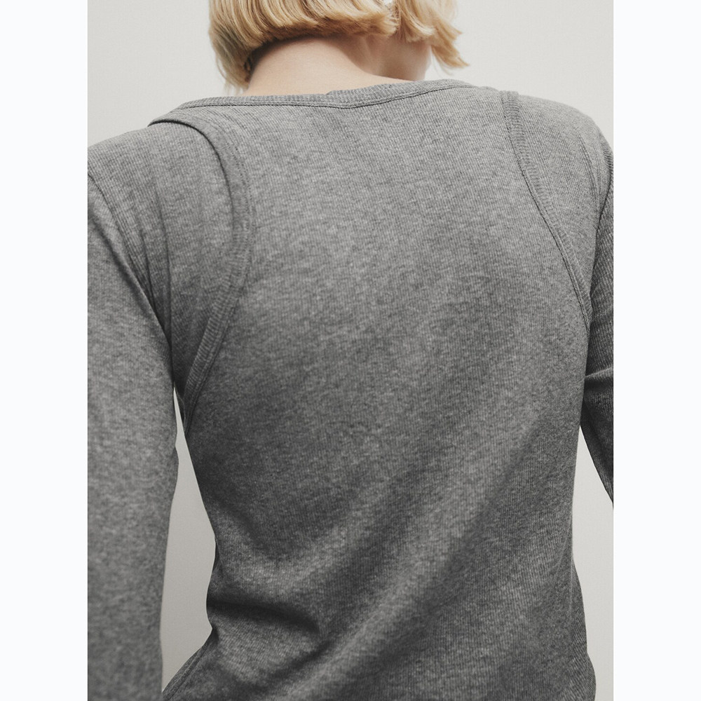 Женская серая двухслойная трикотажная футболка с длинными рукавами и круглым вырезом в рубчик внутри, 06898755802