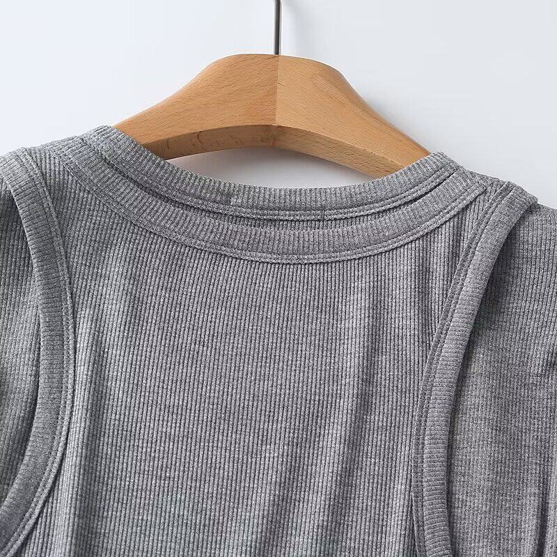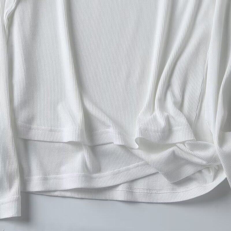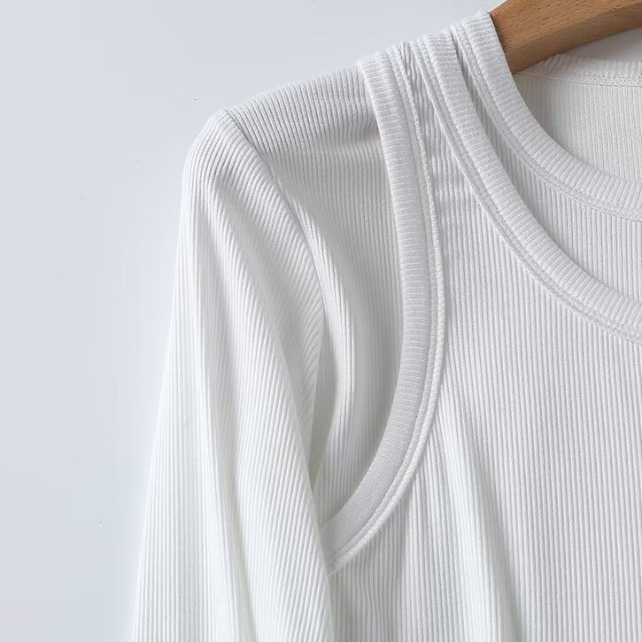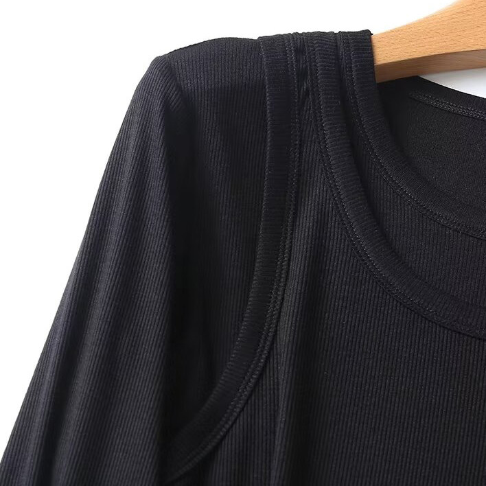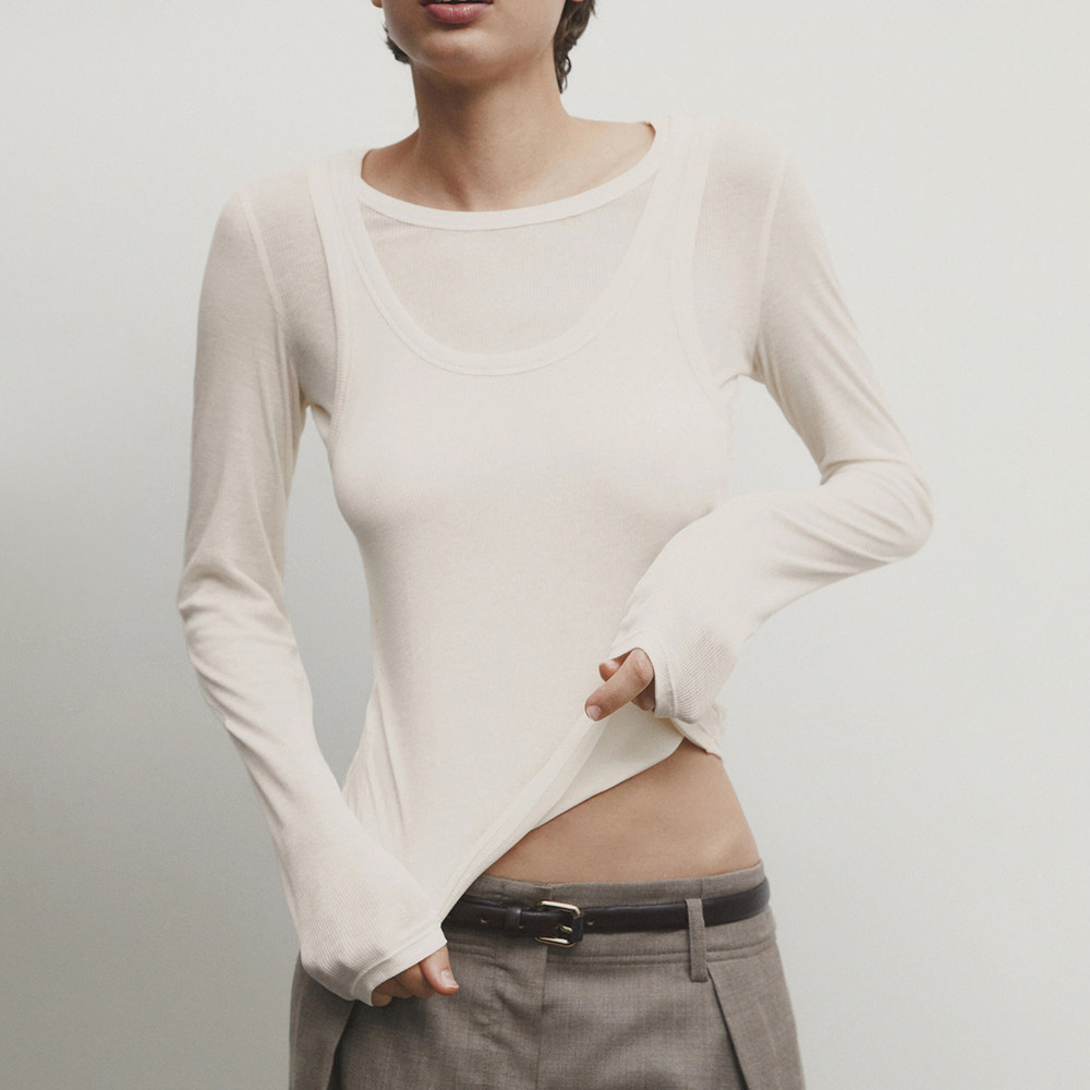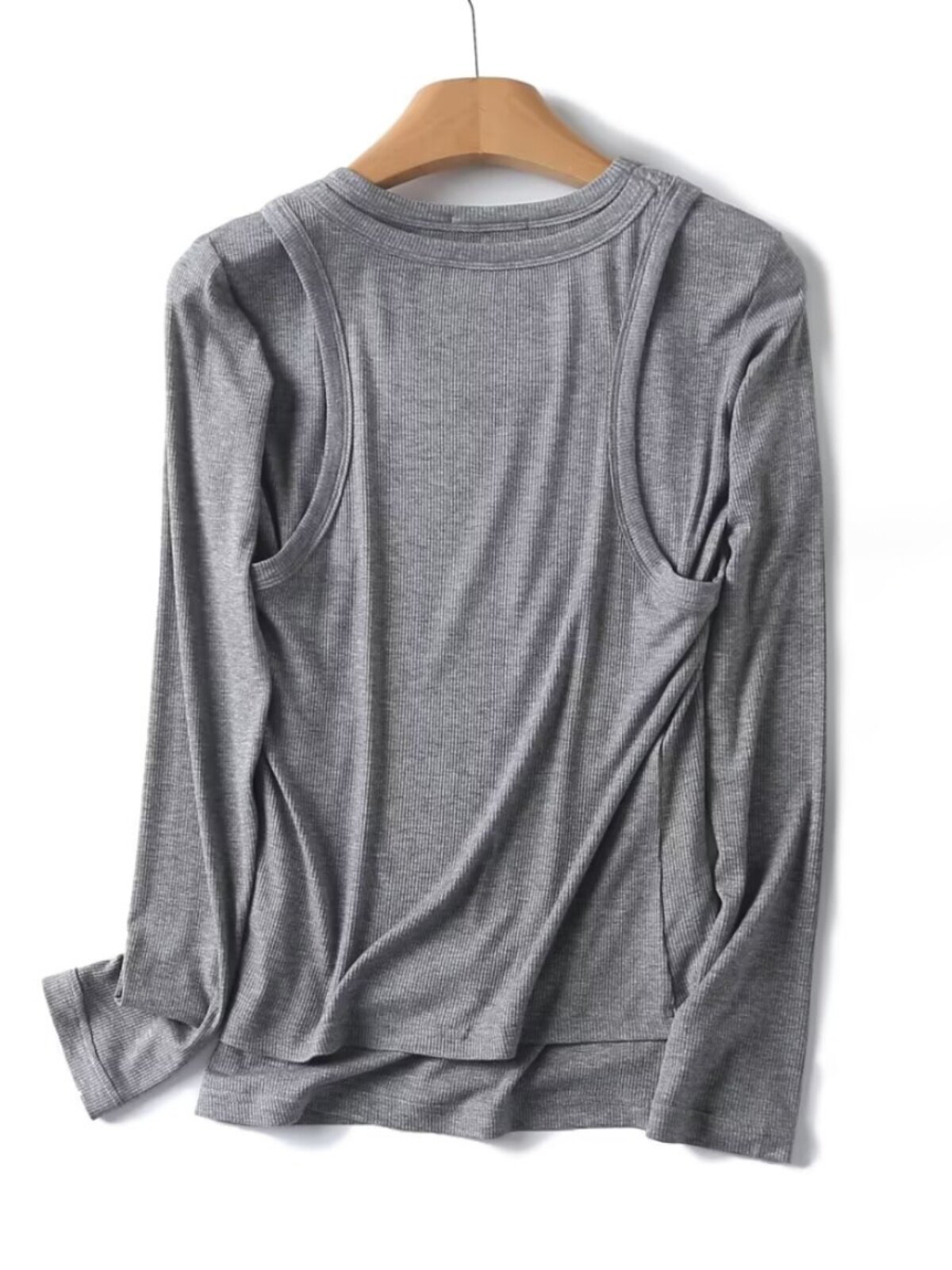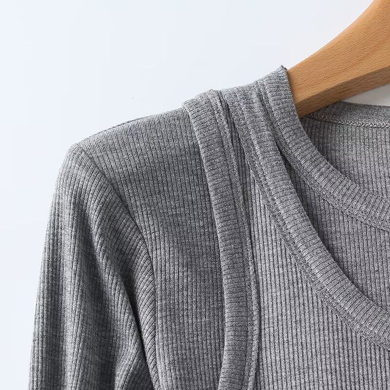Женская серая двухслойная трикотажная футболка с длинными рукавами и круглым вырезом в рубчик внутри, 06898755802
