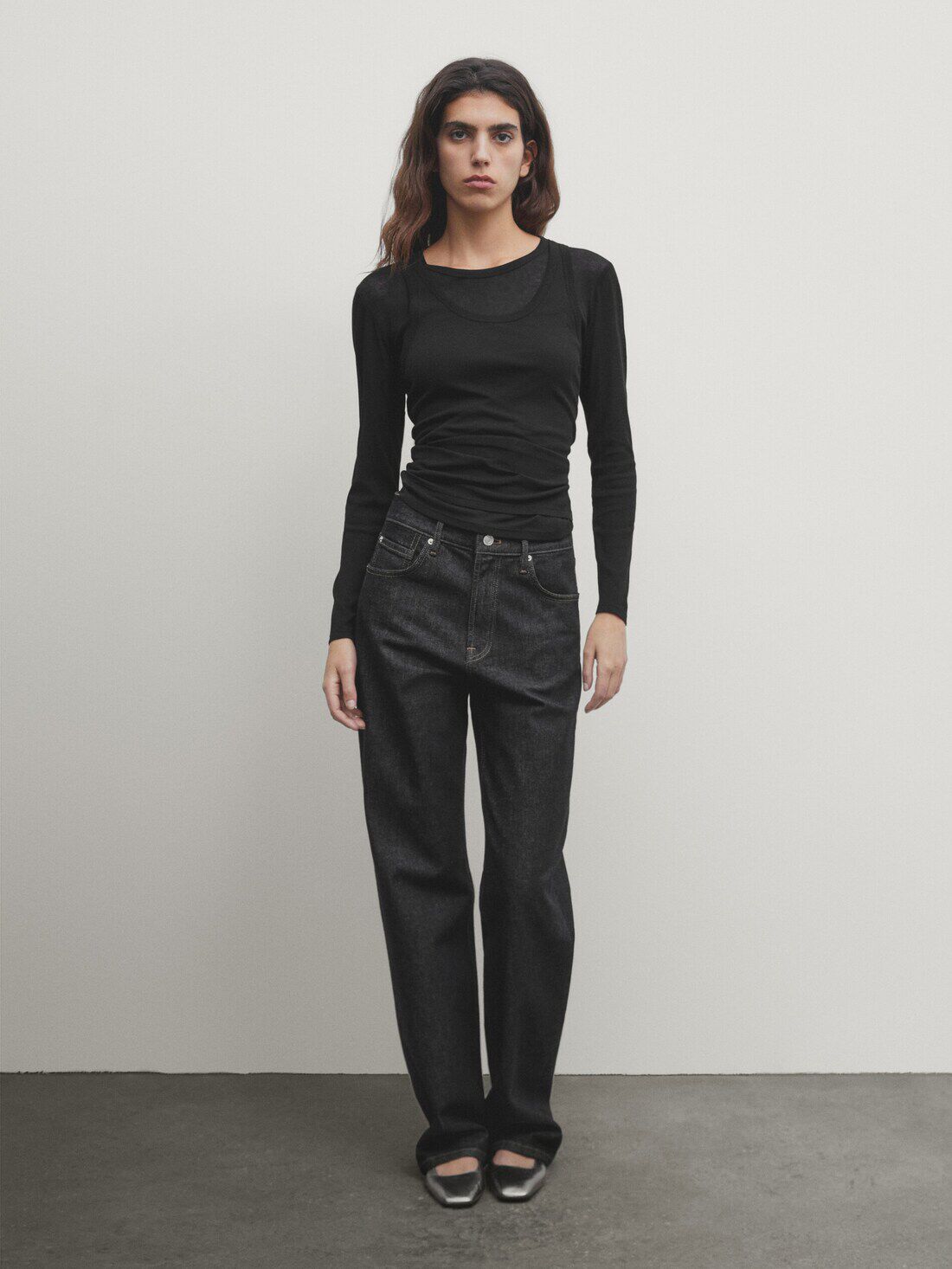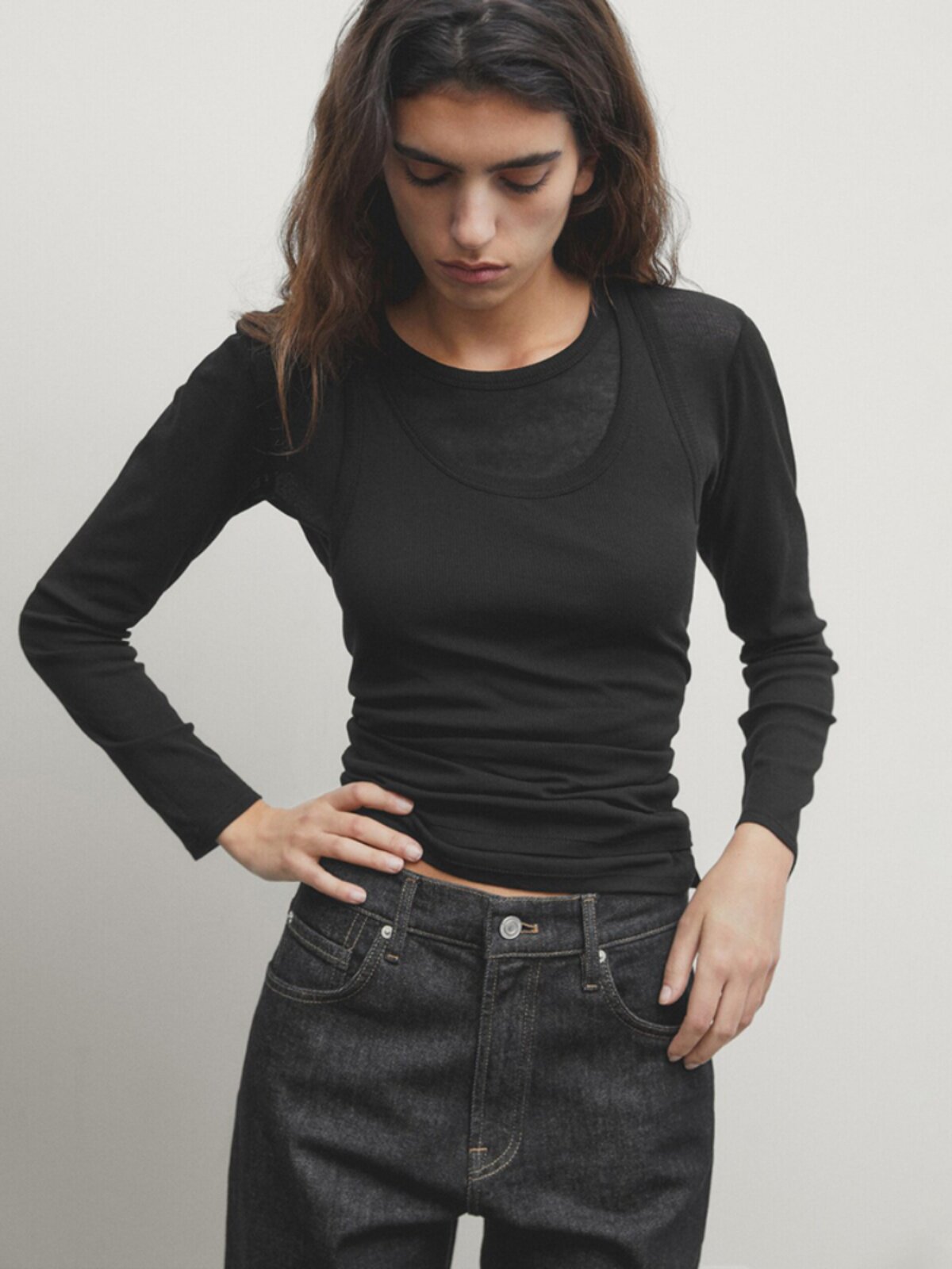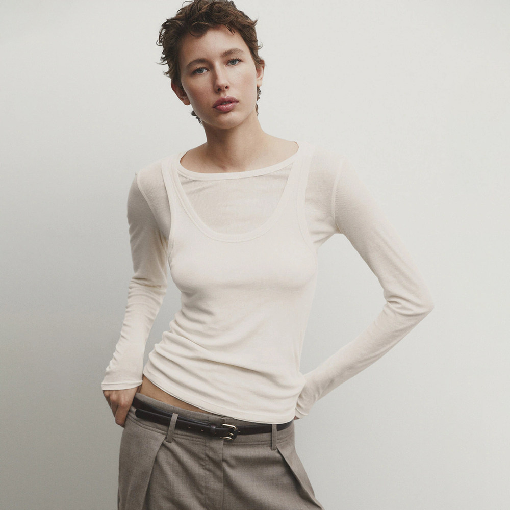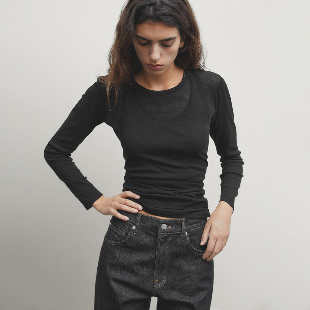 Женская серая двухслойная трикотажная футболка с длинными рукавами и круглым вырезом в рубчик внутри, 06898755802
