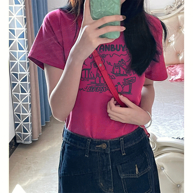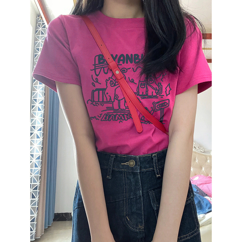 Футболка с короткими рукавами и короткими рукавами для женщин с фруктами дракона, розово-красная, 2025, новый горячий стиль, утягивающий топ с половиной рукавов из чистого хлопка с буквами