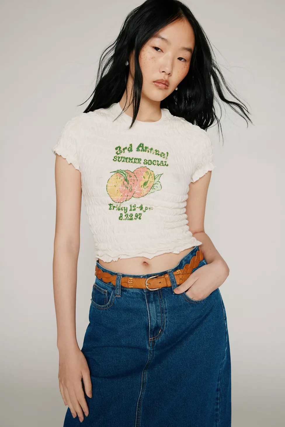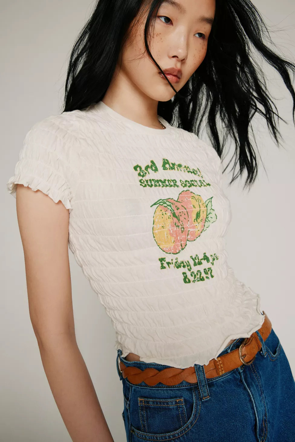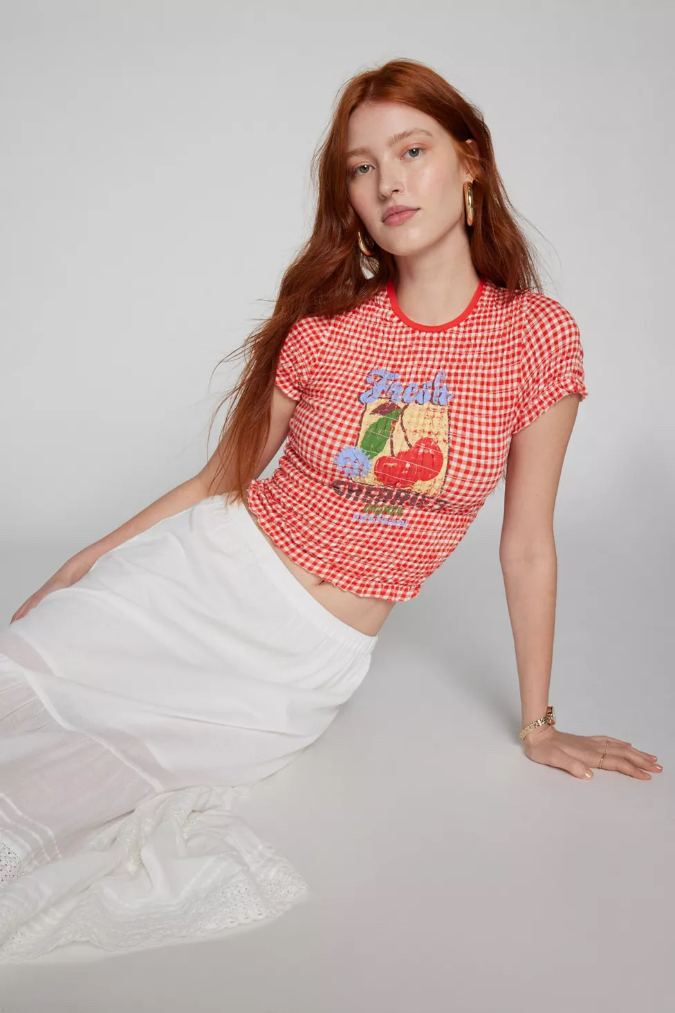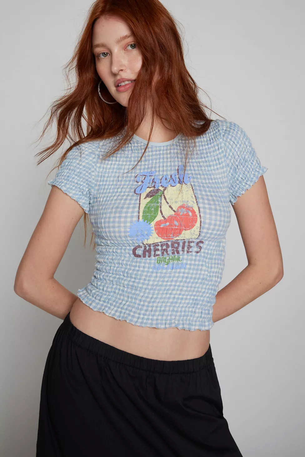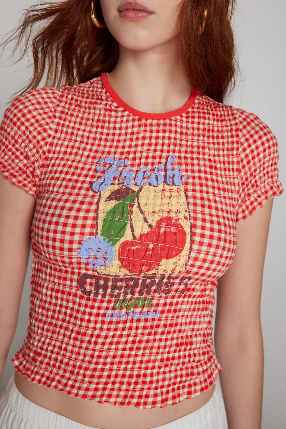 Скидка uo kimchi Blue Cotton Cotton Fold Pill Make Old Cherry Print с коротким рукавом топ