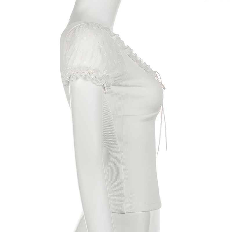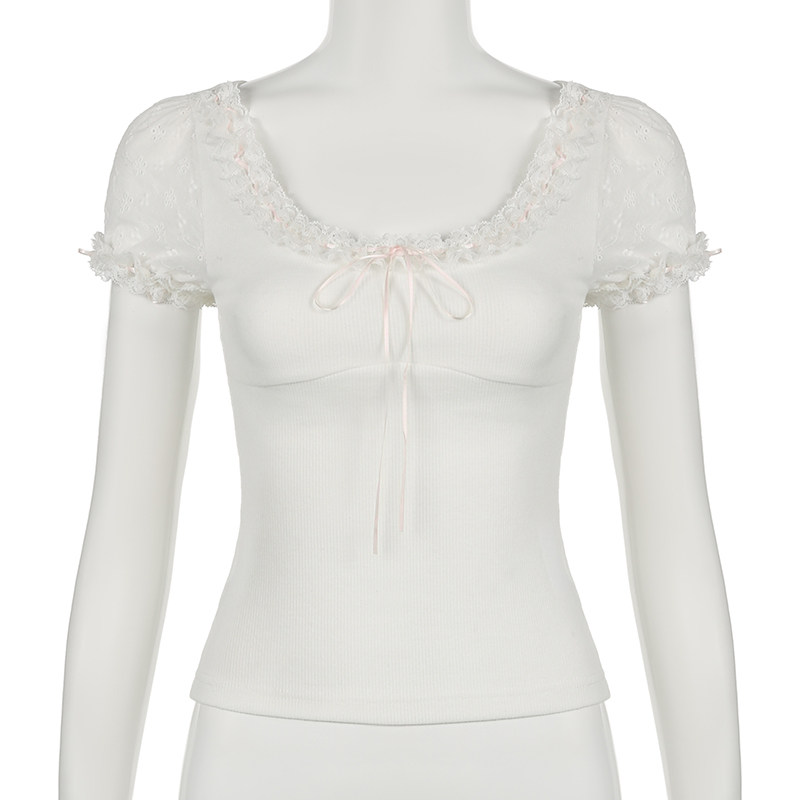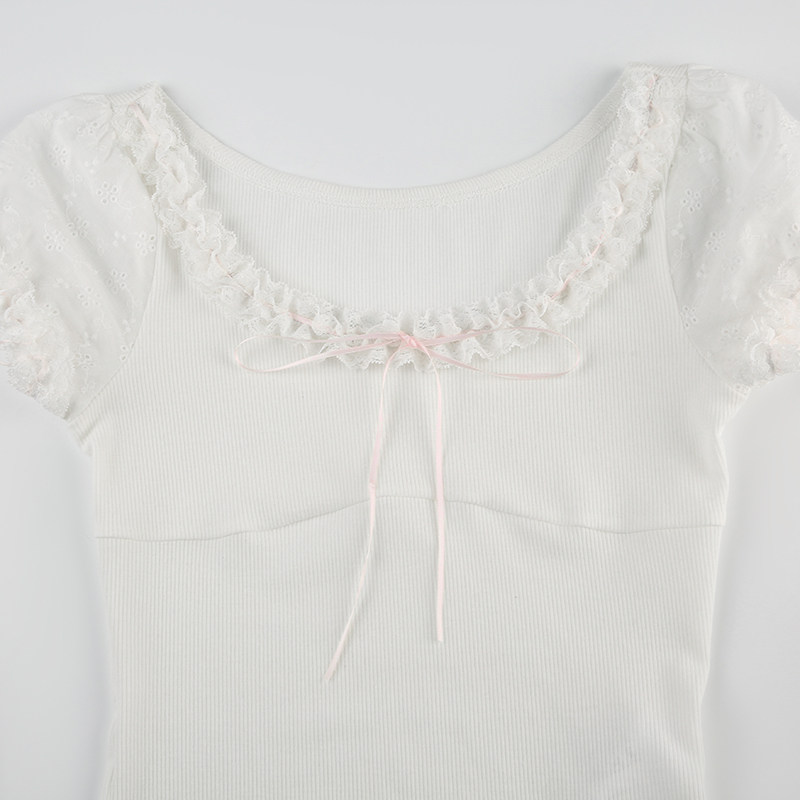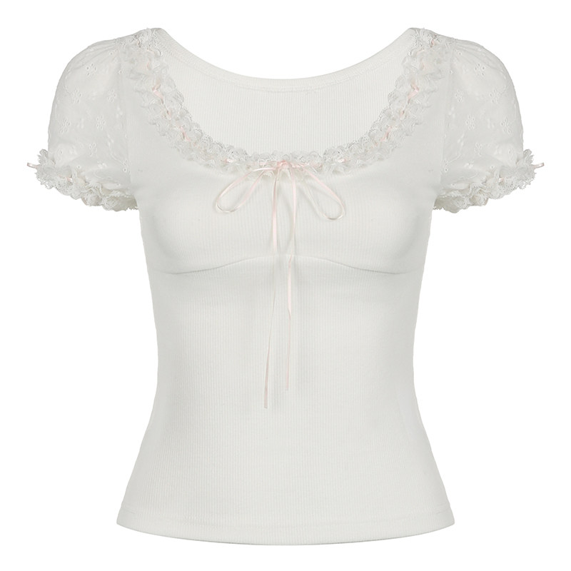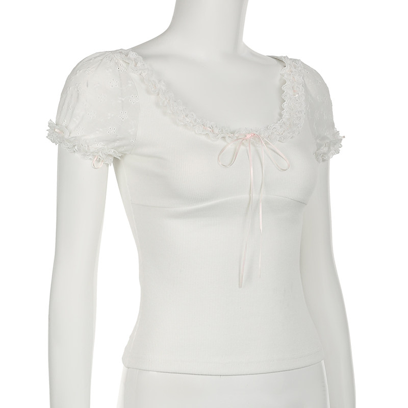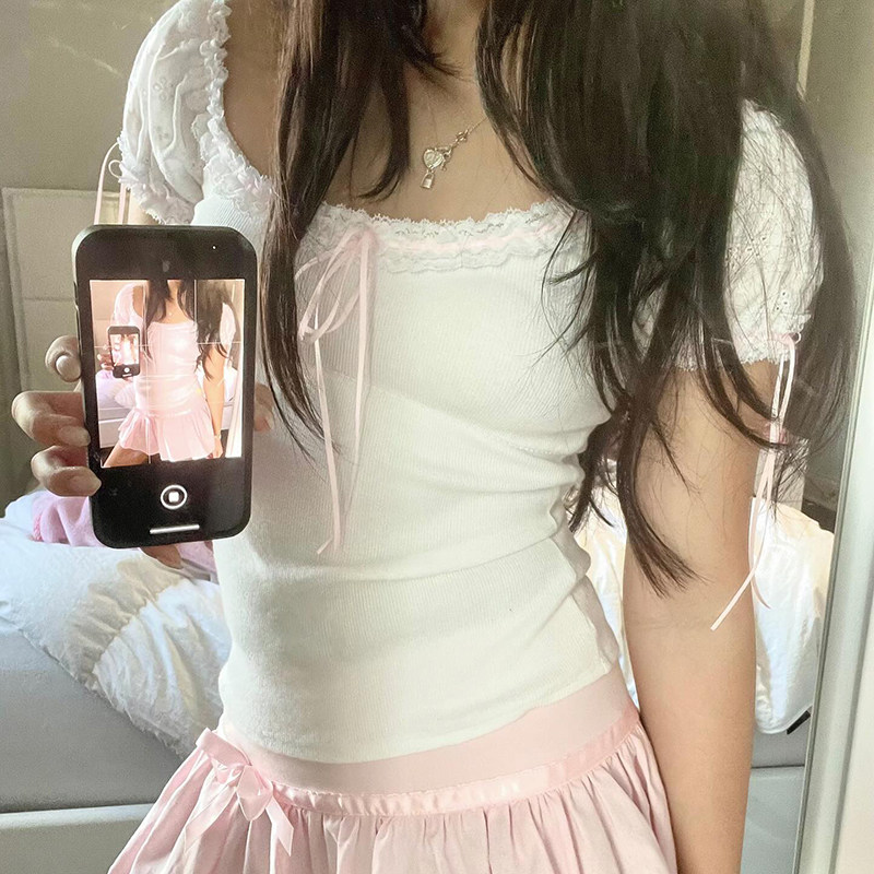 [WEEKEEP【日系少女】纯欲甜美可爱花边缎带修身短袖休闲百搭上衣]