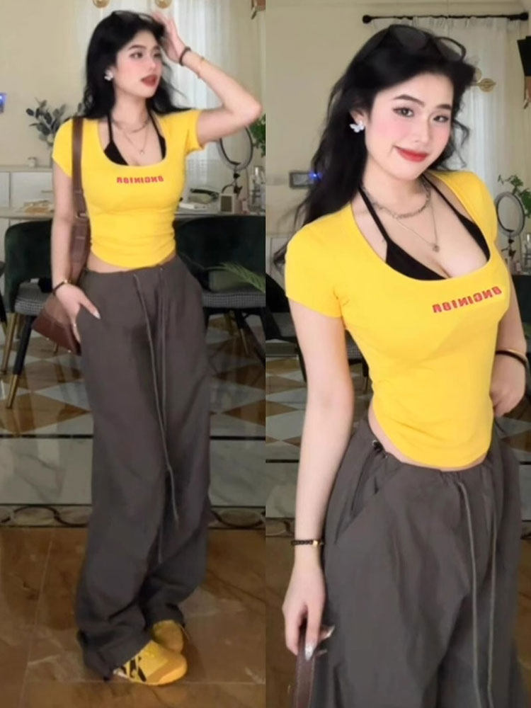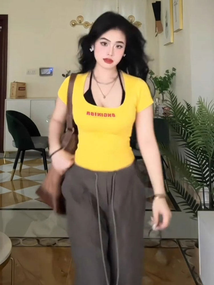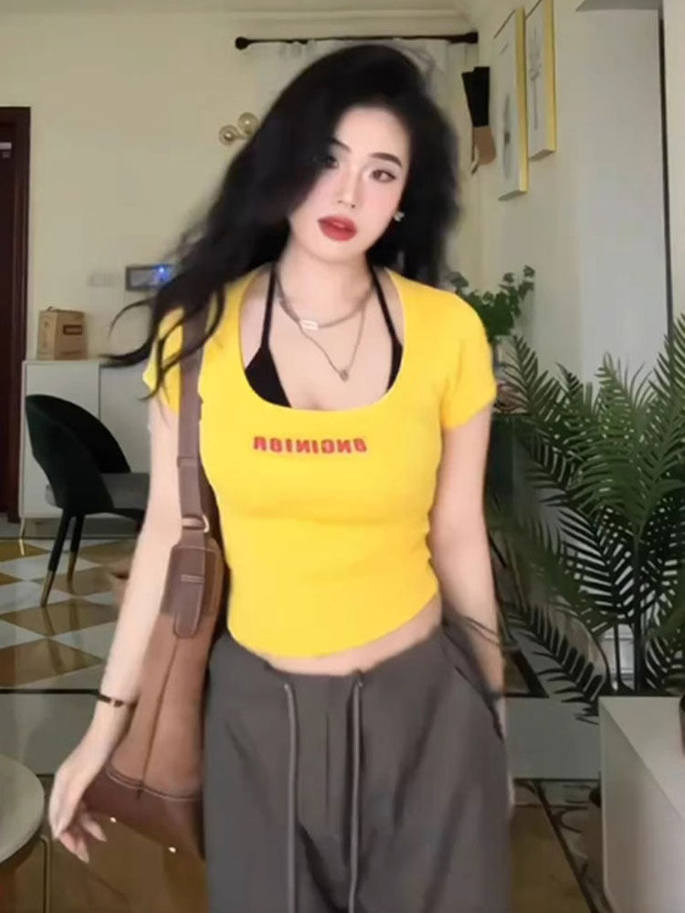Желтая летняя короткая футболка с коротким рукавом, в американском стиле, в обтяжку
