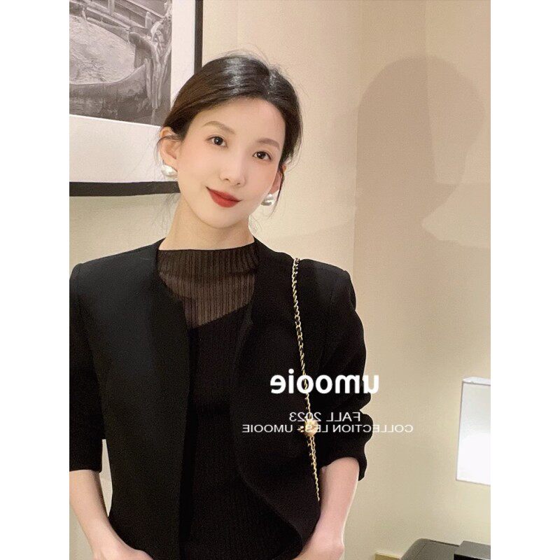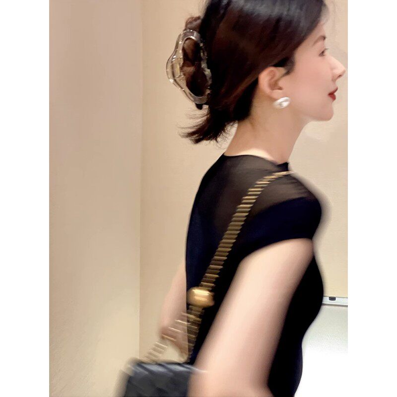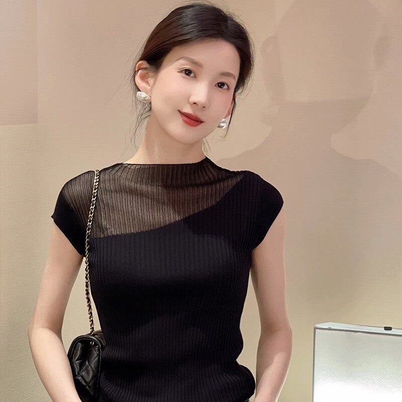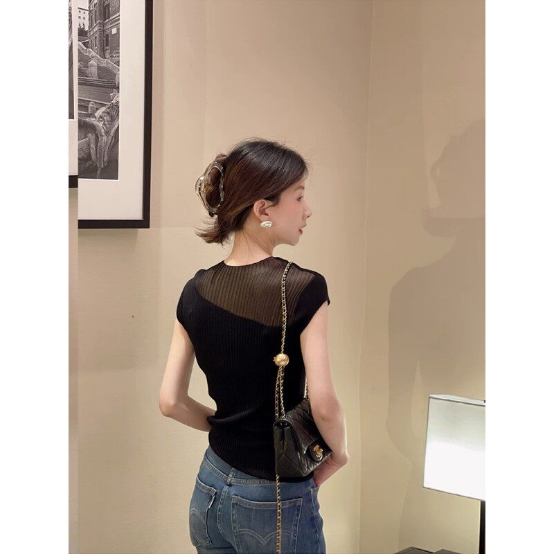 Черный трикотажный свитер, шелковая тонкая футболка с коротким рукавом без рукавов, французский стиль, изысканный стиль