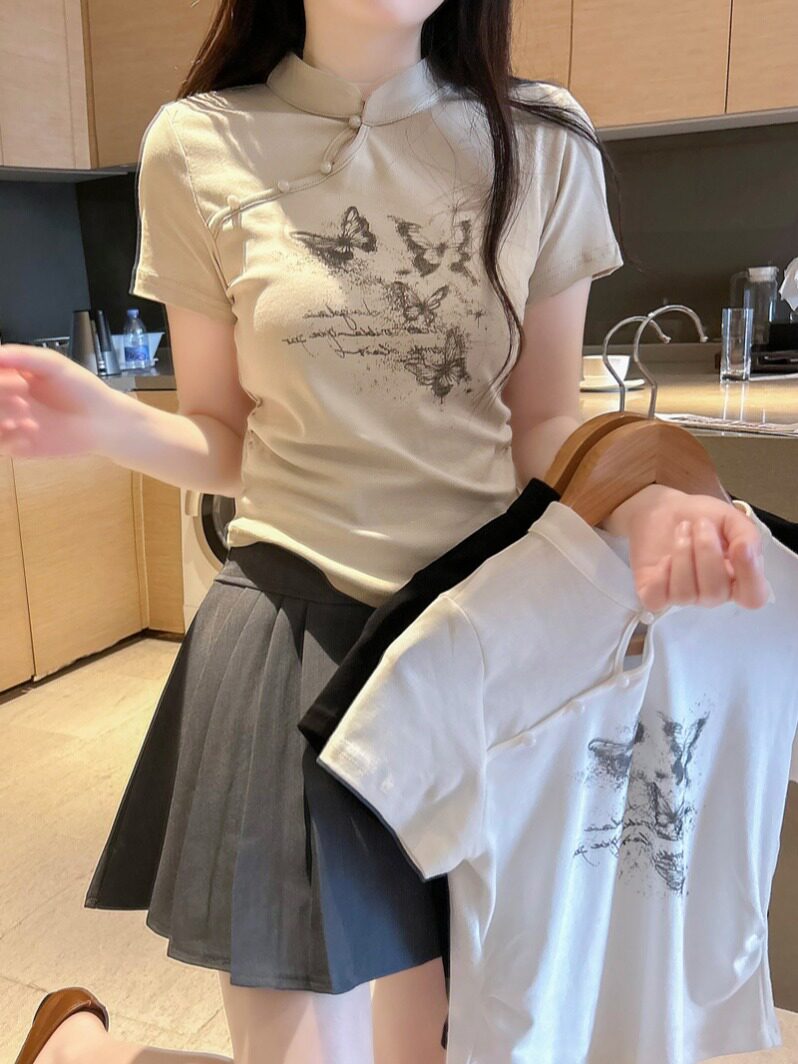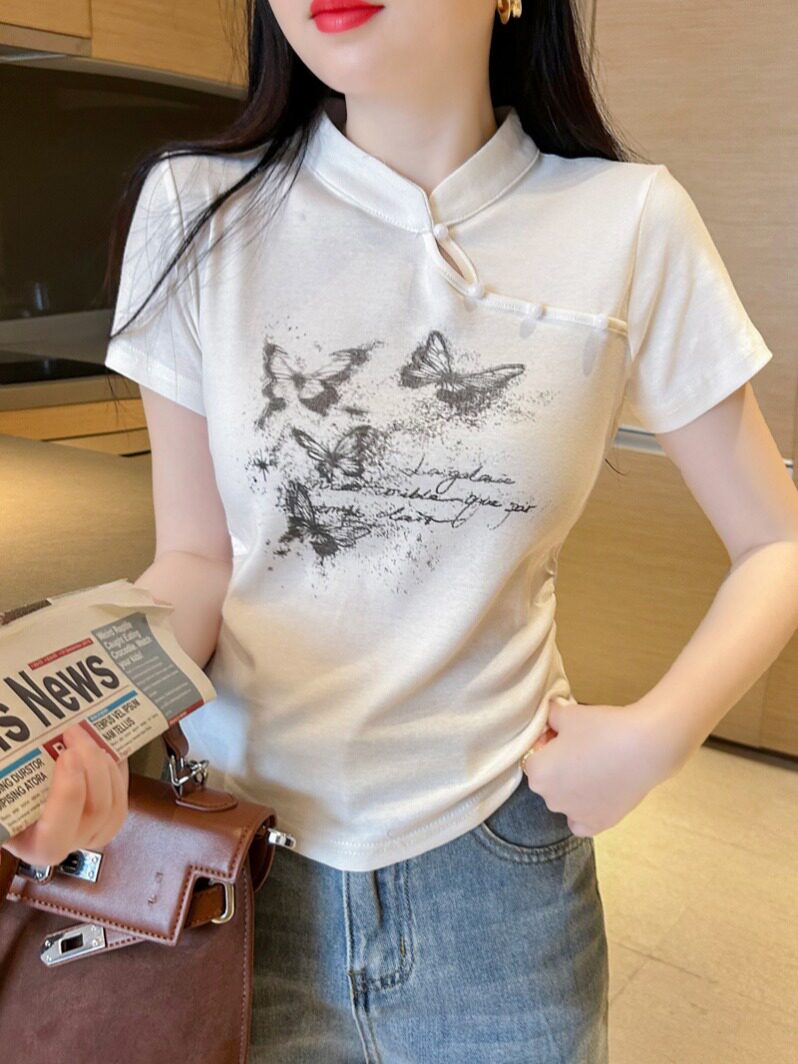 Ретро шелковая хлопковая осенняя короткая футболка с коротким рукавом, китайский стиль, 2024 года