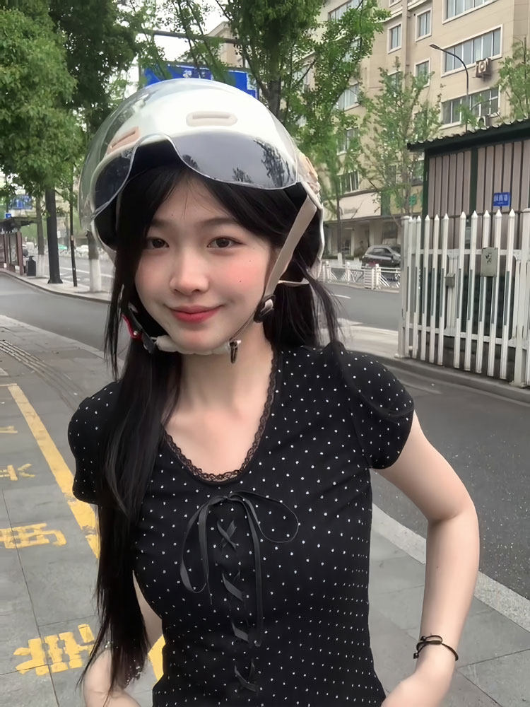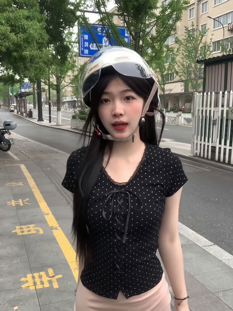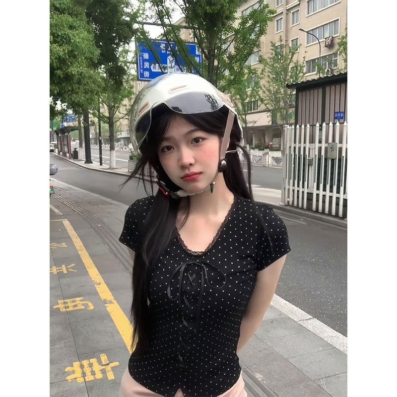 Кружевная летняя приталенная короткая футболка с бантиком, цветочный принт, V-образный вырез