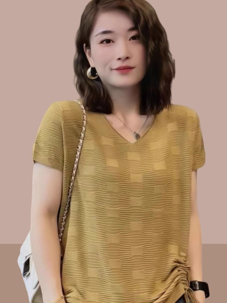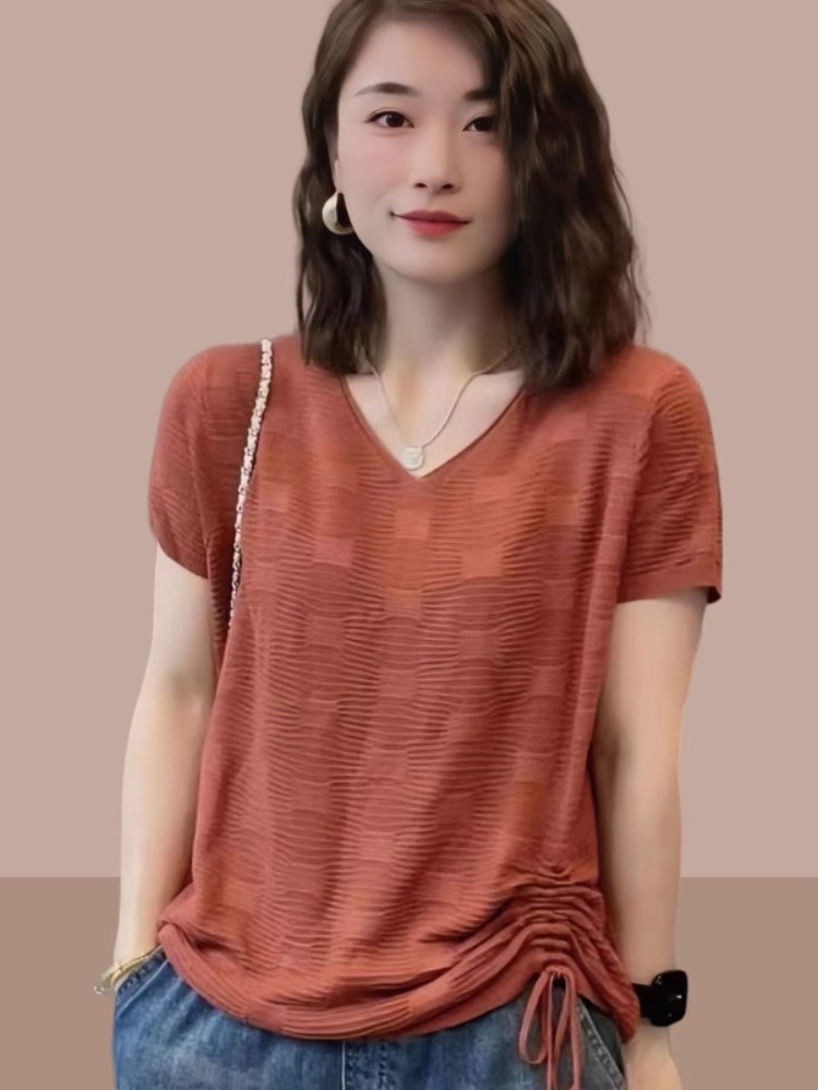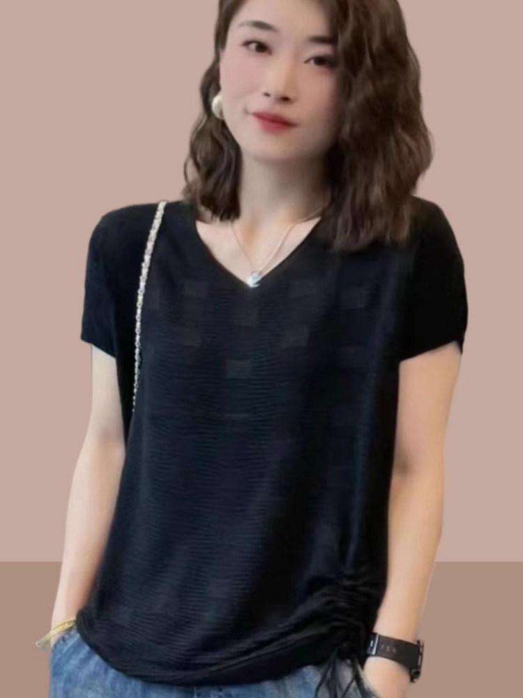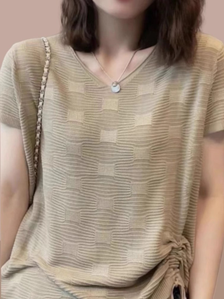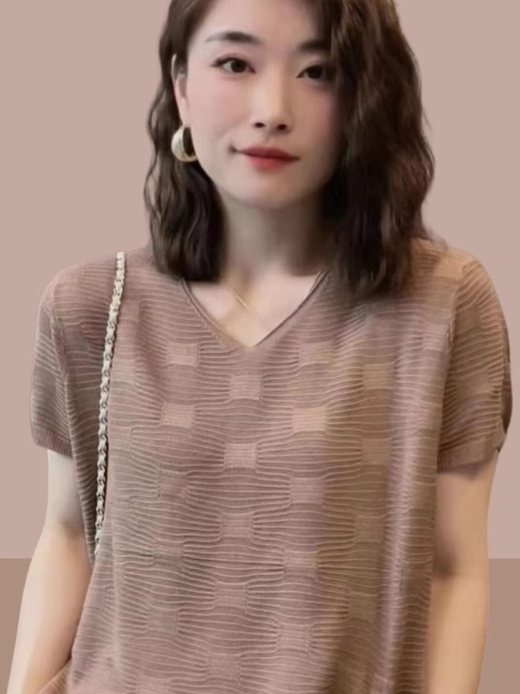 Летняя тонкая футболка, трикотажный свитер, оверсайз, свободный крой, V-образный вырез