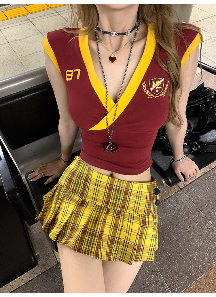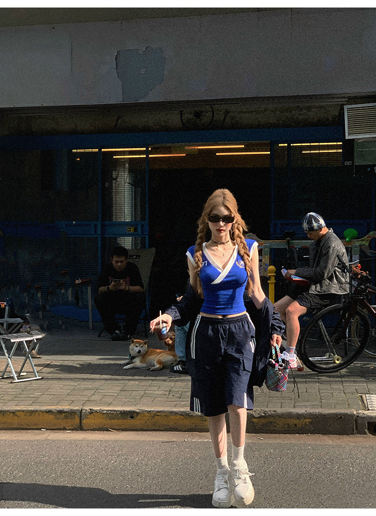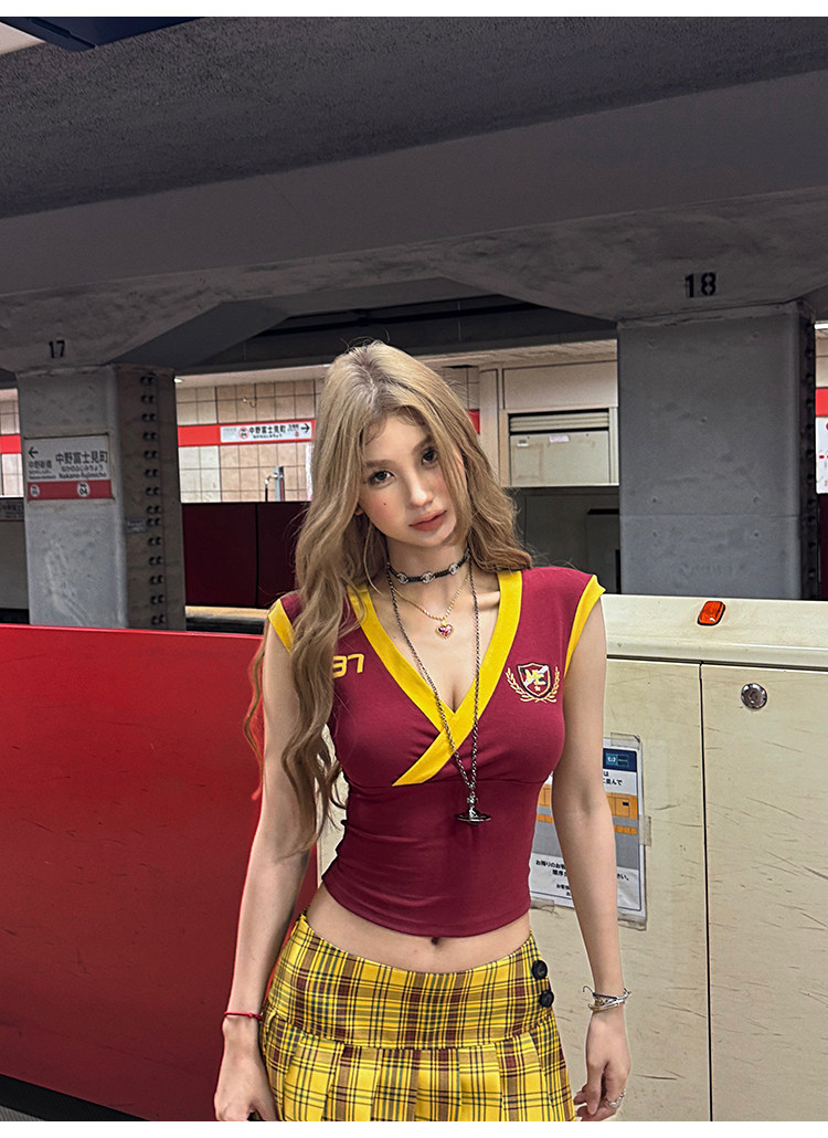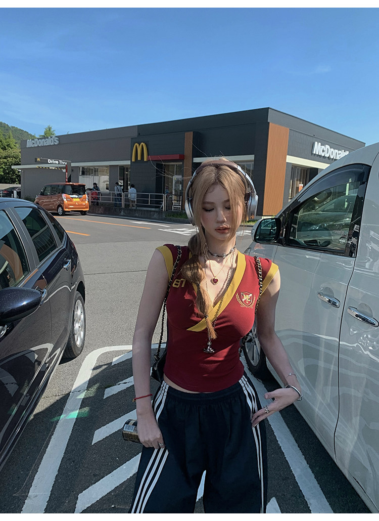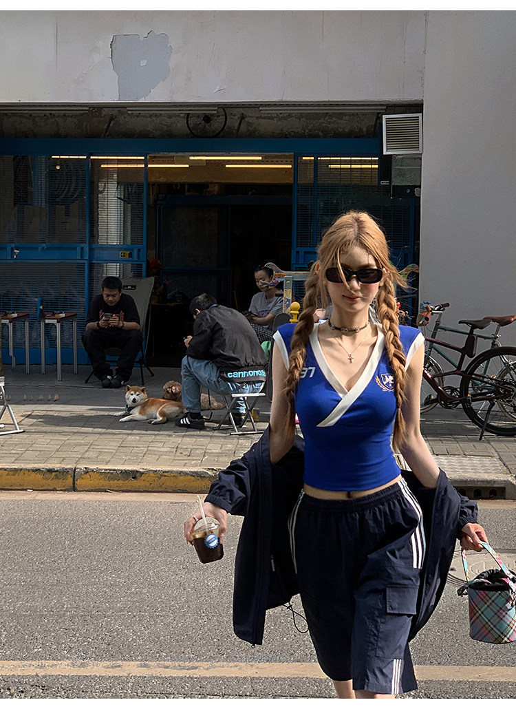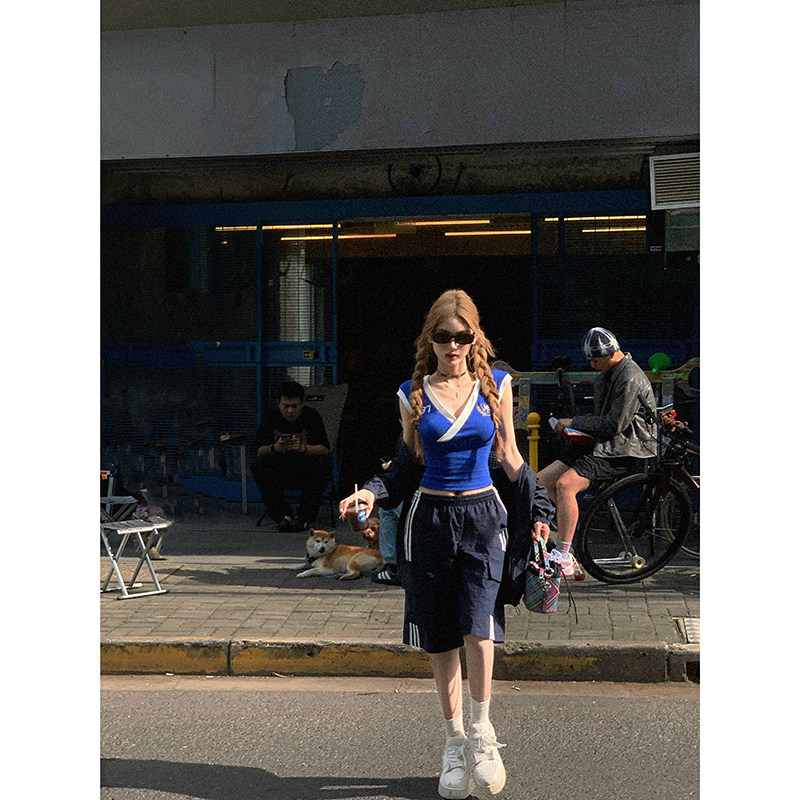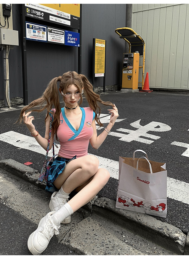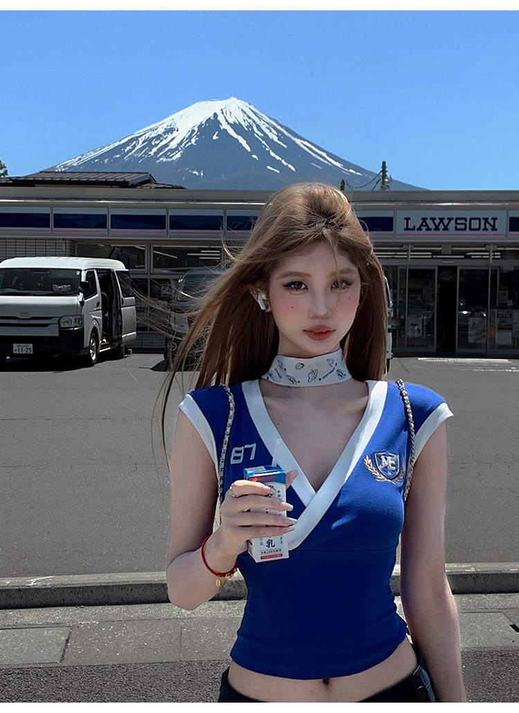 Tongiiuu Американский колледж красота американский ретро V-образный вышитый футболка для вышивки плеча Женская горячая девушка с обтягиванием талию стройное лето