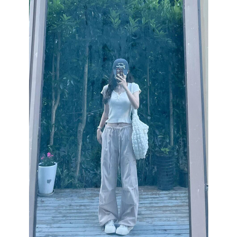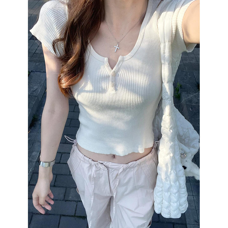 Белая приталенная дизайнерская короткая футболка, V-образный вырез, короткий рукав, тренд сезона