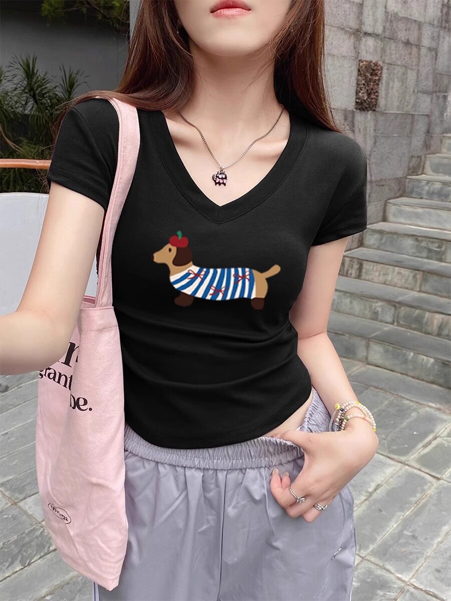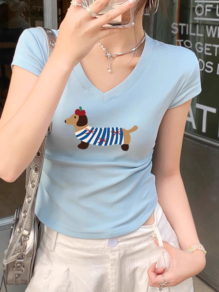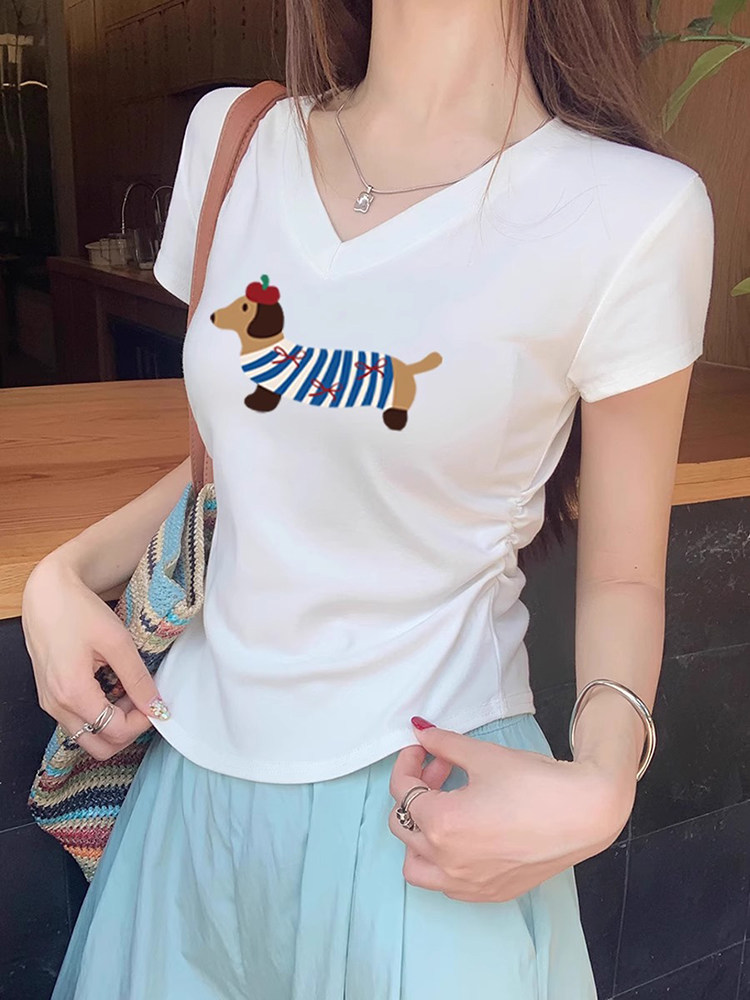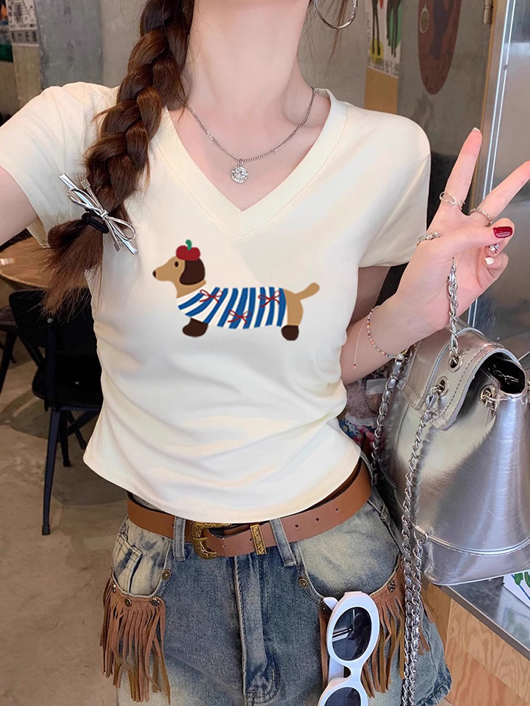 Белая летняя модная дизайнерская короткая футболка с коротким рукавом, V-образный вырез, городской стиль, в западном стиле, тренд сезона