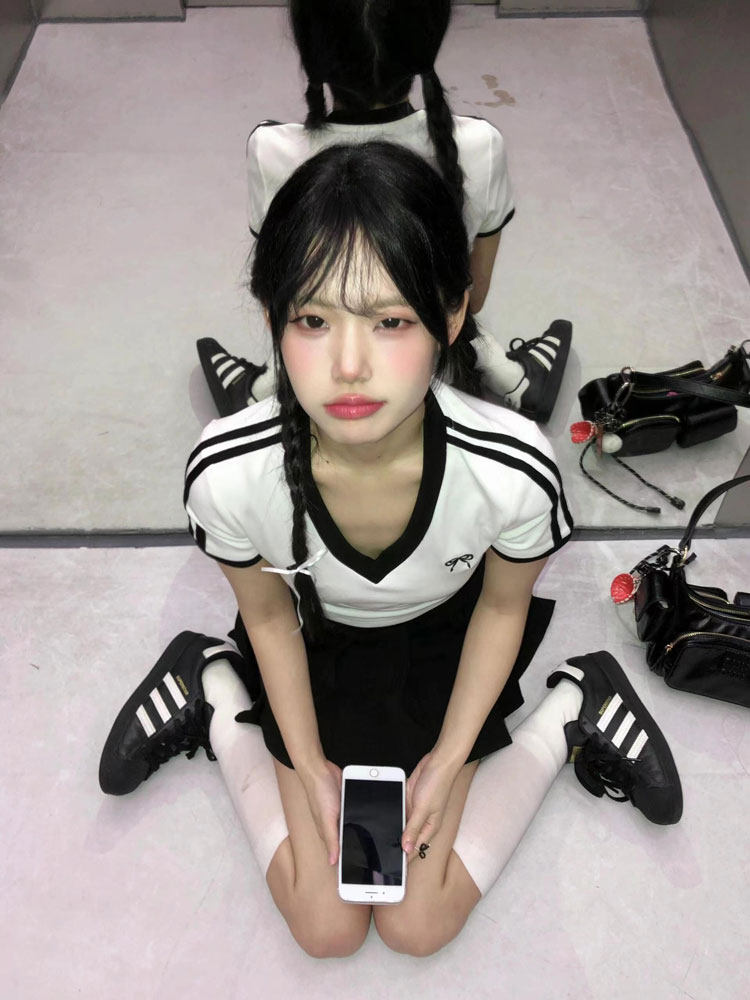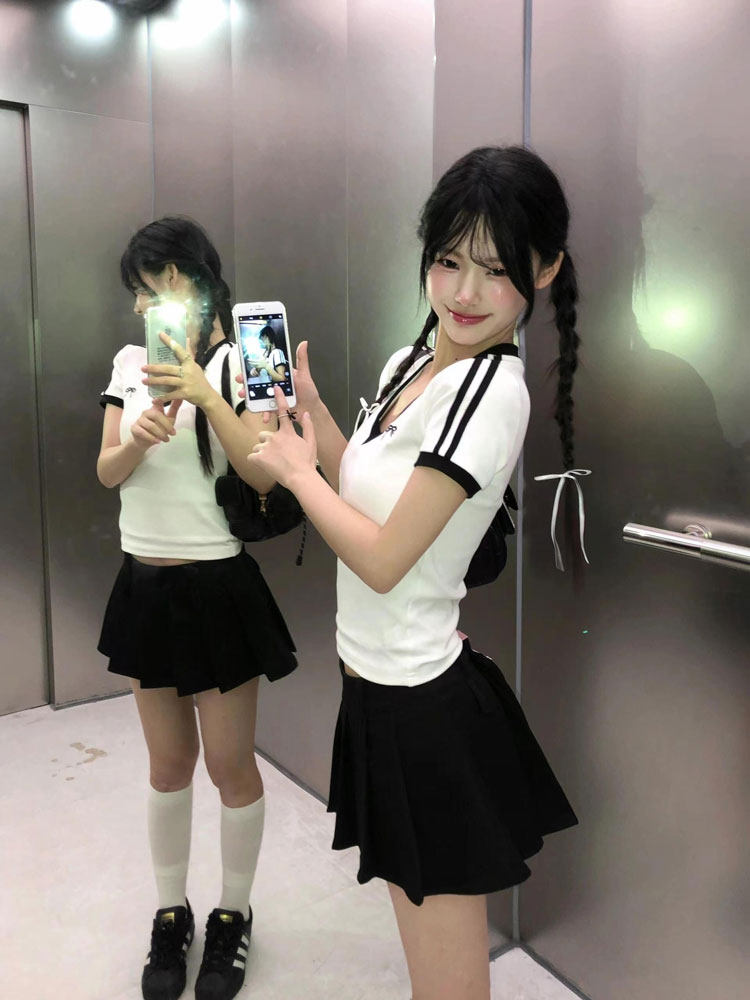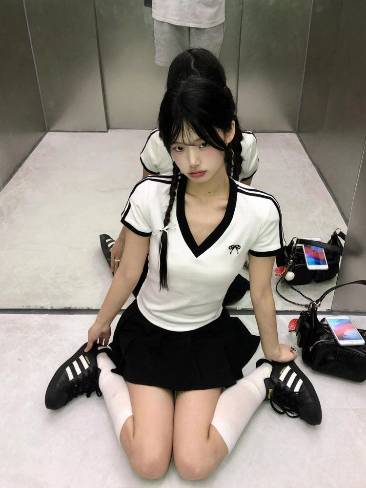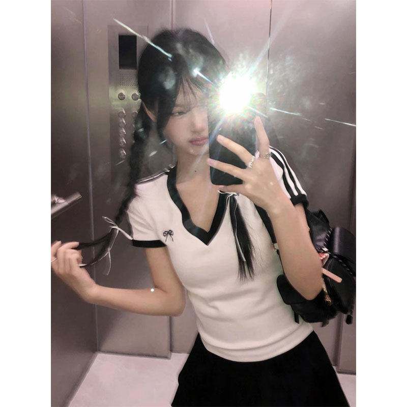 Белая летняя футболка с коротким рукавом, короткий корсет, V-образный вырез, облегающий крой