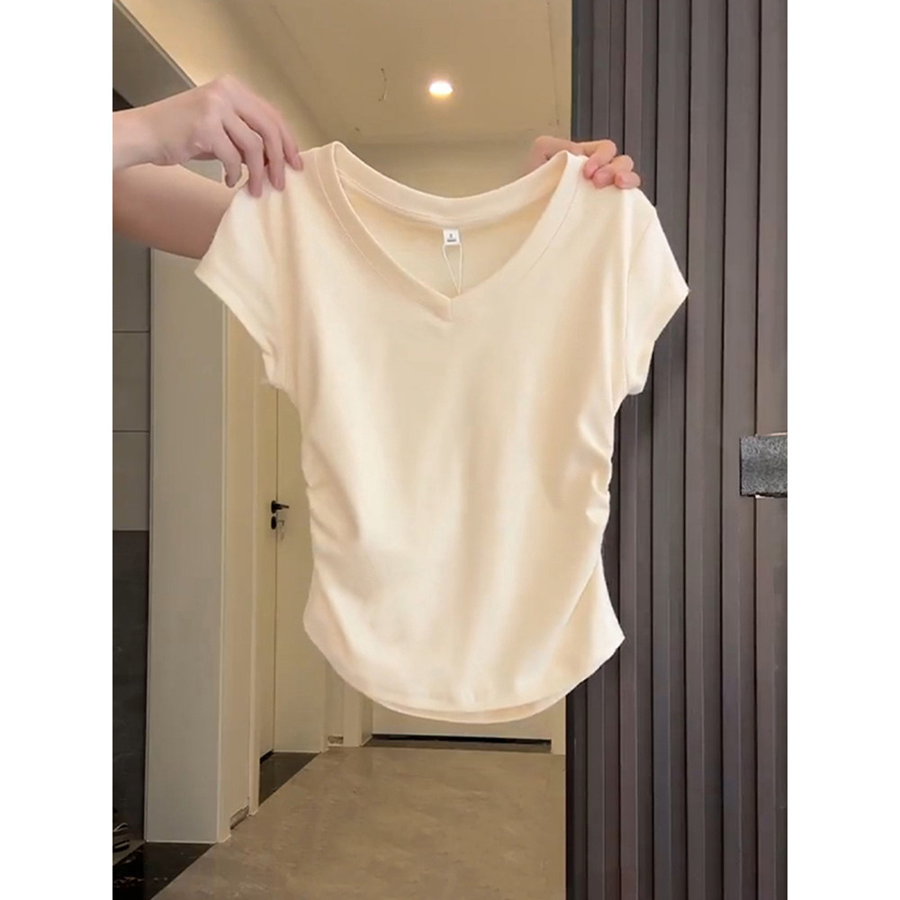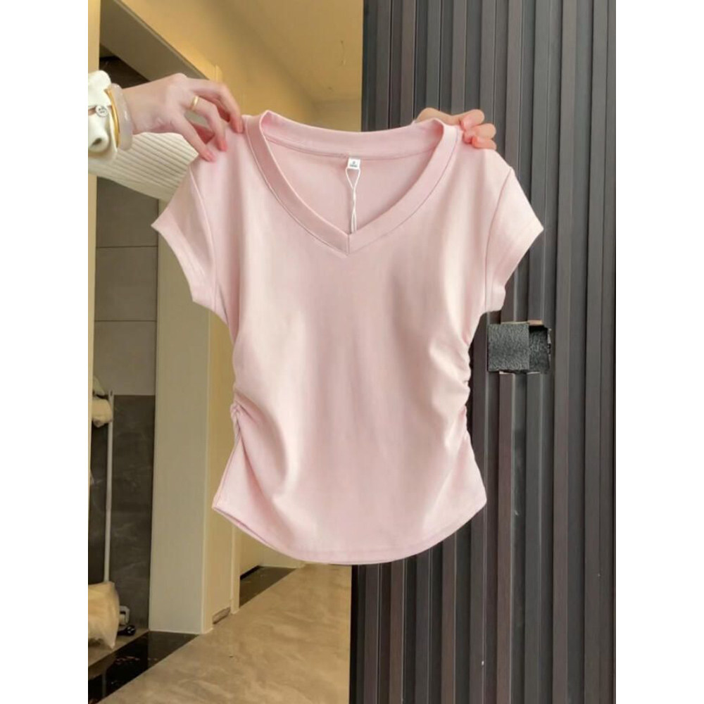 Синяя приталенная тонкая короткая дизайнерская футболка, V-образный вырез, тренд сезона, короткий рукав