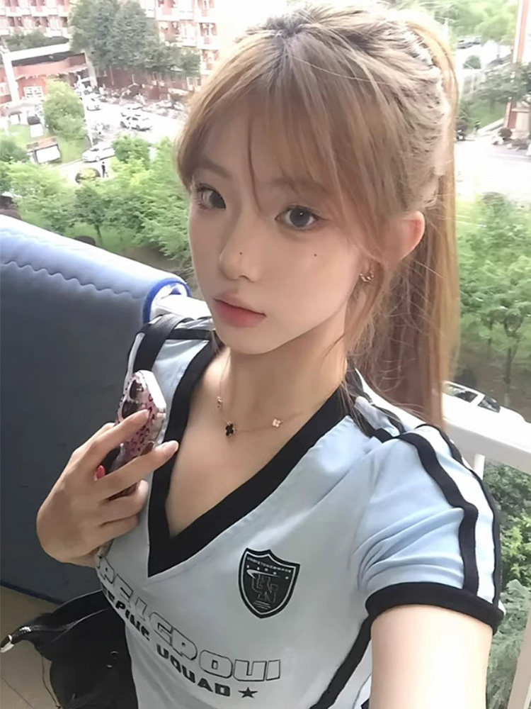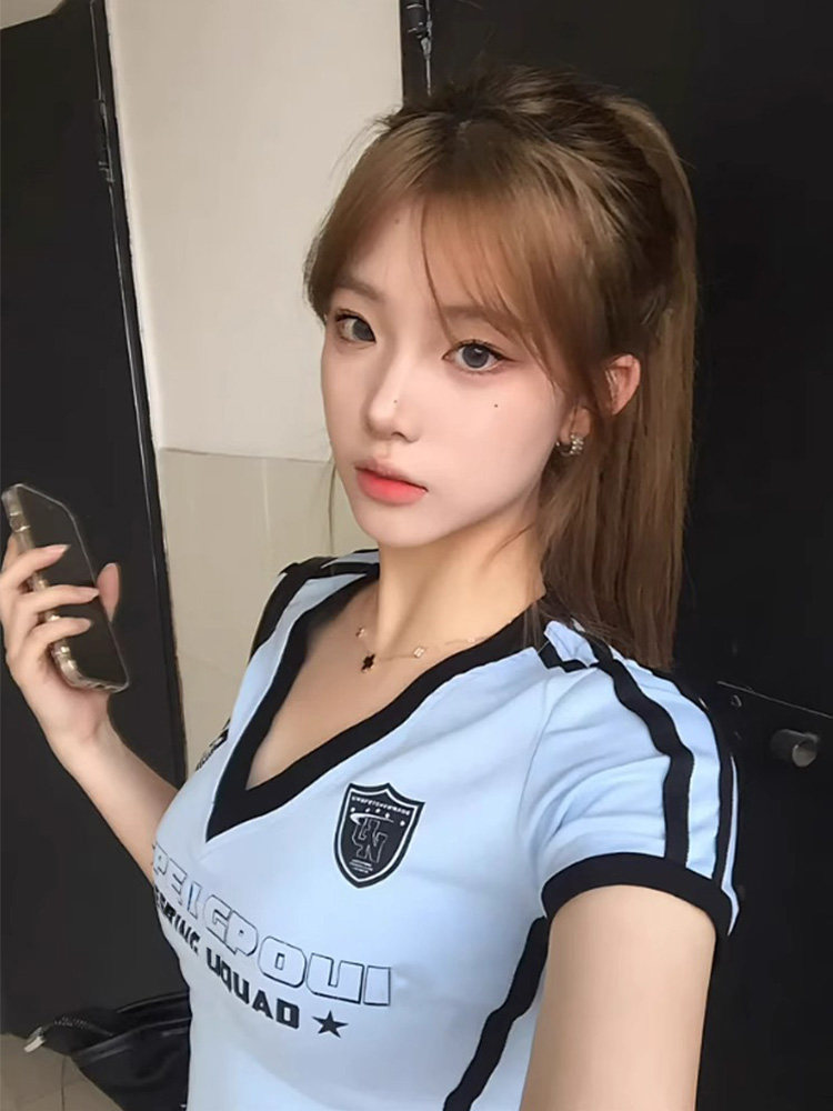 Футбольная форма, летняя футболка, приталенный спортивный короткий корсет, в американском стиле, V-образный вырез