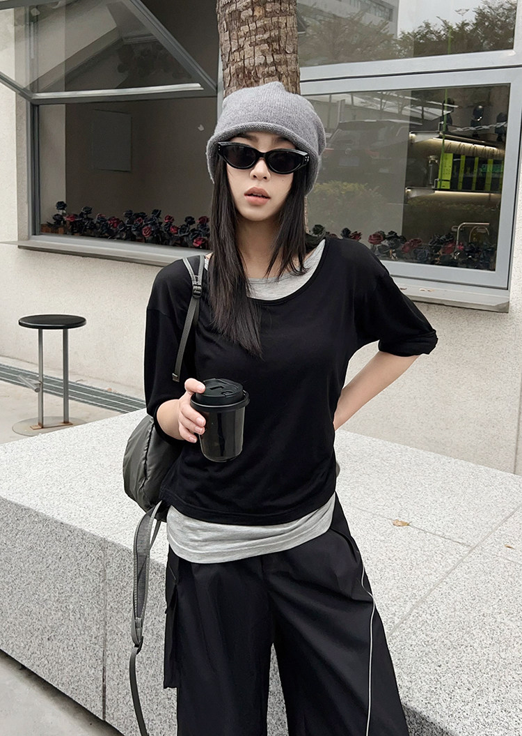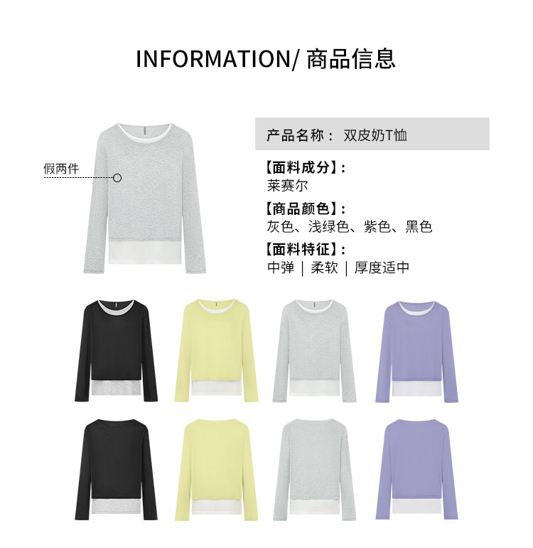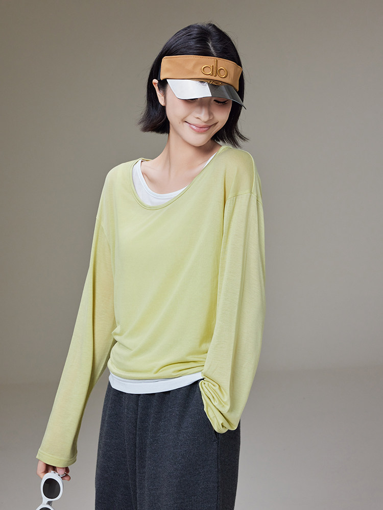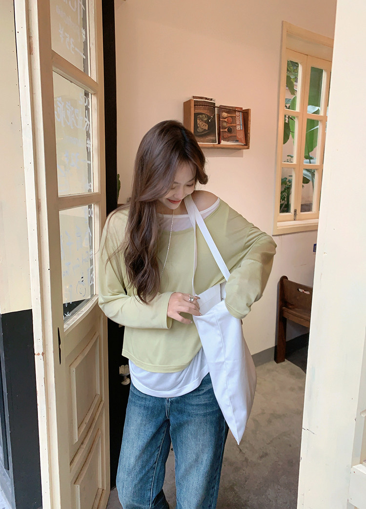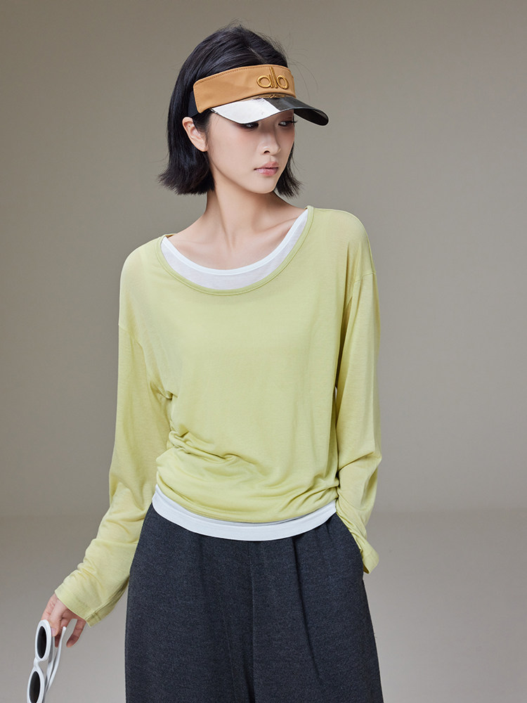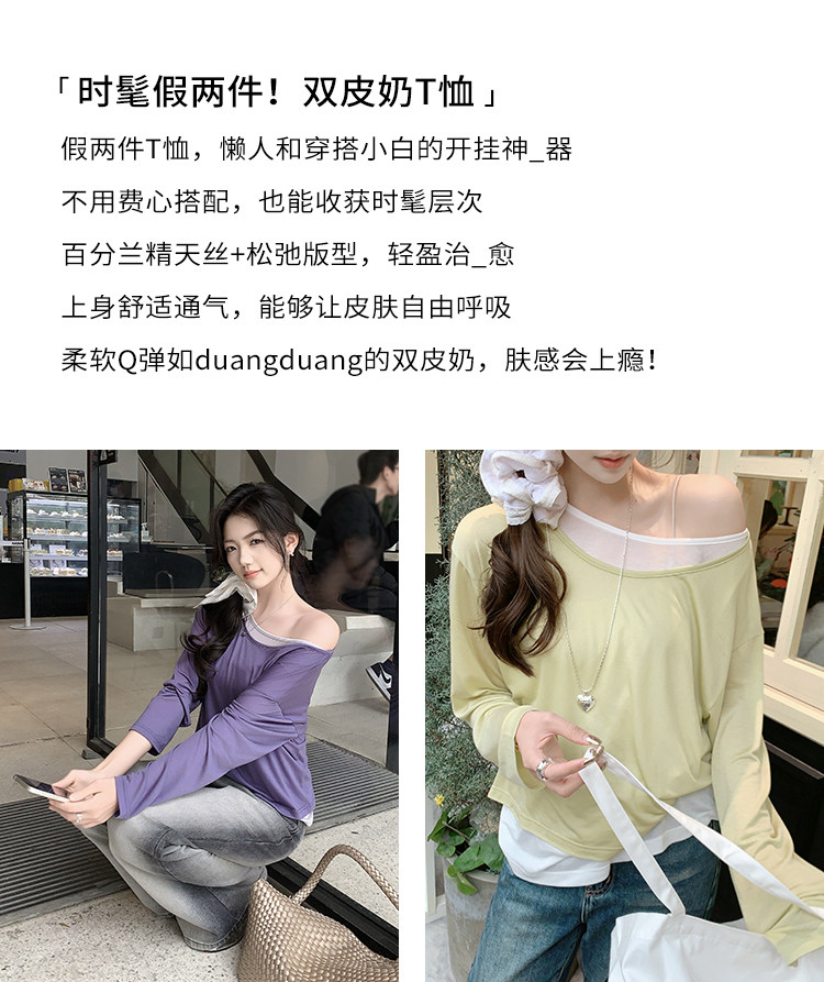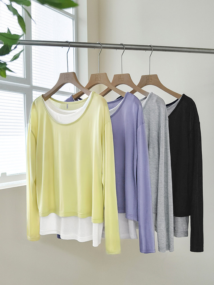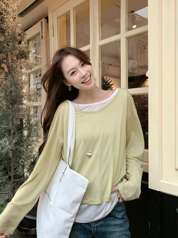 美洋 Meiyang [Spot] Футболка с молоком с двойной кожей Lanjing Tianshi | Контрастные цветные фальшивые двухслойные двойные круглые рукава с длинными рукавами