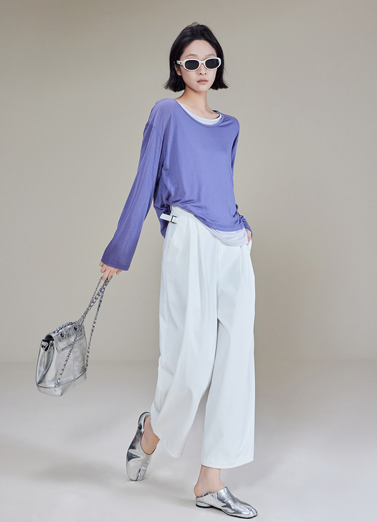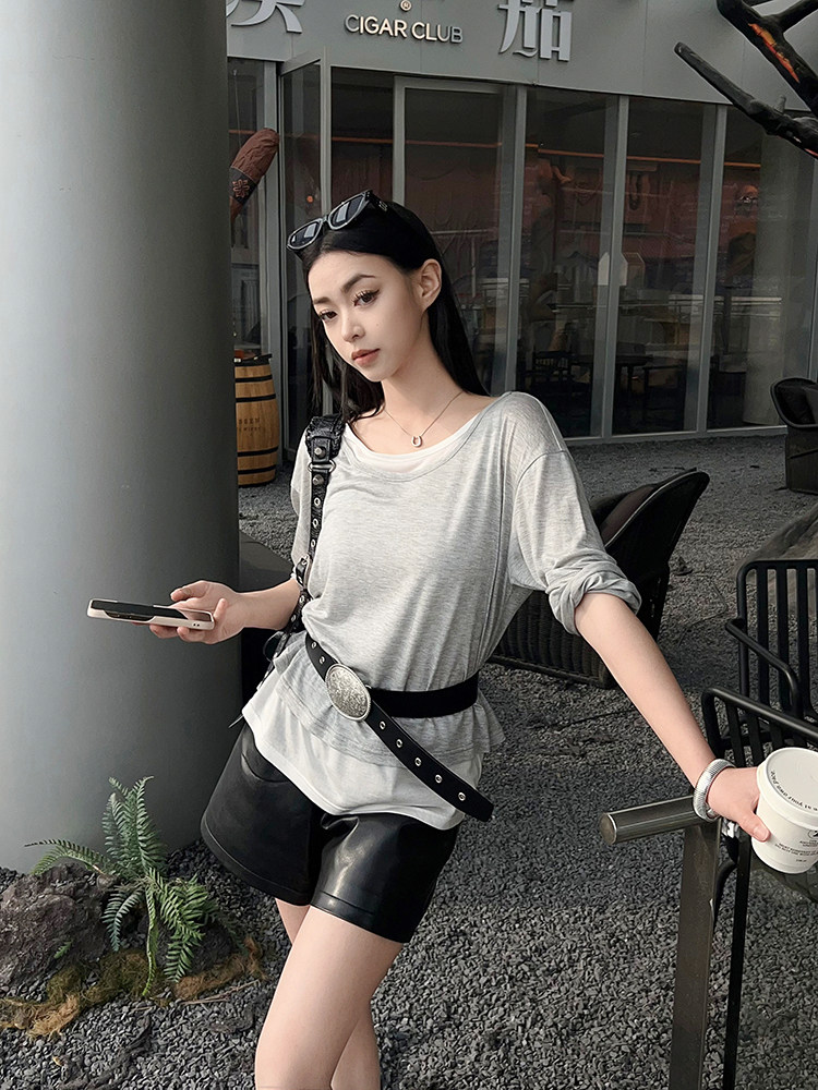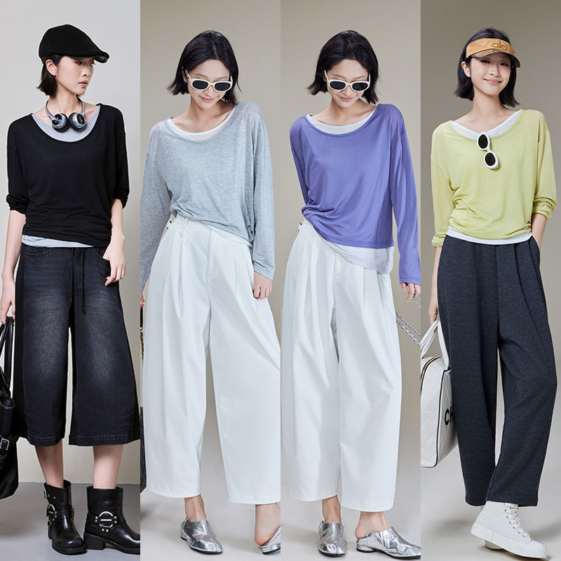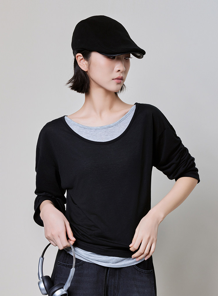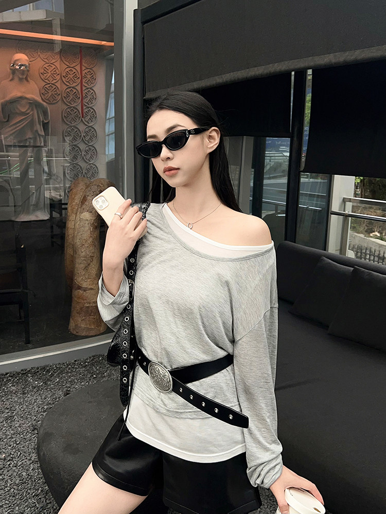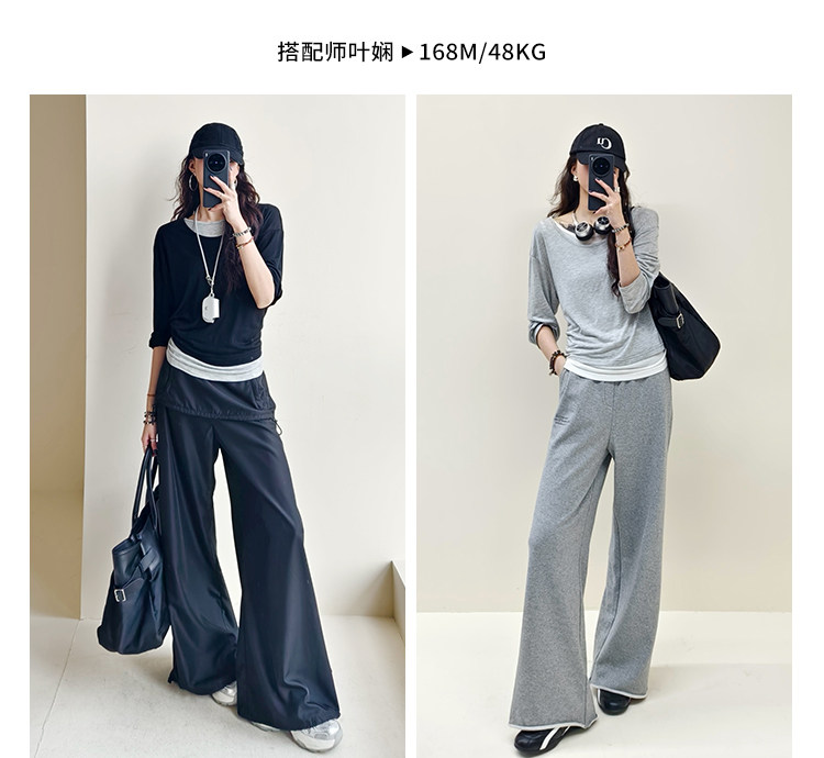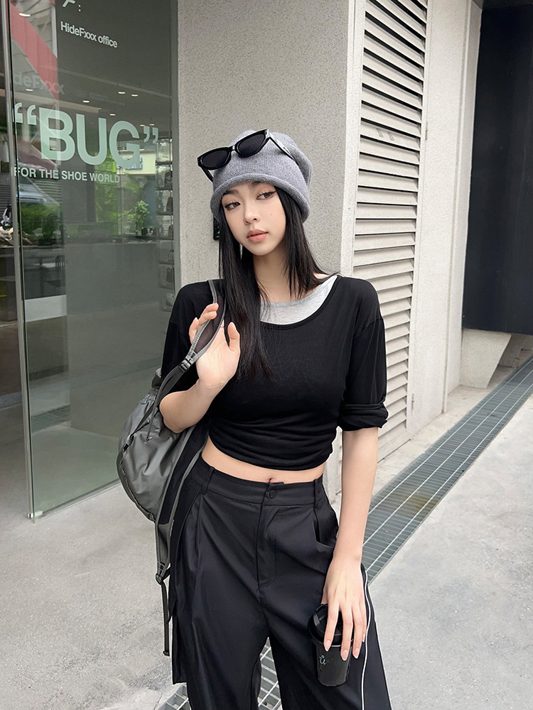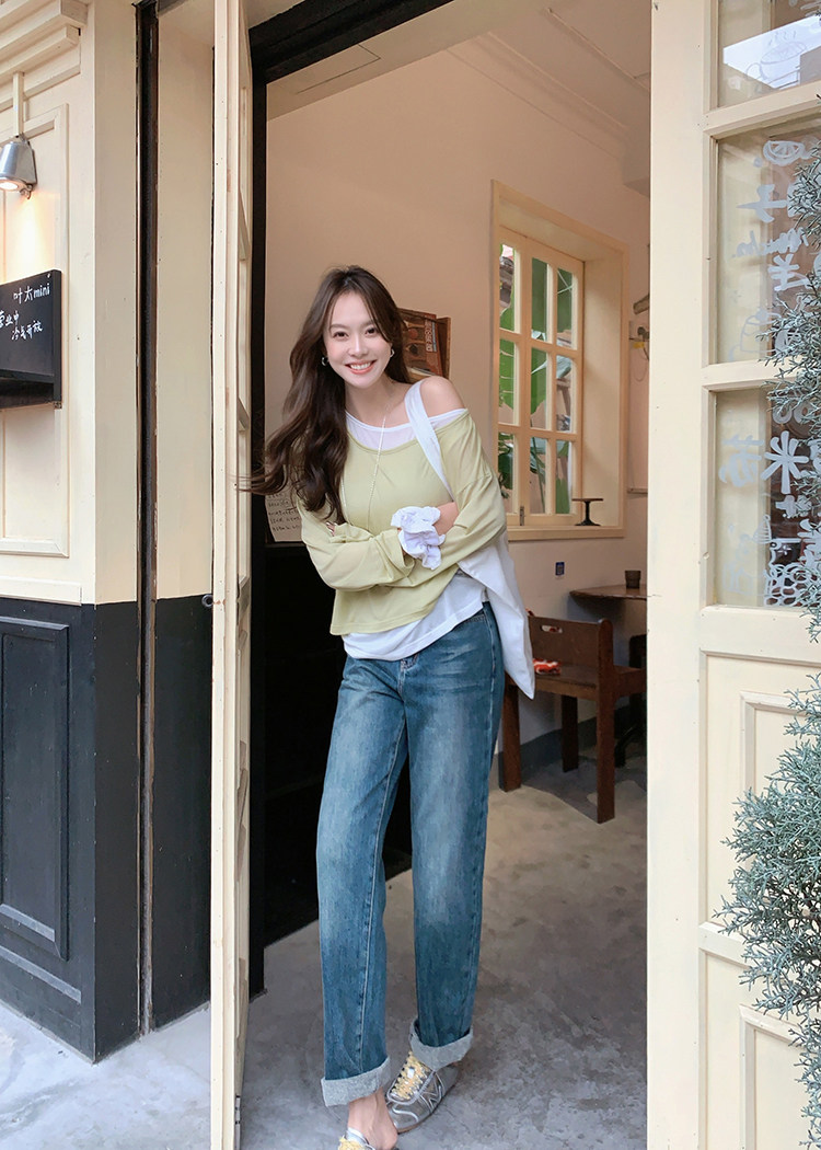 美洋 Meiyang [Spot] Футболка с молоком с двойной кожей Lanjing Tianshi | Контрастные цветные фальшивые двухслойные двойные круглые рукава с длинными рукавами