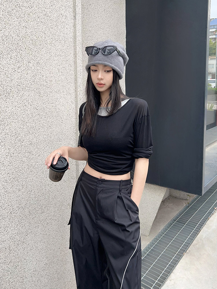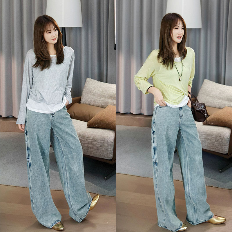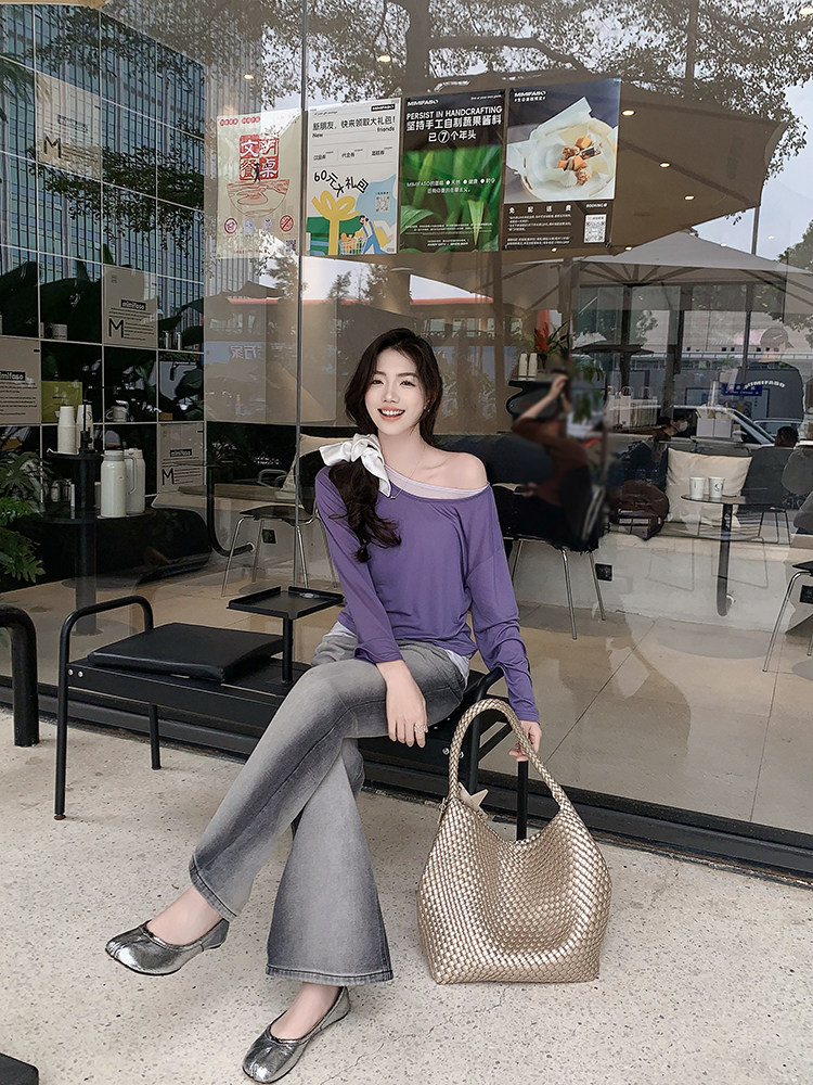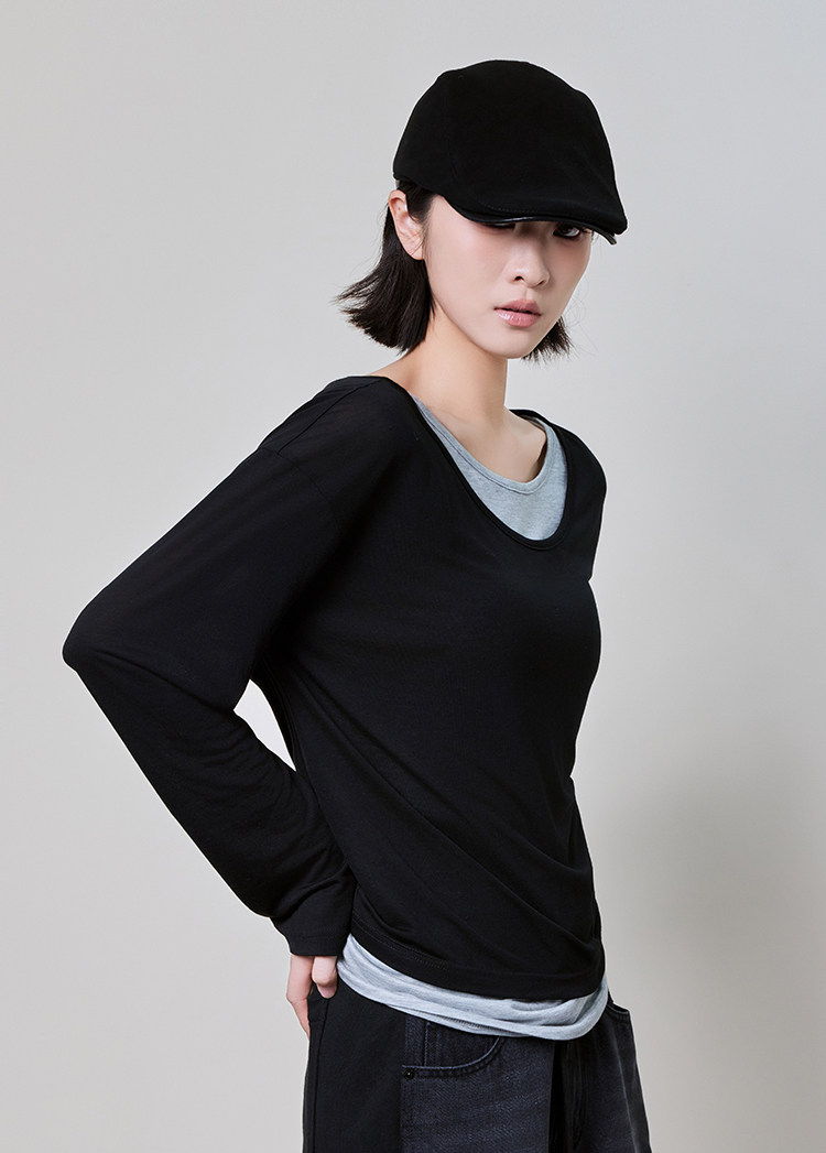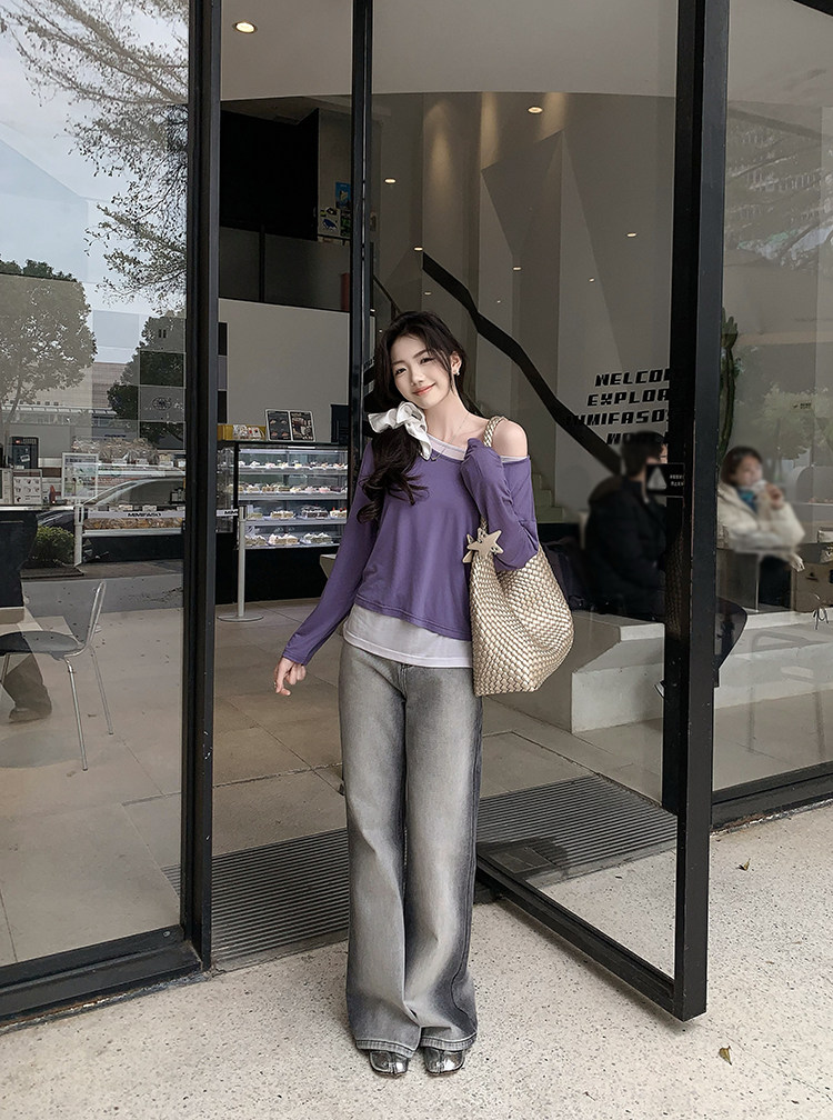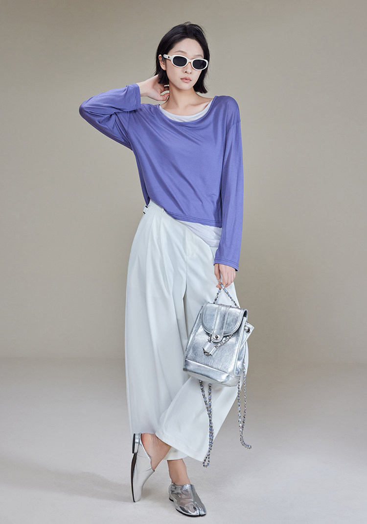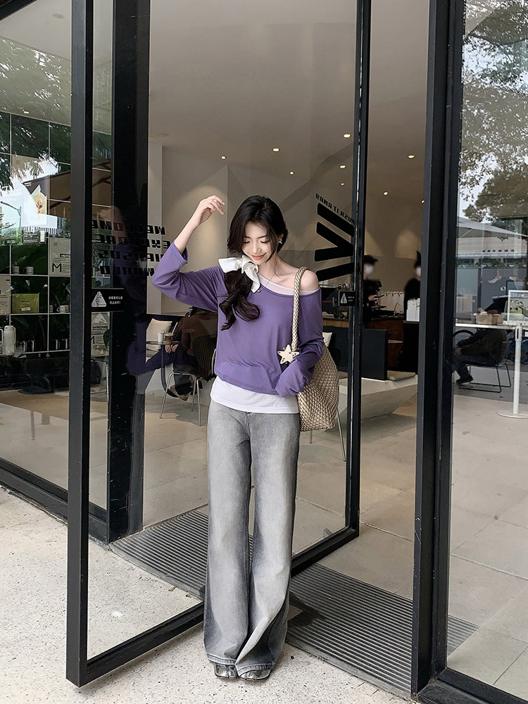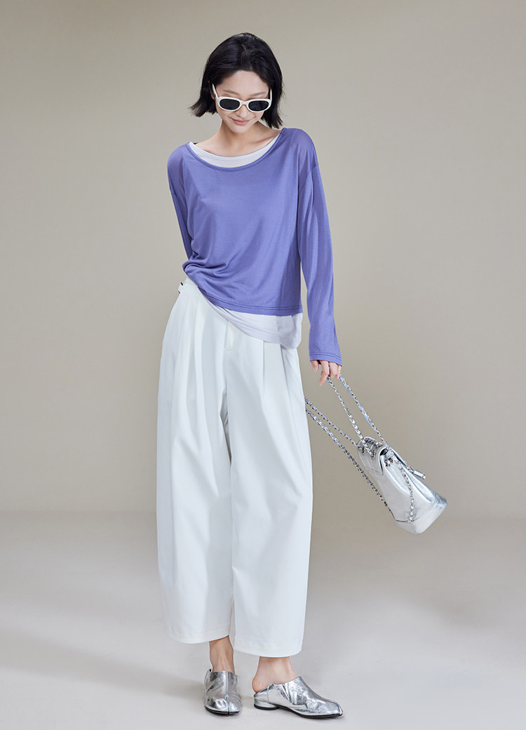 美洋 Meiyang [Spot] Футболка с молоком с двойной кожей Lanjing Tianshi | Контрастные цветные фальшивые двухслойные двойные круглые рукава с длинными рукавами