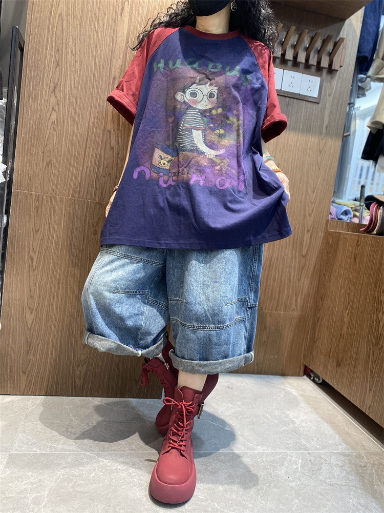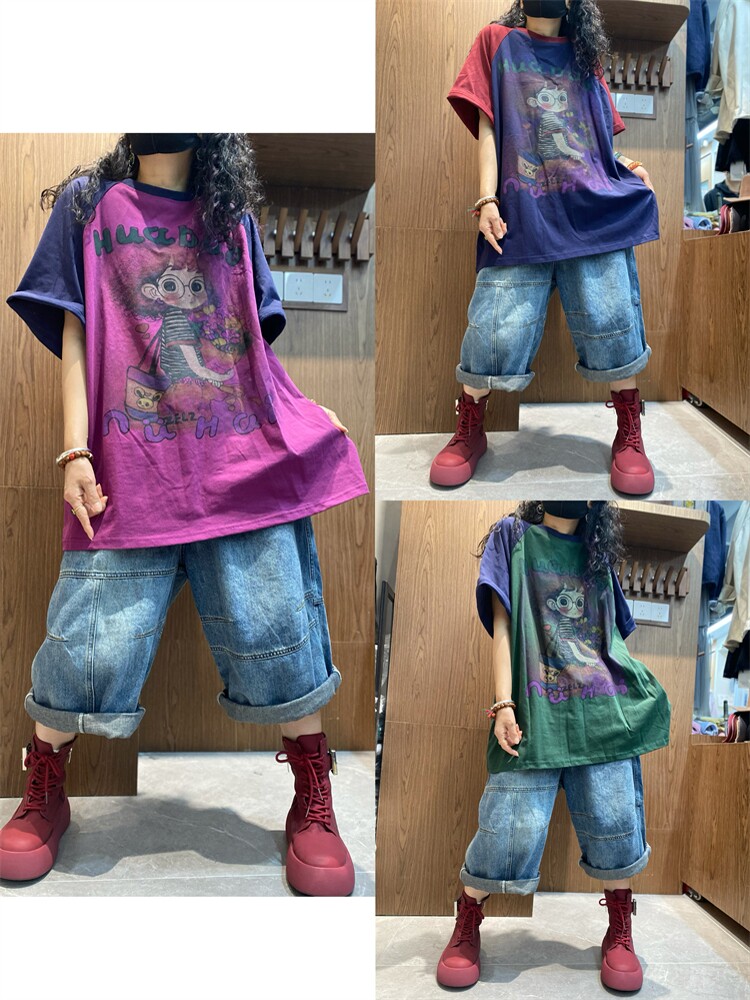 Мультяшная хлопковая весенняя летняя футболка с коротким рукавом для отдыха с круглым воротником, оверсайз, 2025 года