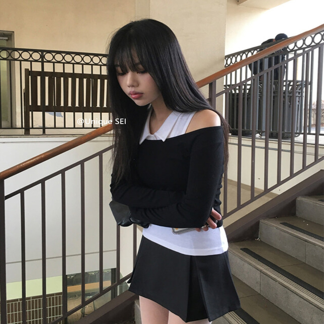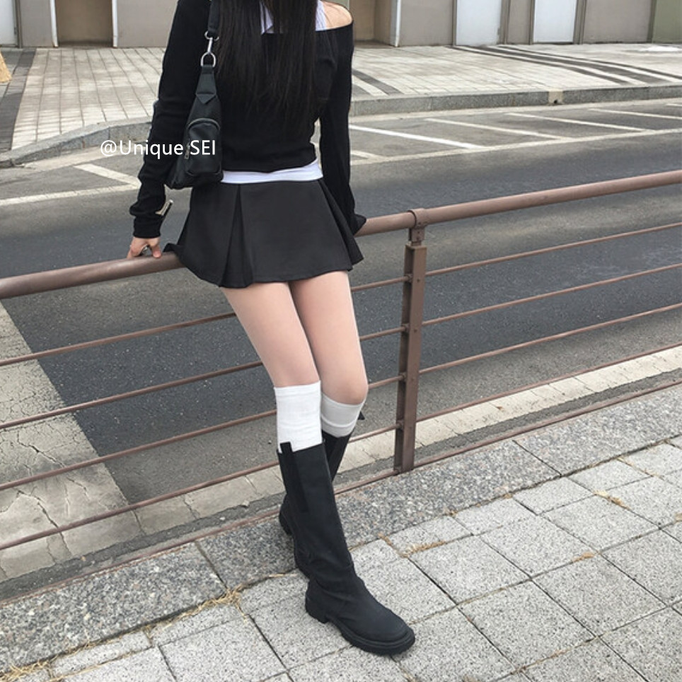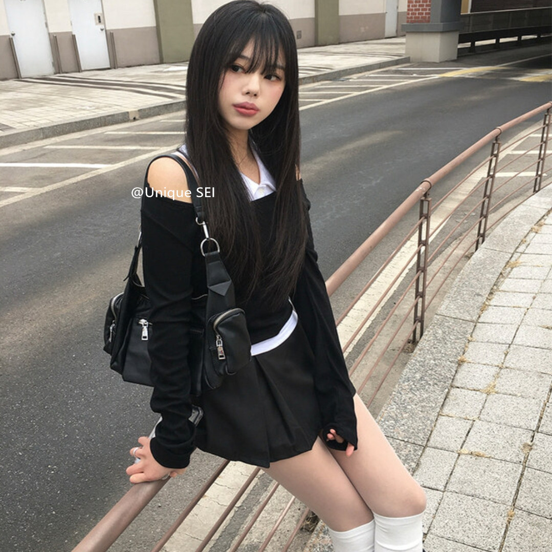Уникальный уличный сладкий и крутой универсальный комплект из двух частей с открытыми плечами, цельный воротник, плиссированная юбка и брюки, комплект из двух частей
